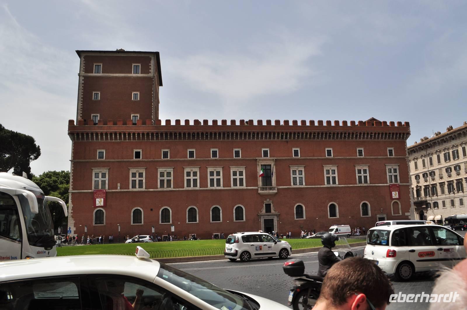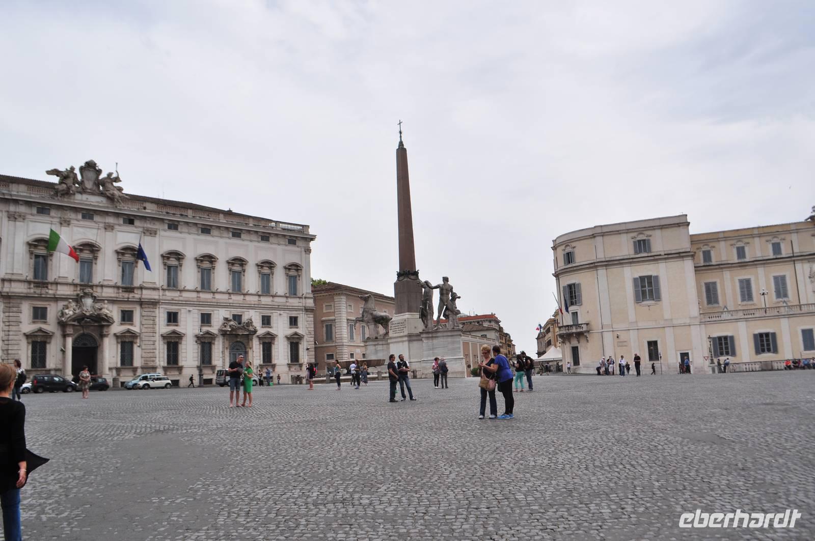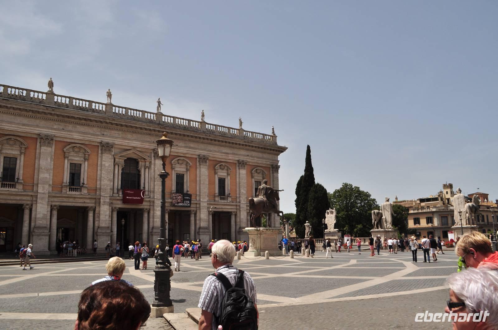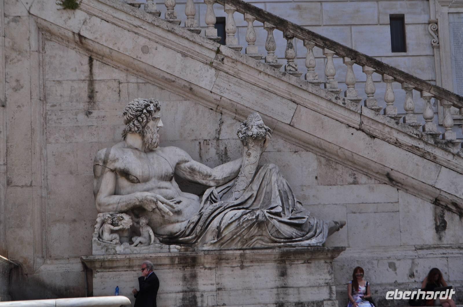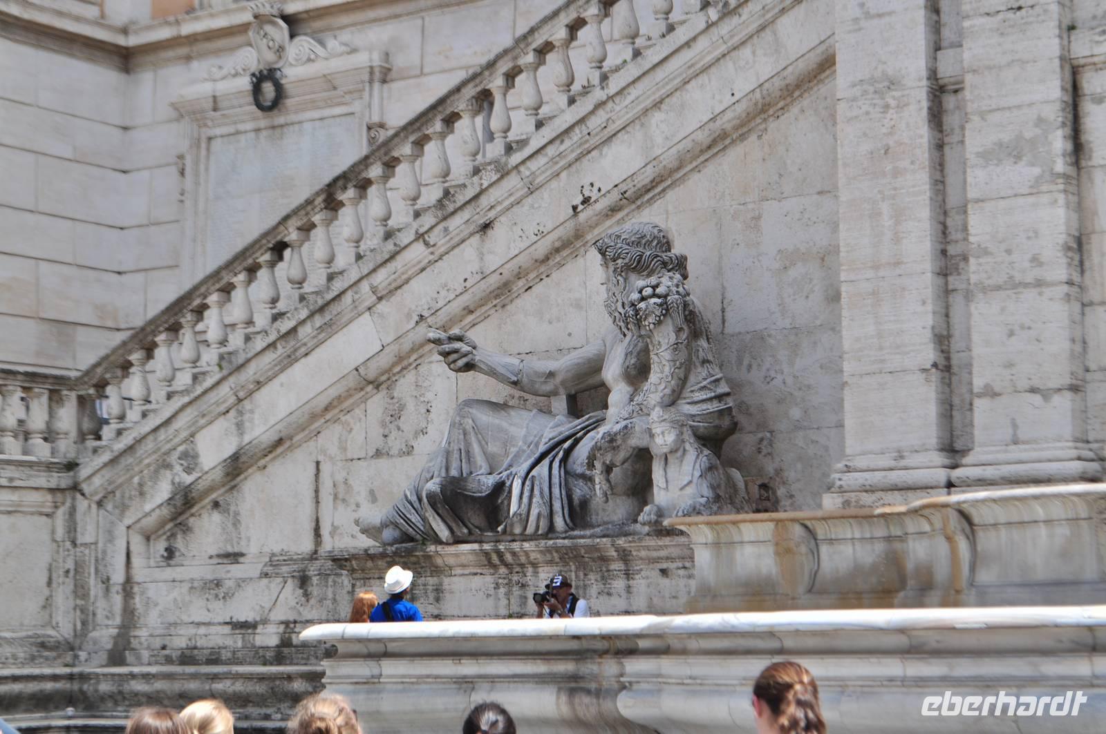 Direkt dahinter liegt das moderne politische Zentrum Roms. Das Kapitol mit Rathaus und Kapitolmuseum. Vor dem Gebäude befindenen sich zwei große Statuen. Der linke personifiziert den Nil (er erhält die Sphinx) fest, der andere ist der Tiber, erkennbar an Romulus und Remus.