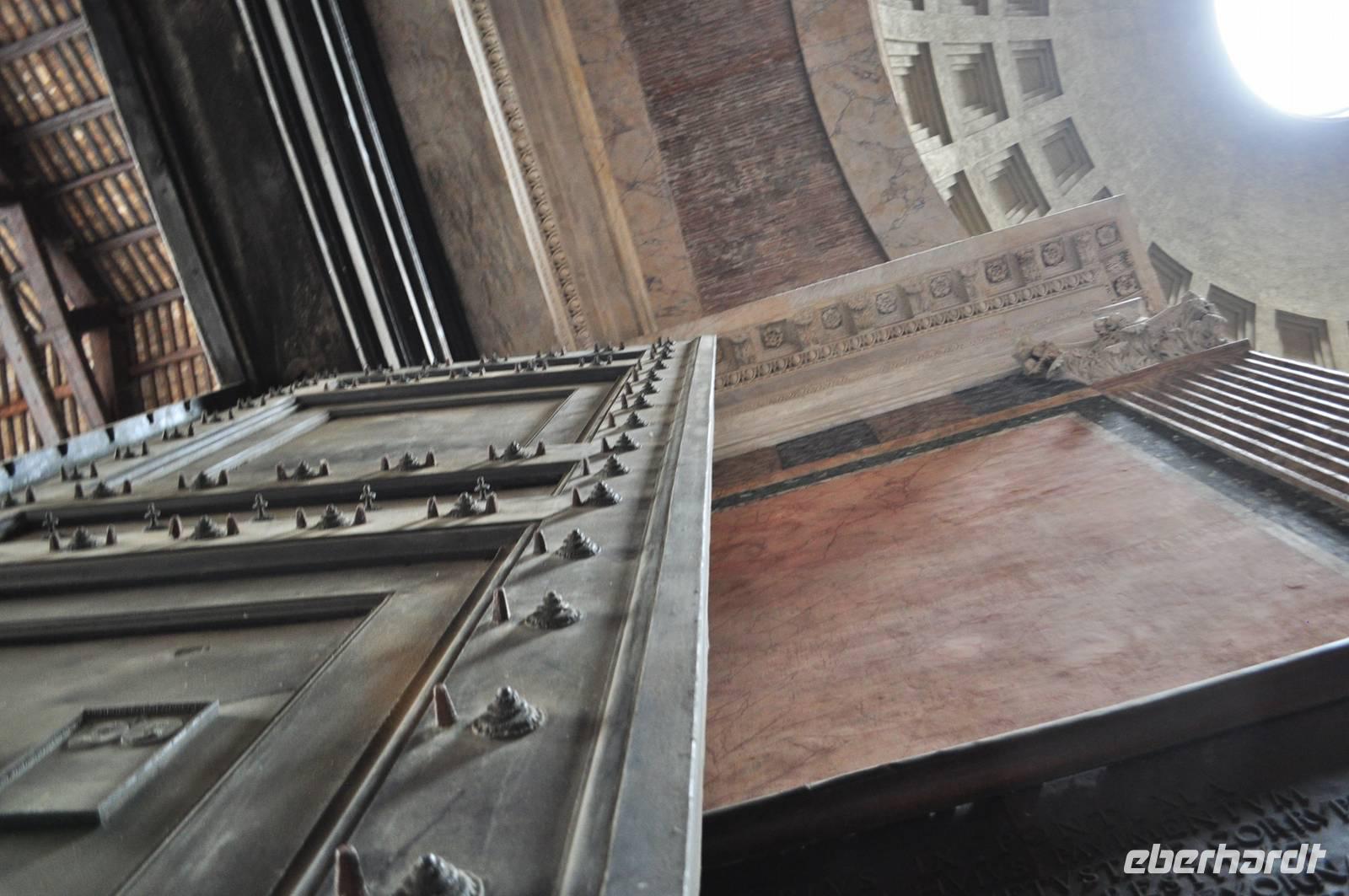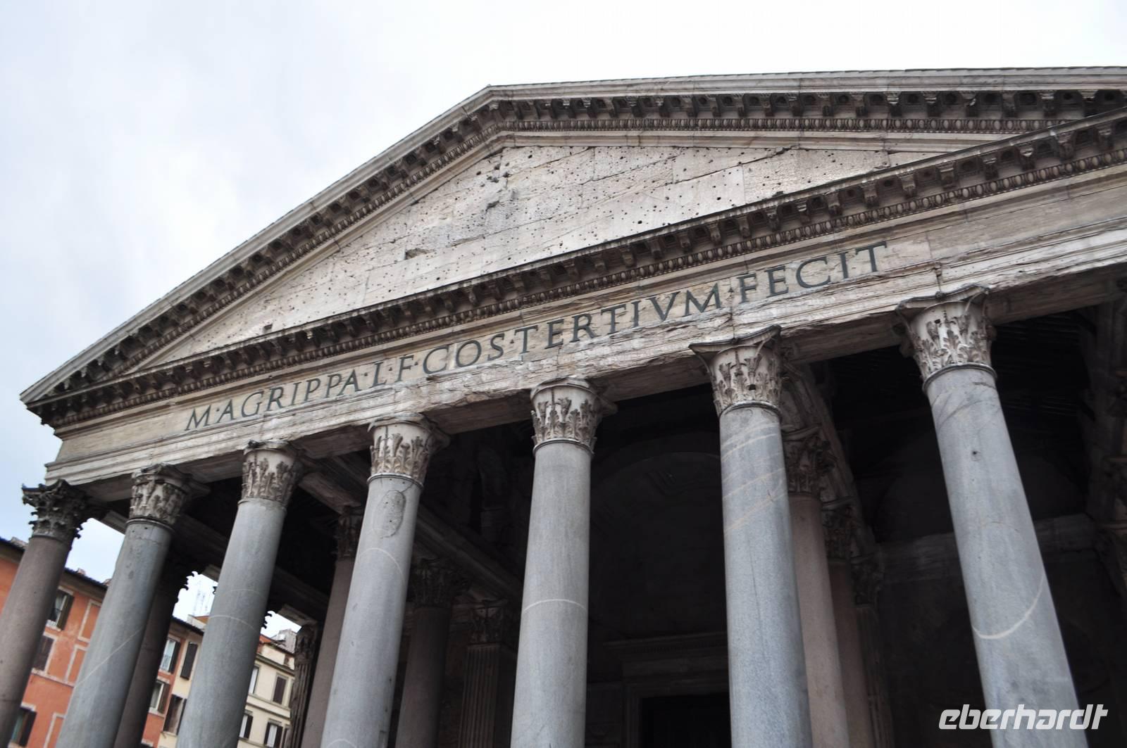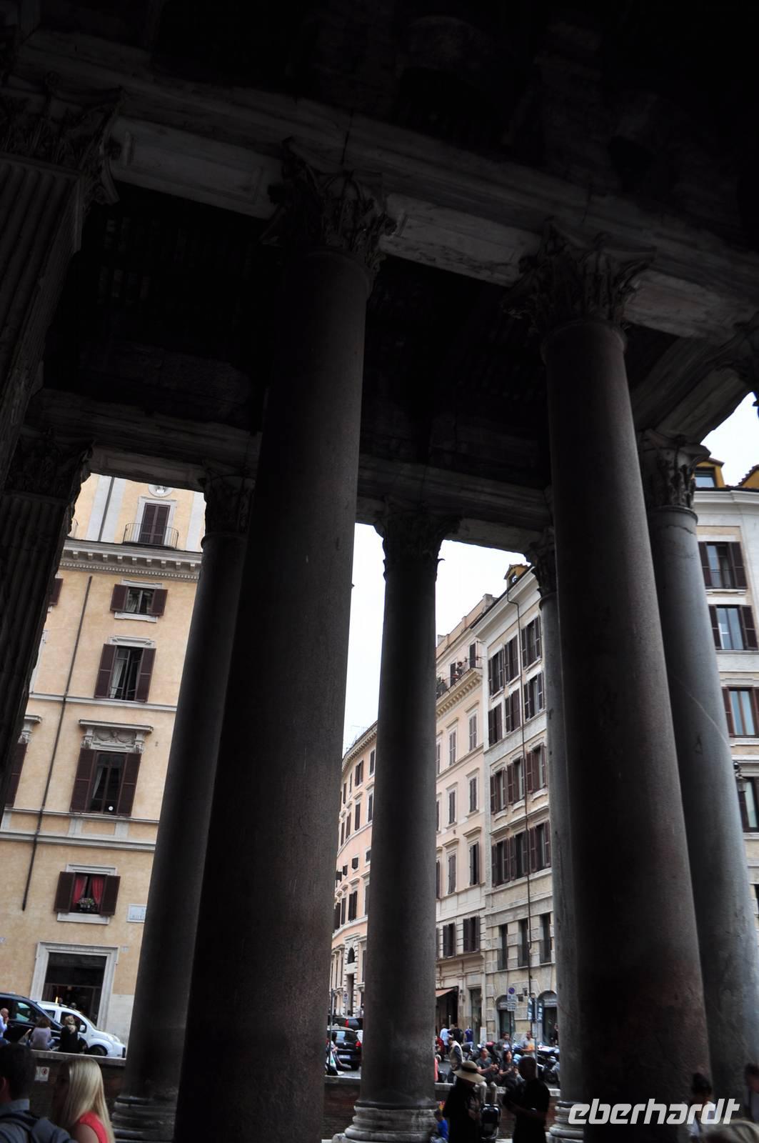 Wie überqueren den Tiber und tauchen ein in das Mittelalter. Durch schmale Gassen erreichen wir die Piazza Navona mit den beeindruckenden Springbrunnen. Durch noch mehr enge Gassen, entlang kleiner Läden kommen wir zu einem weiteren Platz, hier steht das Pantheon. Es ist eines der am besten erhaltenen römischen Bauwerke der Antike. Das Schicksal als Steinbruch und Baumaterialspender zu dienen, blieb dem Pantheon erspart, da es schon früh in eine Kirche umgewandelt wurde und unter päpstlichem Schutz stand. So können wir die beeindruckende römische Architektur samt gigantischer Kuppel und Original Bronze Türen noch heute bestaunen. Licht fällt über ein Loch in der Decke ein. Das einfallende Licht dient gleichzeitig als Sonnenuhr.