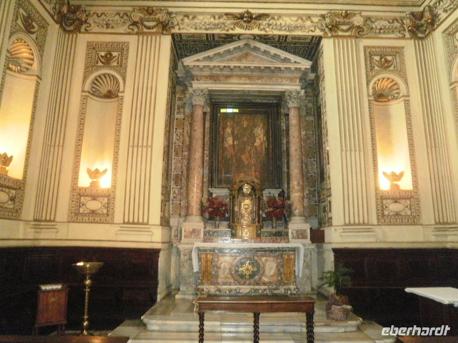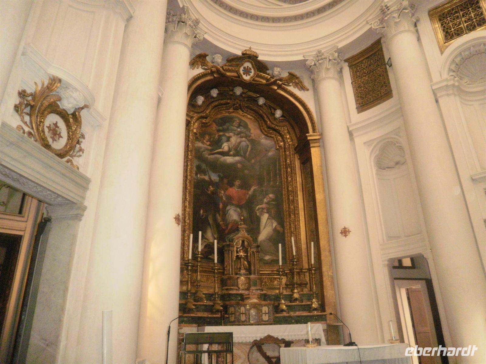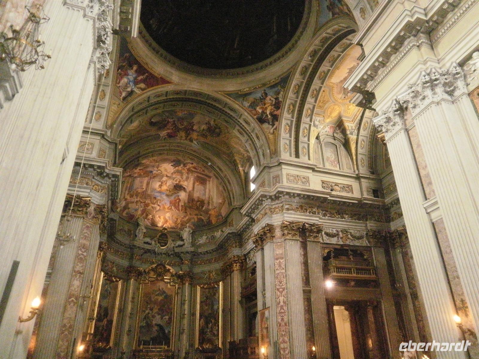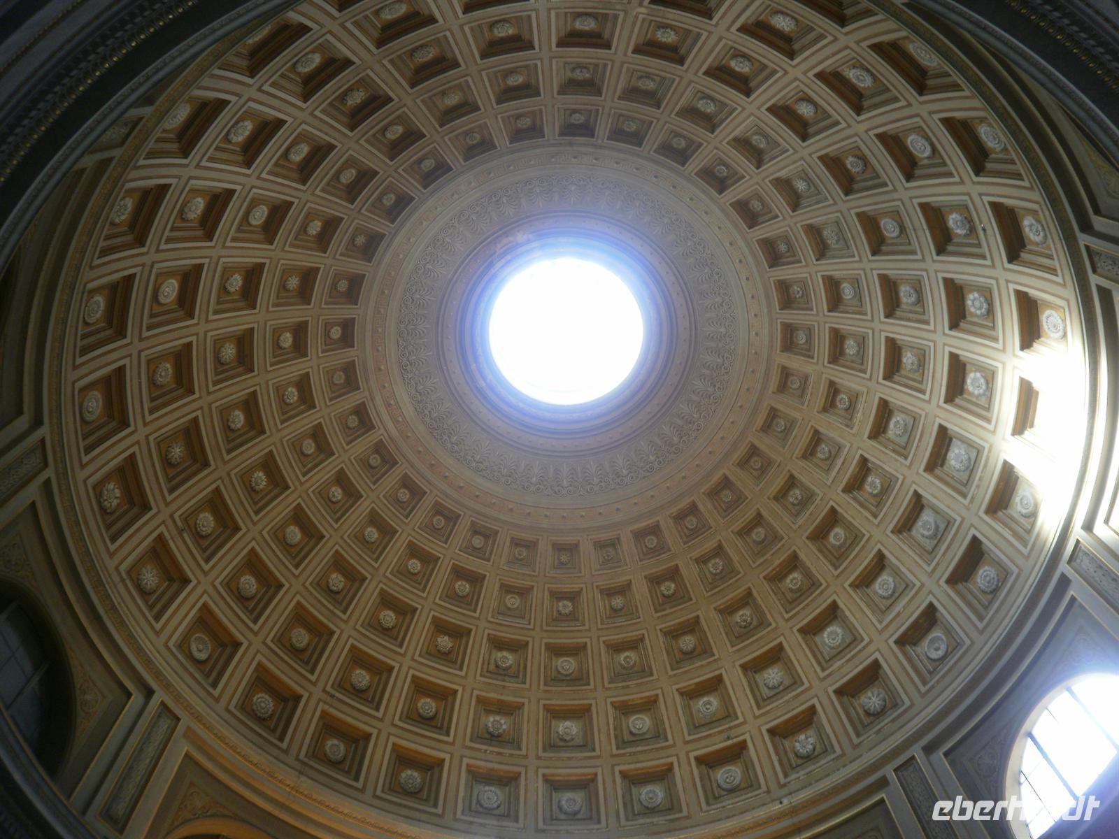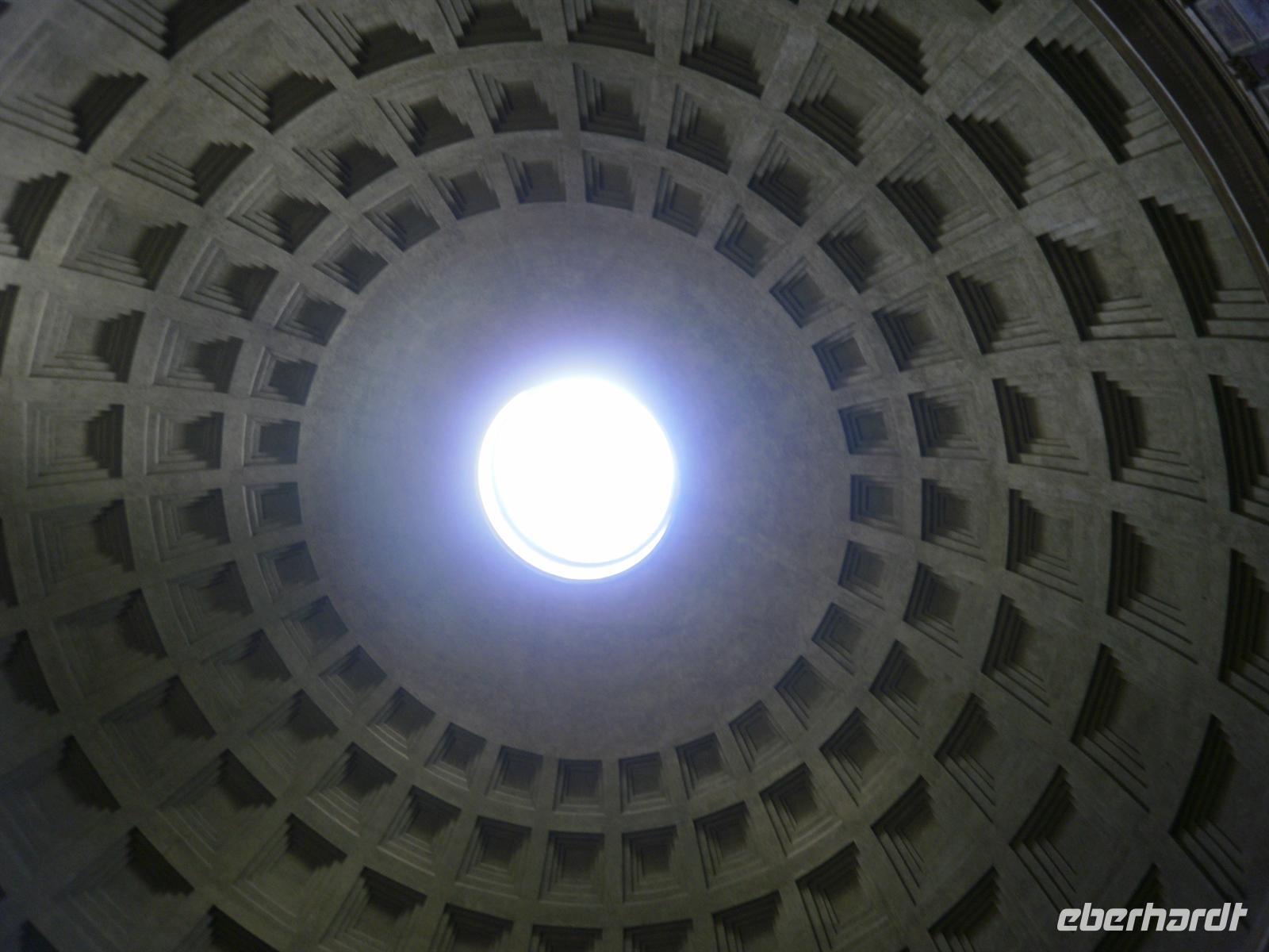 Es war allen Gottheiten gewidmet, auf griechisch bedeutet die "Pantheos" - daher auch der Name Pantheon. Der Durchmesser des Tempels beträgt 43,3 Meter und ist gleich der Entfernung vom Fußboden bis zur Kuppel - dies ist das wahre Wunder des imposanten Baus! Über einer riesigen Holzverschalung in einem einzigen Stück gegossen, ist das Pantheon die größte Kuppel, die je gemauert wurde. Sie ist genau halbkugelförmig und wird von einer zylindrischen 6 Meter tiefen Mauer getragen, die auf der Innenseite von Hohlräumen durchbrochen ist. Zwischen dem einem und dem anderen Hohlraum stehen die am meisten belasteten Teile des Baus. Die oben angebrachte Öffnung ist die einzige Lichtquelle. Das Regenwasser, das ins Innere fällt, fließt durch die Löcher in der Mitte des Fußbodens ab.