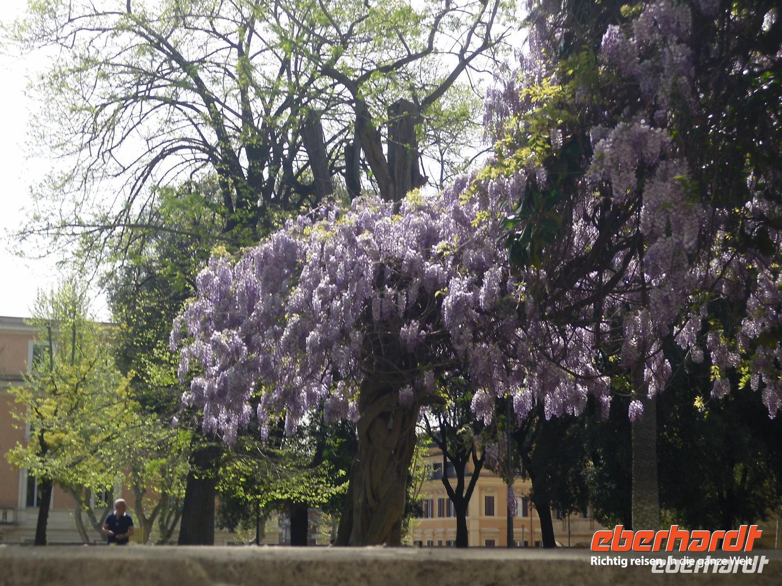 Nach einem guten Frühstück geht heute Morgen unsere Fahrt zum Gardasee, wir fahren über Riva del Garda und gönnen uns in Garda einen Aufenthalt. Weiter geht unsere Fahrt über die Autobahn in Richtung Süden. Vorbei an Verona, überqueren wir später den Po, lassen Modena und Bologna vorüber ziehen. Bei herrlichem Reisewetter und guter Unterhaltung im Bus verfliegt die Zeit wie im Flug. Florenz müssen wir heute links liegen lassen, wir wollen ja nach Rom. Auch das Flair der Toskana können wir während der Fahrt genießen. Nach einer kleinen Einführung in die italienische Sprache und den nützlichen Tipps für den Aufenthalt in Rom, erreichen wir gegen fünf unser Hotel Palazzo Carpegna. Ein schöner Park umgibt das große Hotel und wir sind froh, dass die belebte Straße durch eine Allee vom Hotel getrennt ist. Zum Abendessen treffen wir uns im grandiosen Speisesaal. Voller Erwartung auf die Stadt Rom begeben wir uns auf die Zimmer.