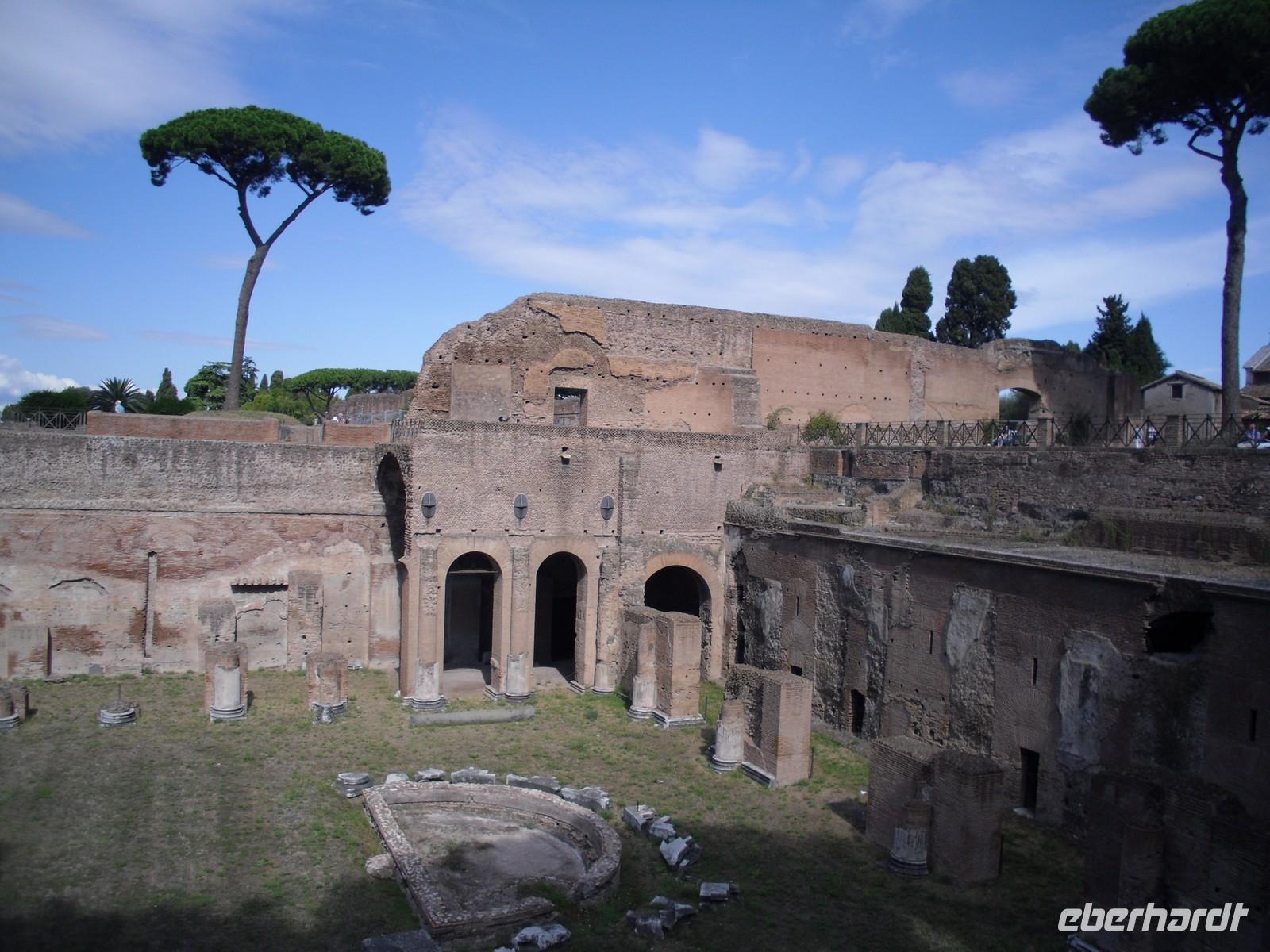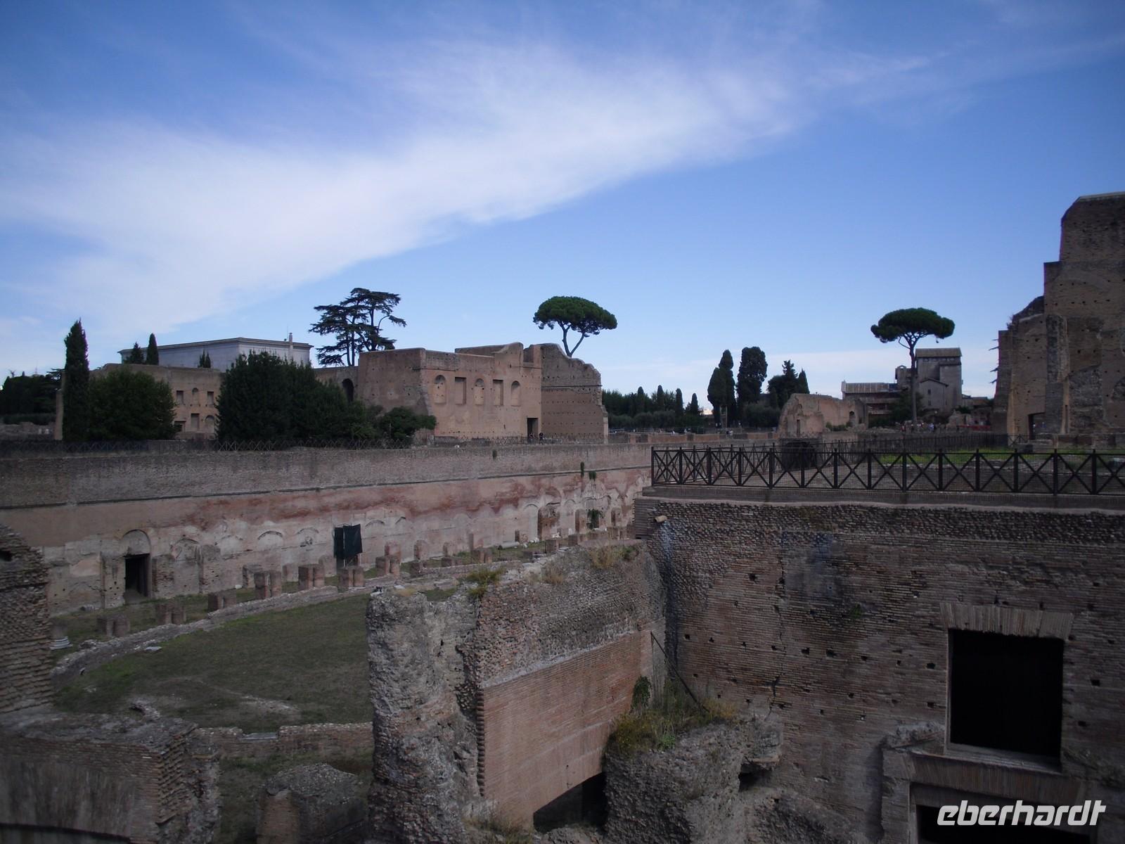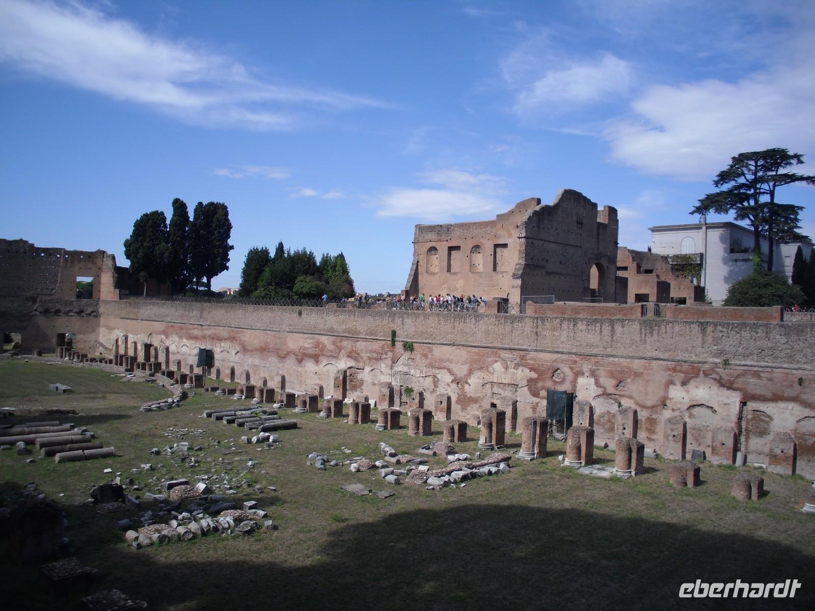 Das Kolosseum wurde von Kaiser Titus im Jahre 80 n. Chr. eingeweiht. Die Bauarbeiten dauerten acht Jahre. Die Spiele im Amphietheater umfassten vor allem Gladiatorenkämpfe und Kämpfe zwischen Gladiatoren und Tieren. Nach der Innenbesichtigung des Kolosseums geht es hinauf zum Palatino, einem der sieben Hügel des antiken Roms. Der Palatinhügel war während der Zeit der Republik nur ein Wohnviertel für Prominente, Cicero, Marcus-Antonius, Marcus Agrippa und selbstverständlich Octavianus, den zukünftigen Augustus-Caesar. Während der Zeit der Kaiser wurde der Hügel mit riesigen Palästen ausgestattet. Vom Palatinhügel aus bietet sich für uns der Blick auf den Circus Maximus. Dies ist eine riesige Anlage zwischen den Abhängen der Hügel Palatin und Aventin. Er diente vor allem den Wagenrennen.