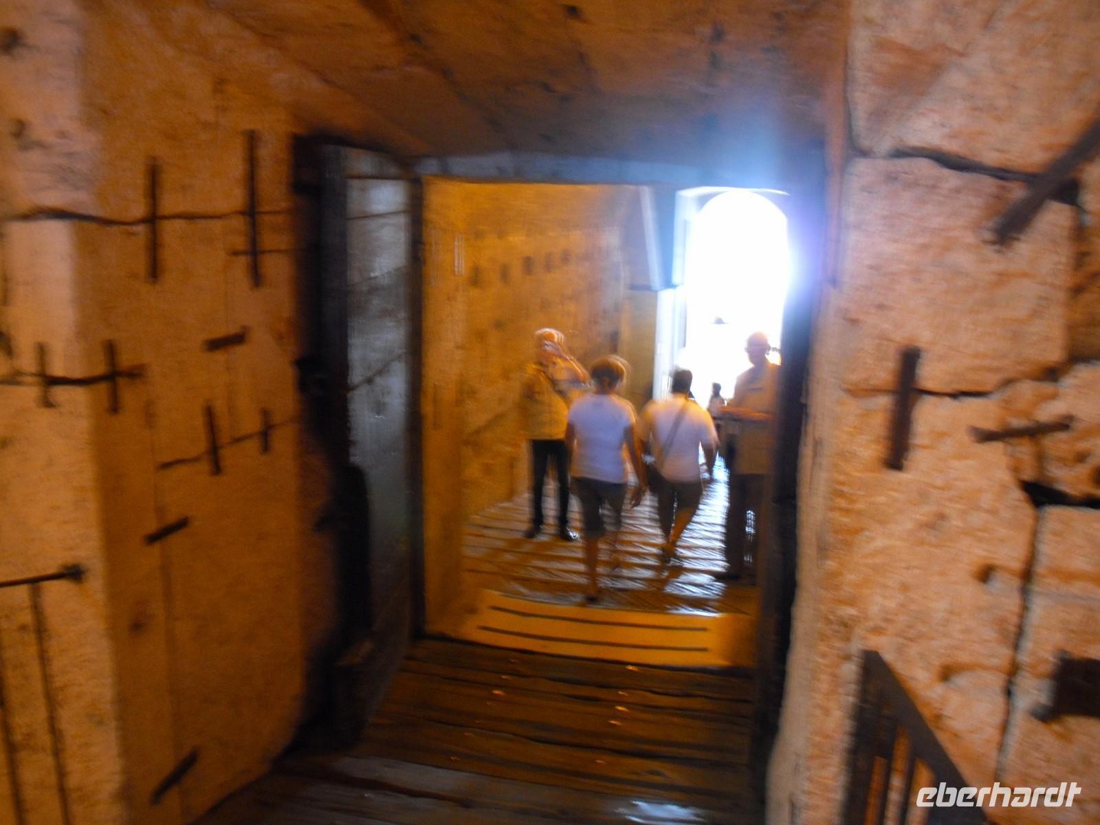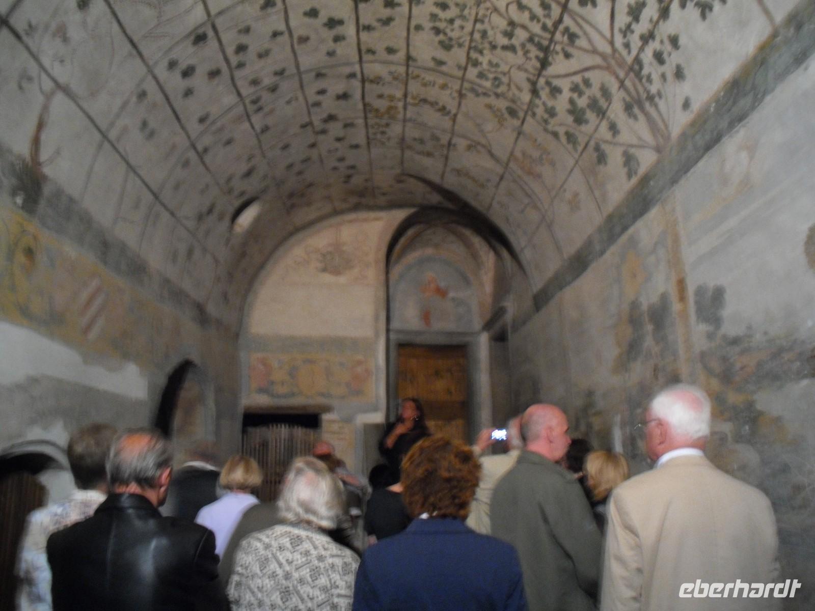 Diese mittelalterliche Burg liegt unweit von Rovereto oberhalb des Etschtales. Schon die Auffahrt mit dem Bus ist fantastisch, da wir immer wieder schöne Blicke auf das Tal und die Stadt Rovereto haben. Wir werden mit einem Glas Wein begrüßt und erleben eine kleine Burgführung, bevor es schließlich zum Abendessen geht. Für uns ist ein wunderbares Buffet mit italienischen Spezialitäten vorbereitet - unter anderem Antipasti, das sind eingelegte Kleinigkeiten in Olivenöl. Für jeden Geschmack ist etwas dabei. Nach diesem reichhaltigen Buffet können wir anschließend das Tanzbein schwingen und es herrscht eine ausgelassene Stimmung. Zum Schluss erklingt als Abschluß ganz passend: "Arrivederci Roma" - da bekommen dann einige von uns eine Gänsehaut! Gut gelaunt fahren wir am späten Abend ins Hotel zurück.
