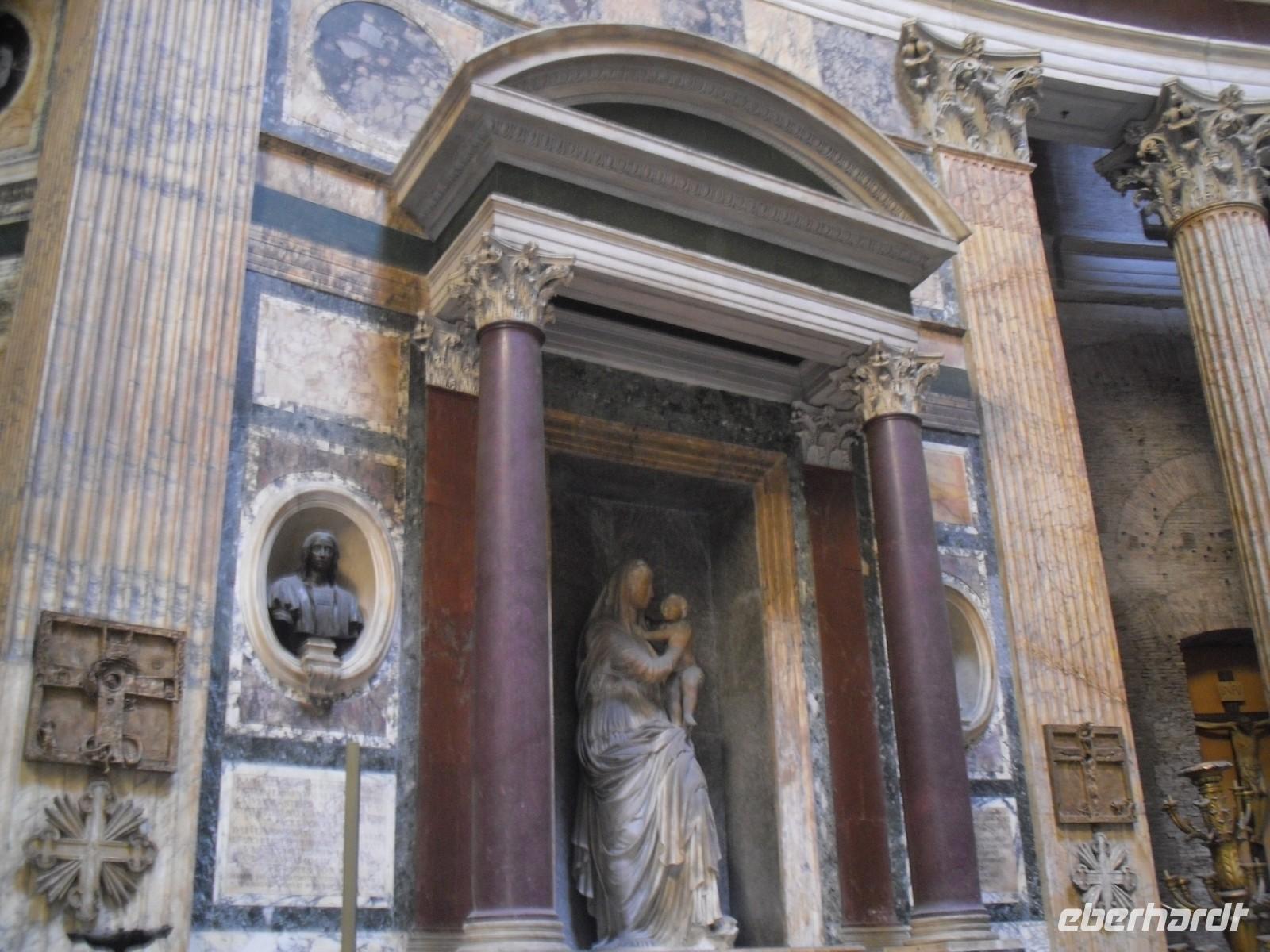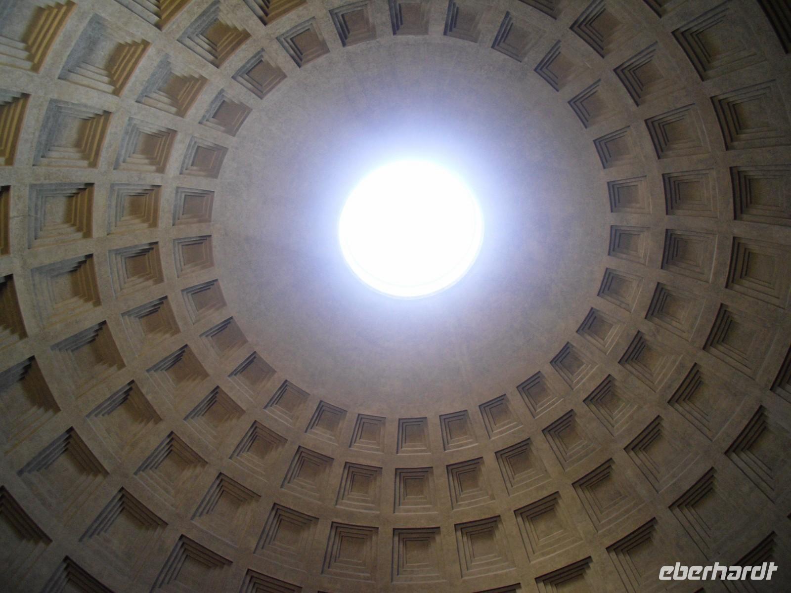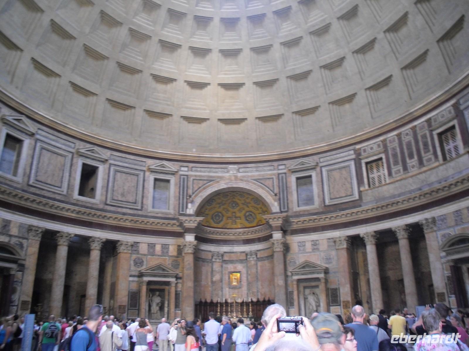 Weiter geht es nach einer kleinen Mittagspause zum Pantheon. Der ursprüngliche Bau des Pantheon, dessen Reste unter der Vorhalle entdeckt wurden, geht auf das Jahr 27 v. Chr. zurück und war das Werk des Agrippa. Das heutige Gebäude stammt aus der Zeit Hadrians und wurde im 2. Jahrhundert nach Christus gebaut. Es war allen Gottheiten gewidmet, auf griechisch bedeutet die "Pantheos" - daher auch der Name Pantheon. Der Durchmesser des Tempels beträgt 43,3 Meter und ist gleich der Entfernung vom Fußboden bis zur Kuppel - dies ist das wahre Wunder des imposanten Baus! Über einer riesigen Holzverschalung in einem einzigen Stück gegossen, ist das Pantheon die größte Kuppel, die je gemauert wurde. Sie ist genau halbkugelförmig und wird von einer zylindrischen 6 Meter tiefen Mauer getragen, die auf der Innenseite von Hohlräumen durchbrochen ist. Zwischen dem einem und dem anderen Hohlraum stehen die am meisten belasteten Teile des Baus. Die oben angebrachte Öffnung ist die einzige Lichtquelle. Das Regenwasser, das ins Innere fällt, fließt durch die Löcher in der Mitte des Fußbodens ab. Unser offizielles Besuchsprogramm in Rom endet an der Spanischen Treppe.