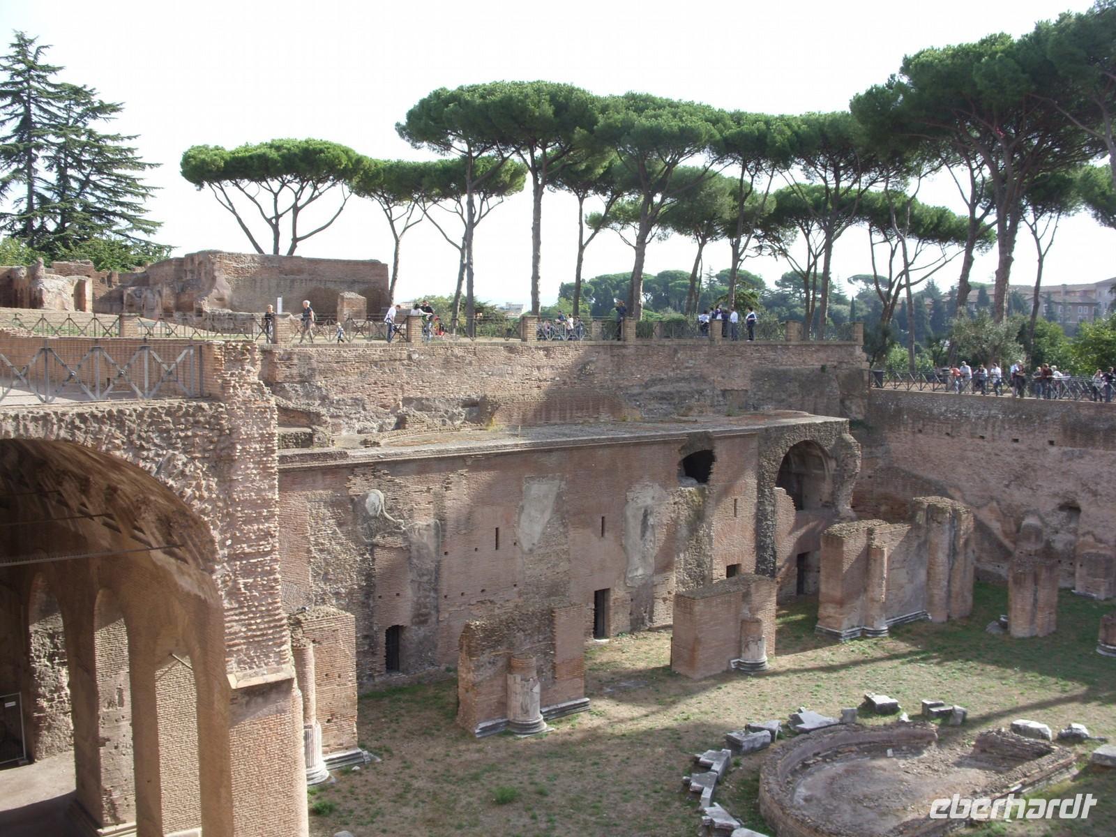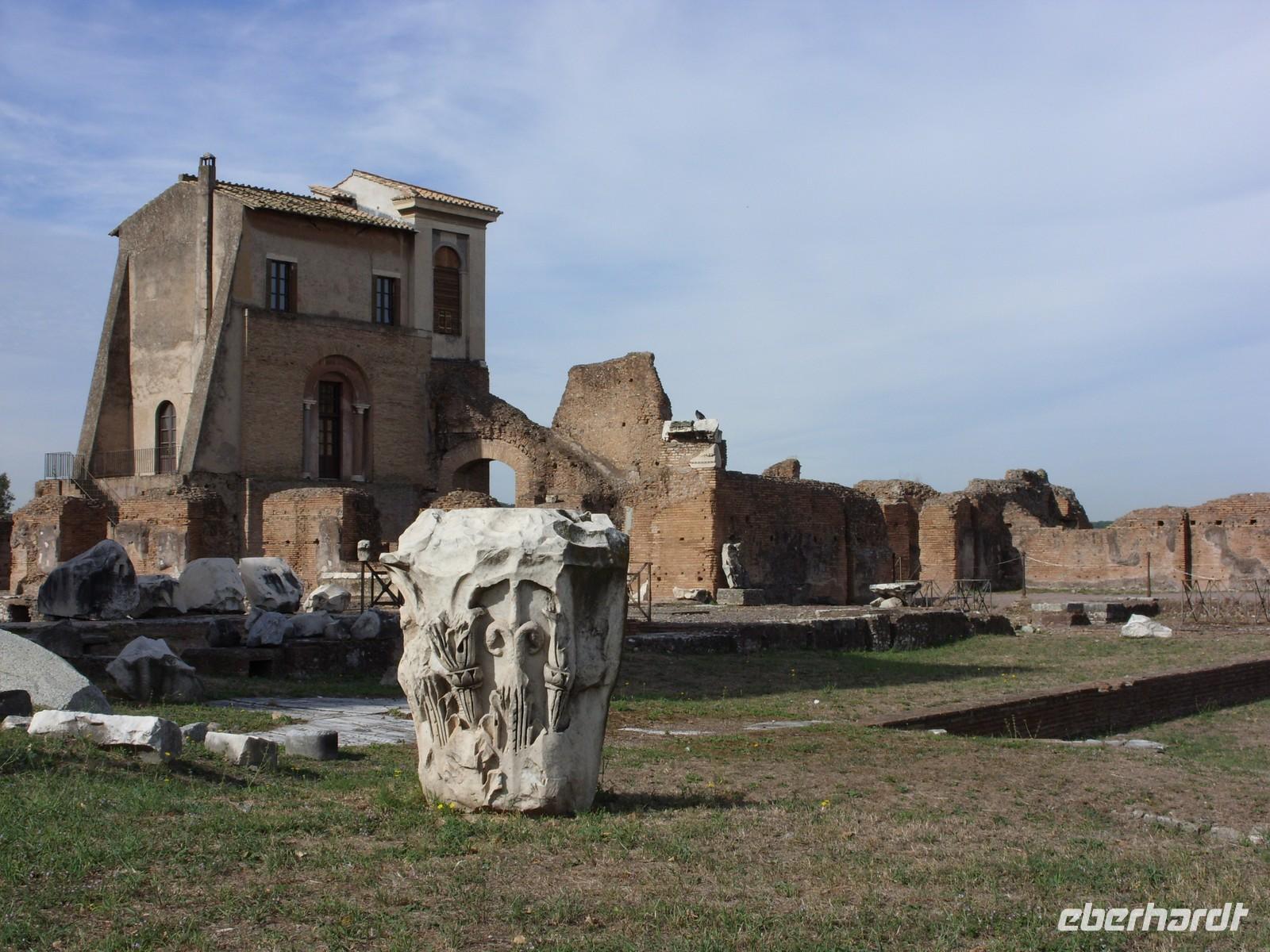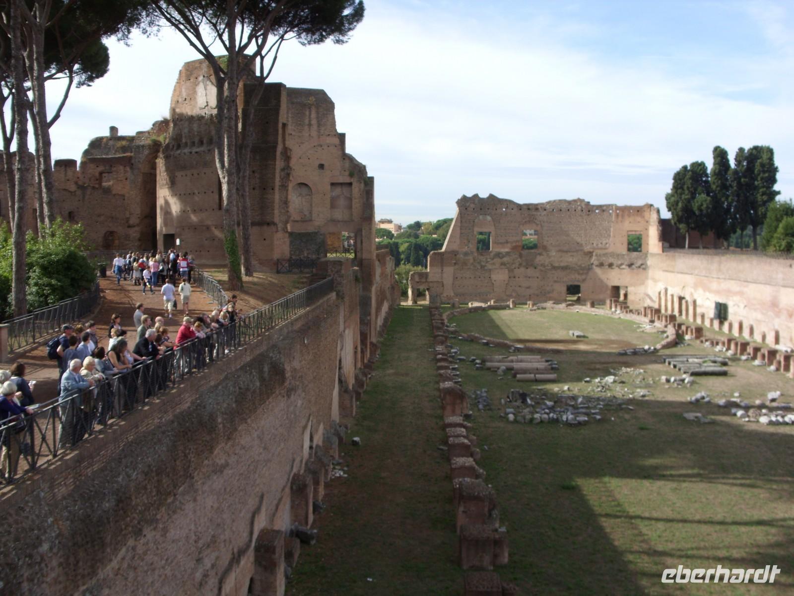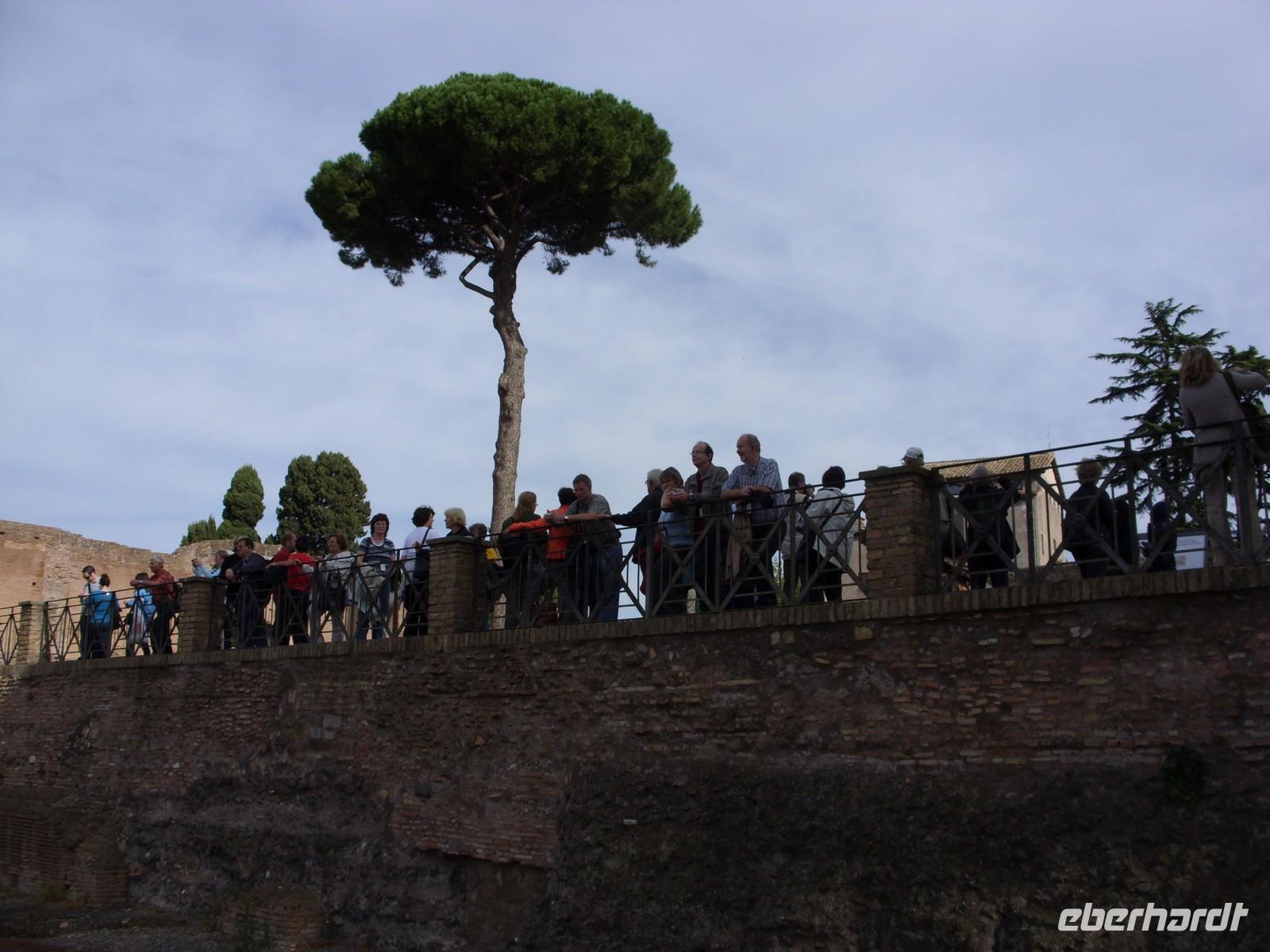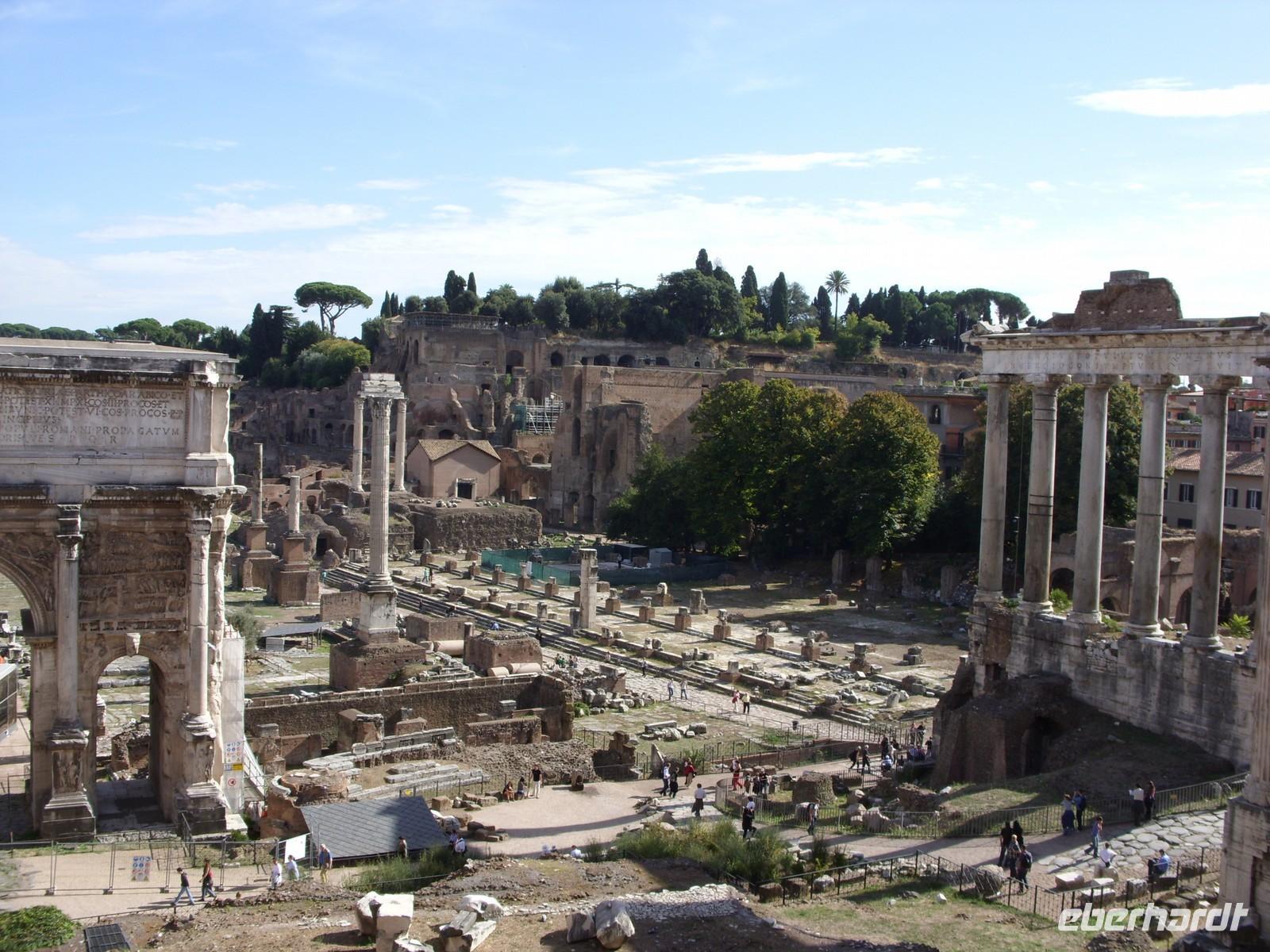 Dienstagmorgen trafen wir uns 9.00 Uhr an der Hotelrezeption und nahmen dort unseren ständigen Begleiter für die kommenden Tage entgegen - einen Audioguide, mit dem wir die Stadtführerin auf Schritt und Tritt hören konnten. Nach einer recht langen U-Bahnfahrt machten wir dann auch endlich das erste Mal Bekanntschaft mit unserer lieben Maria Theresa. Von nun waren wir bestens umsorgt und stürzten uns auch zugleich in die Reste des antiken Roms. Erstes Ziel war dabei der mediterran bewachsene Palatinhügel mit seinen interessanten Bauten wie dem Stadion, verschieden Palästen, Bädern und immer wieder eindrucksvollen Blicken zum Petersdom oder dem Circus Maximus. Irgendwie war es jedoch für viele von uns fast unvorstellbar welche Pracht dieser Hügel einst besessen haben muss. Nicht zu unrecht entstammt ja auch der heutige uns geläufige Name Palast von diesem ersten besiedelten Hügel namens Palatino. Vom Nordrand der Anlage genossen wir dann noch einen Blick auf die gigantische Ausgrabungsstätte des ehemaligen Versammlungs- und Marktplatzes, das Forum Romanum, wo in erster Linie die Überreste der dreischiffigen Konstantin-/Maxentius-Basilika beeindruckten. Weiter ging es an einer schönen Brunnenanlage vorbei zum 1821 wundervoll restaurierten Titusbogen.