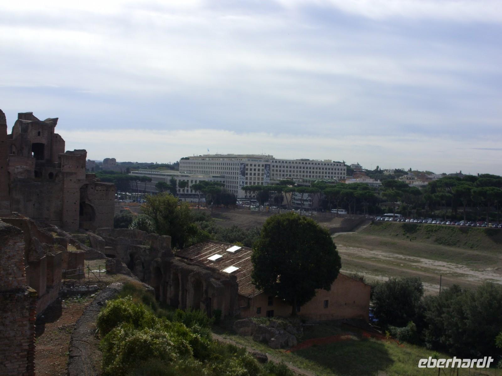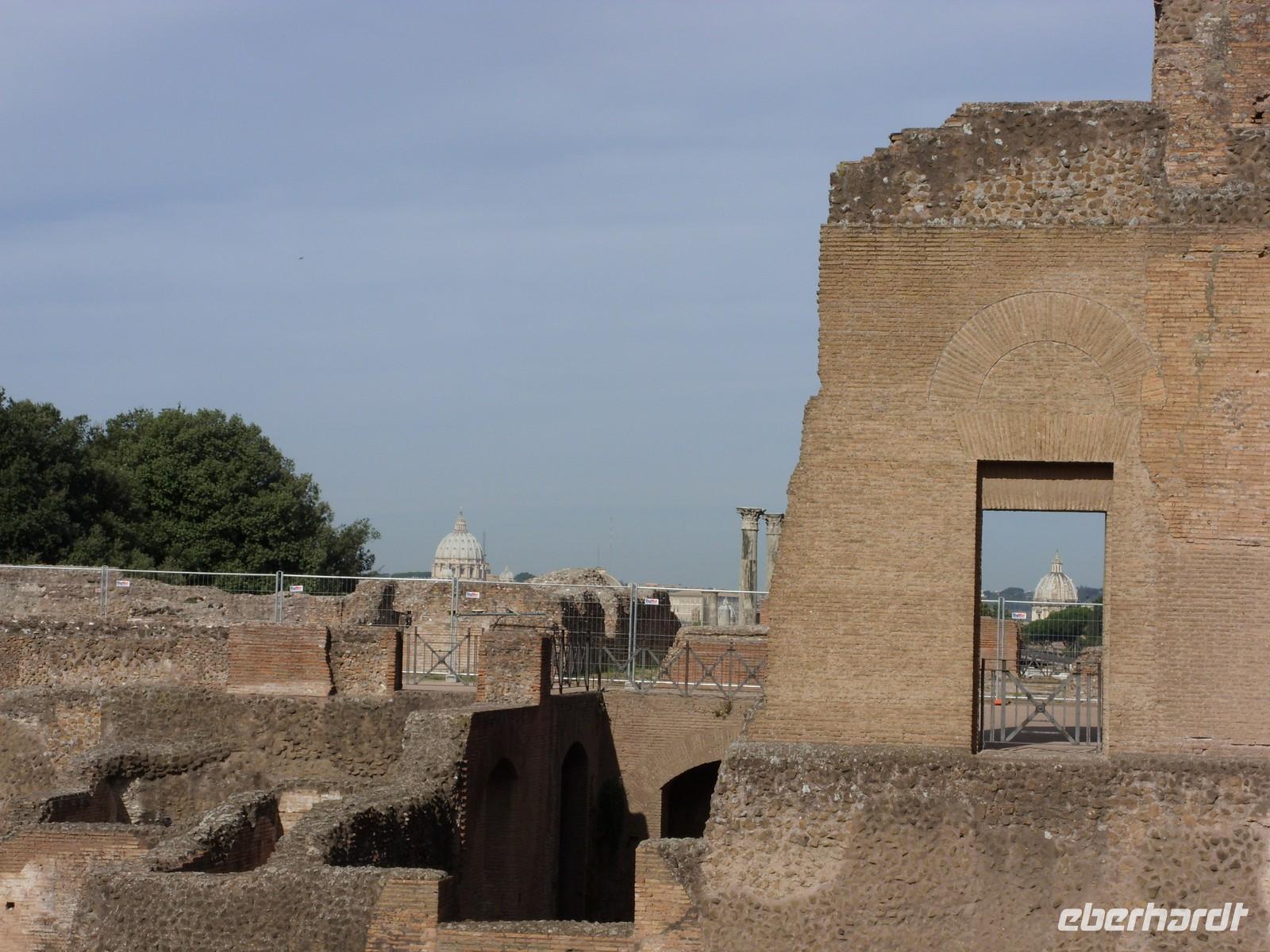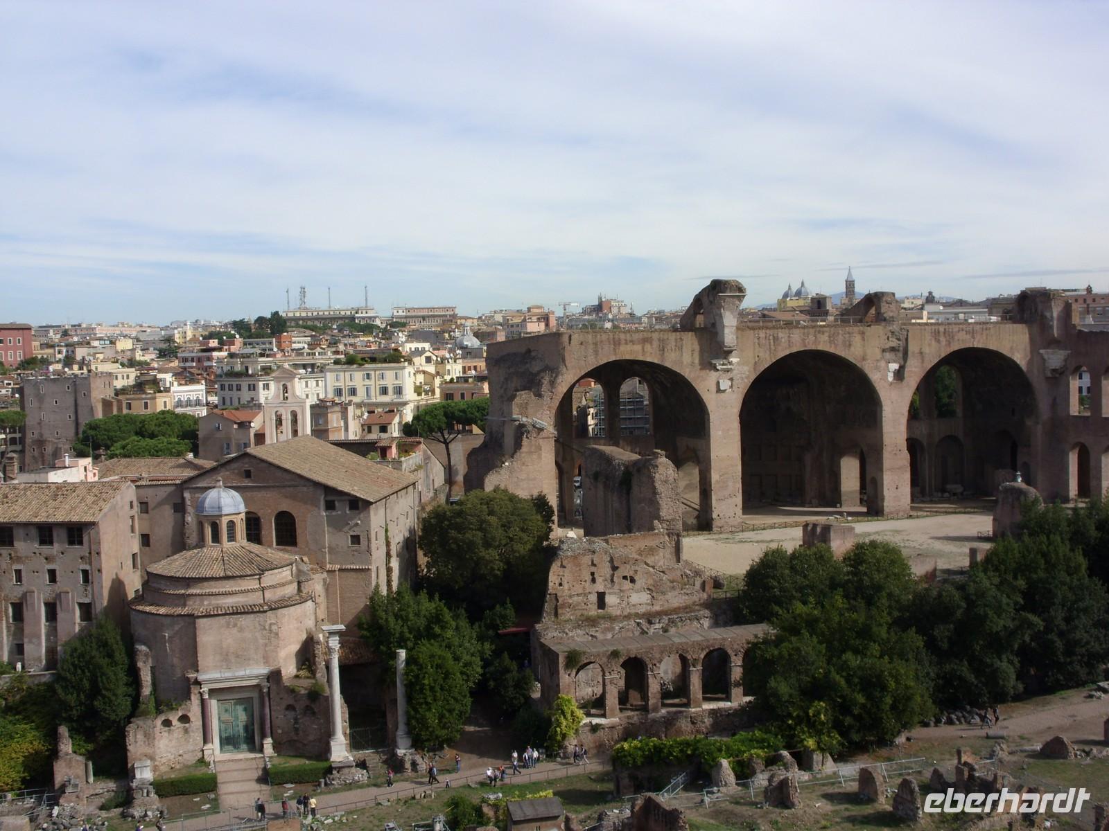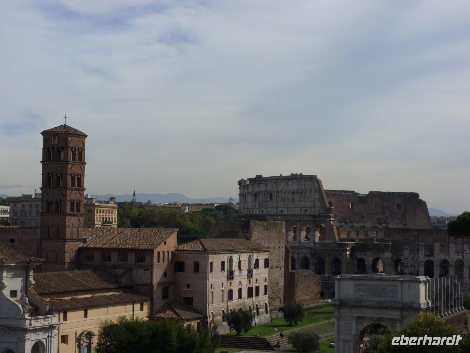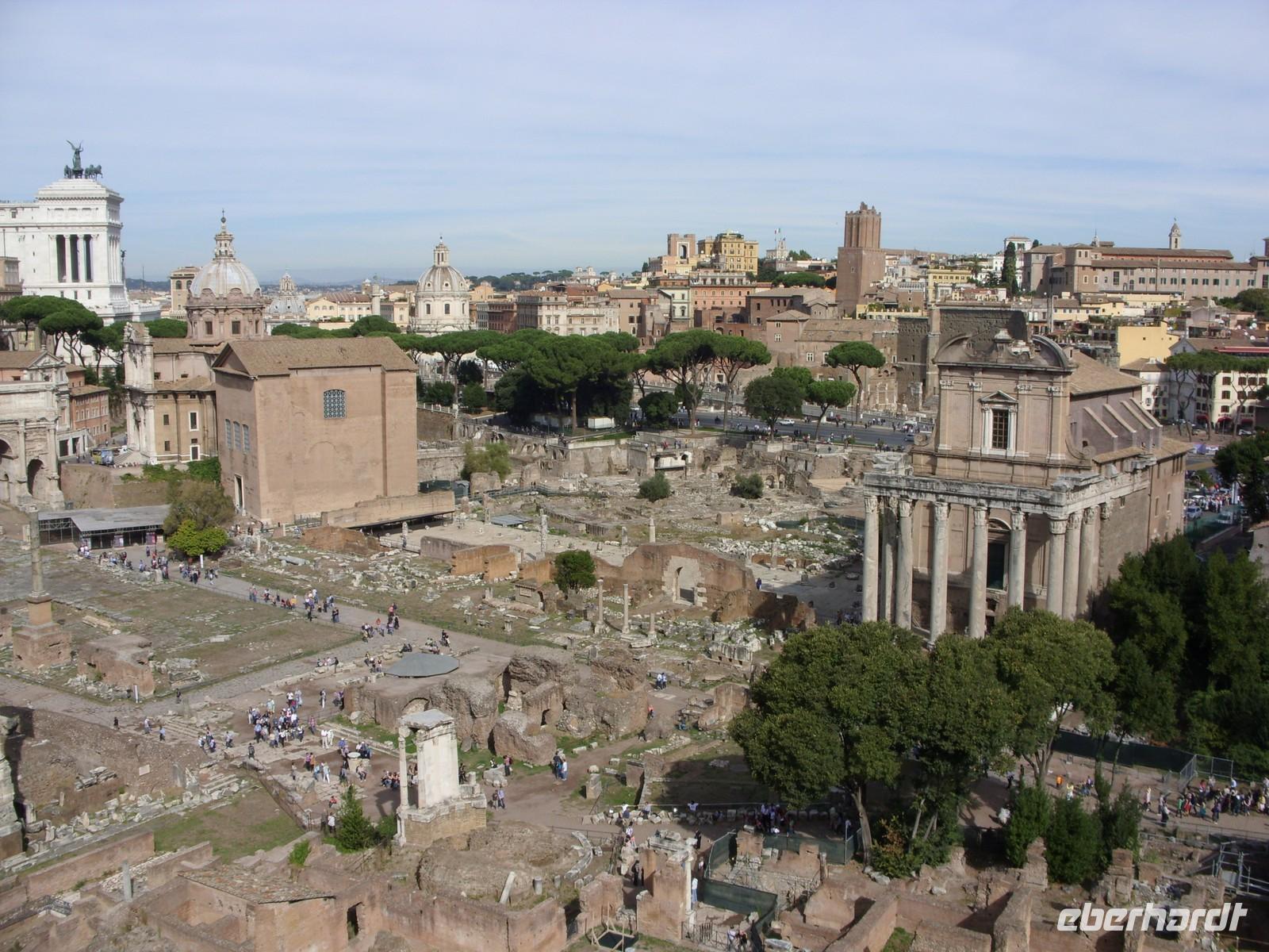 Dienstagmorgen trafen wir uns 9.00 Uhr an der Hotelrezeption und nahmen dort unseren ständigen Begleiter für die kommenden Tage entgegen - einen Audioguide, mit dem wir die Stadtführerin auf Schritt und Tritt hören konnten. Nach einer recht langen U-Bahnfahrt machten wir dann auch endlich das erste Mal Bekanntschaft mit unserer lieben Maria Theresa. Von nun waren wir bestens umsorgt und stürzten uns auch zugleich in die Reste des antiken Roms. Erstes Ziel war dabei der mediterran bewachsene Palatinhügel mit seinen interessanten Bauten wie dem Stadion, verschieden Palästen, Bädern und immer wieder eindrucksvollen Blicken zum Petersdom oder dem Circus Maximus. Irgendwie war es jedoch für viele von uns fast unvorstellbar welche Pracht dieser Hügel einst besessen haben muss. Nicht zu unrecht entstammt ja auch der heutige uns geläufige Name Palast von diesem ersten besiedelten Hügel namens Palatino. Vom Nordrand der Anlage genossen wir dann noch einen Blick auf die gigantische Ausgrabungsstätte des ehemaligen Versammlungs- und Marktplatzes, das Forum Romanum, wo in erster Linie die Überreste der dreischiffigen Konstantin-/Maxentius-Basilika beeindruckten. Weiter ging es an einer schönen Brunnenanlage vorbei zum 1821 wundervoll restaurierten Titusbogen.