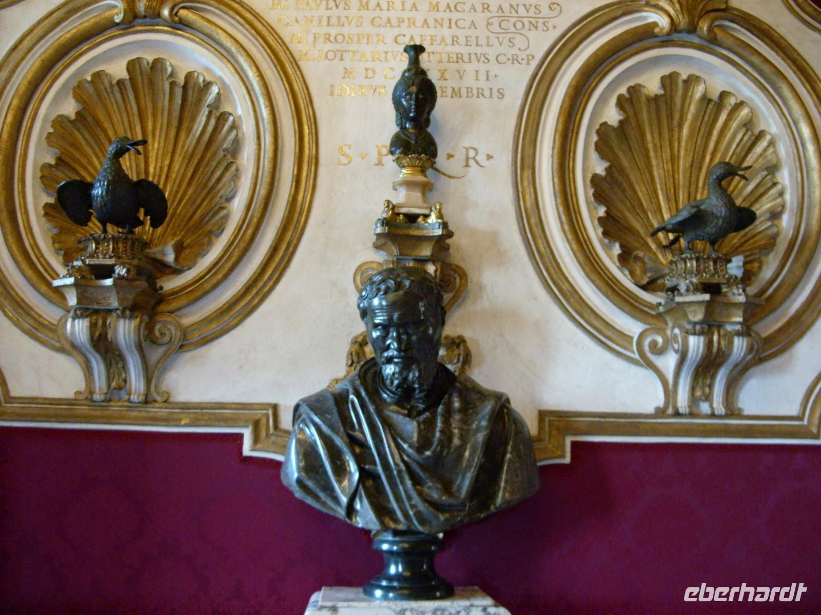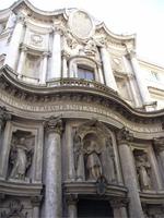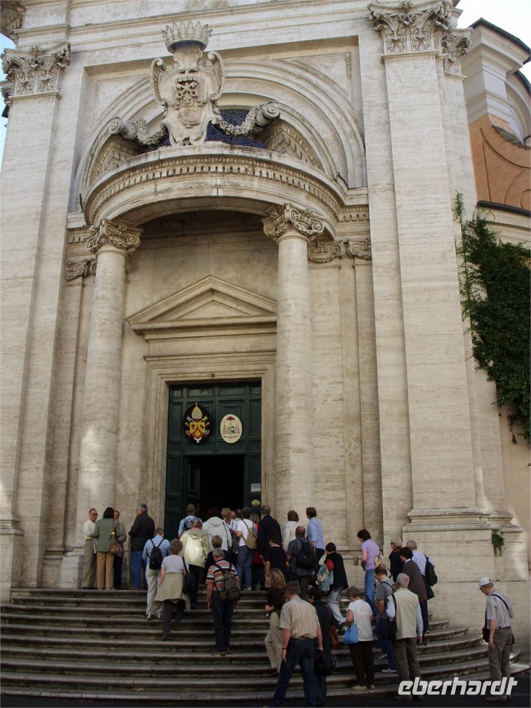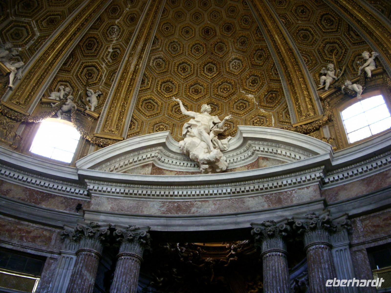Nachdem wir das Hauptbauwerk des Esquilin-Hügels ausgiebig besichtigt hatten, wanderten wir weiter zum Viminale-Hügel, passierten dort das Innenmisterium Italiens und erreichten schließlich den dritten Hügel namens Quirinale. Bei unseren weiteren Kirchenbesichtigungen standen nun zwei italienische Künstler im Vordergrund - Gian Lorenzo Bernini (1598-1680) und Francesco Borromini (1599-1667) - , die beide ihre eigene Art der Architekturkunst entwickelt hatten. Zunächst staunten wir in der eher einfach und schlichten Kirche San Carlo alle Quattro Fontane, benannt nach den vier Brunnen an der Straßenkreuzung. Bei diesem Bau waren vor allem Borrominis Vorliebe für geschwungene Formen, Bewegung und Harmonie gut zu erkennen. Im Anschluss besuchten wir die fast nebenan liegende Kirche Sant' Andrea al Quirinale, ein Spätwerk von Bernini, mit dem er der Überlieferung nach voll und ganz zufrieden sein gewesen sein soll. Sonst galt er wohl eher als sehr anspruchsvoller Künstler, dem nichts zufrieden stellte.