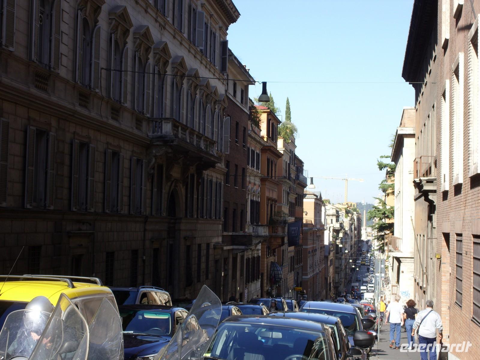 Ganz anders verlief auch schon der Flug für die 23 Gäste, die in Berlin-Schönefeld gestartet waren und in Rom-Ciampino landen sollten. Kurz vor der Landung hiess es hier nämlich plötzlich, dass der Zielflughafen wegen der Landung italienischer Soldaten aus Afghanistan kurzzeitig geschlossen ist. Alternativ landeten wir also auf dem zweiten Flughafens Roms in Fiumicino, warteten dort auf weitere Anweisungen, tankten auf und hoben schließlich doch noch mal für sage und schreibe 15 Kilometer Distanz ab. So kurz war wohl noch keiner von uns in der Luft gewesen ... Mit etwa drei Stunden Verspätung hatten wir nun endlich unser Ziel erreicht und wurden auch schon von einer italienischen Transferfahrerin in Empfang genommen und zum Hotel Palazzo Carpegna gefahren. Aufgrund unserer Verspätung konnten wir jedoch bereits unsere Zimmer beziehen und die Gegend nach etwas Essbarem durchstreifen.