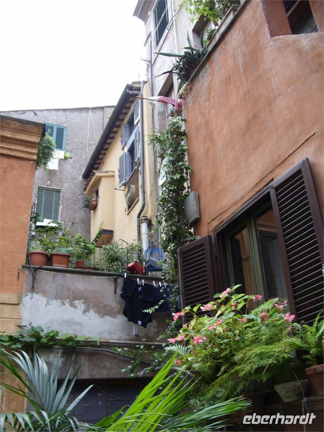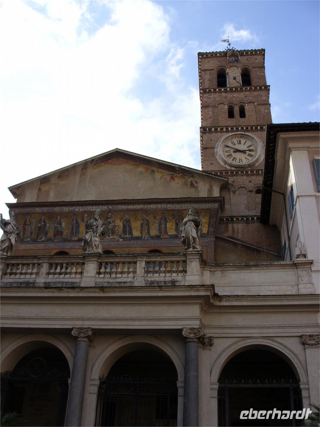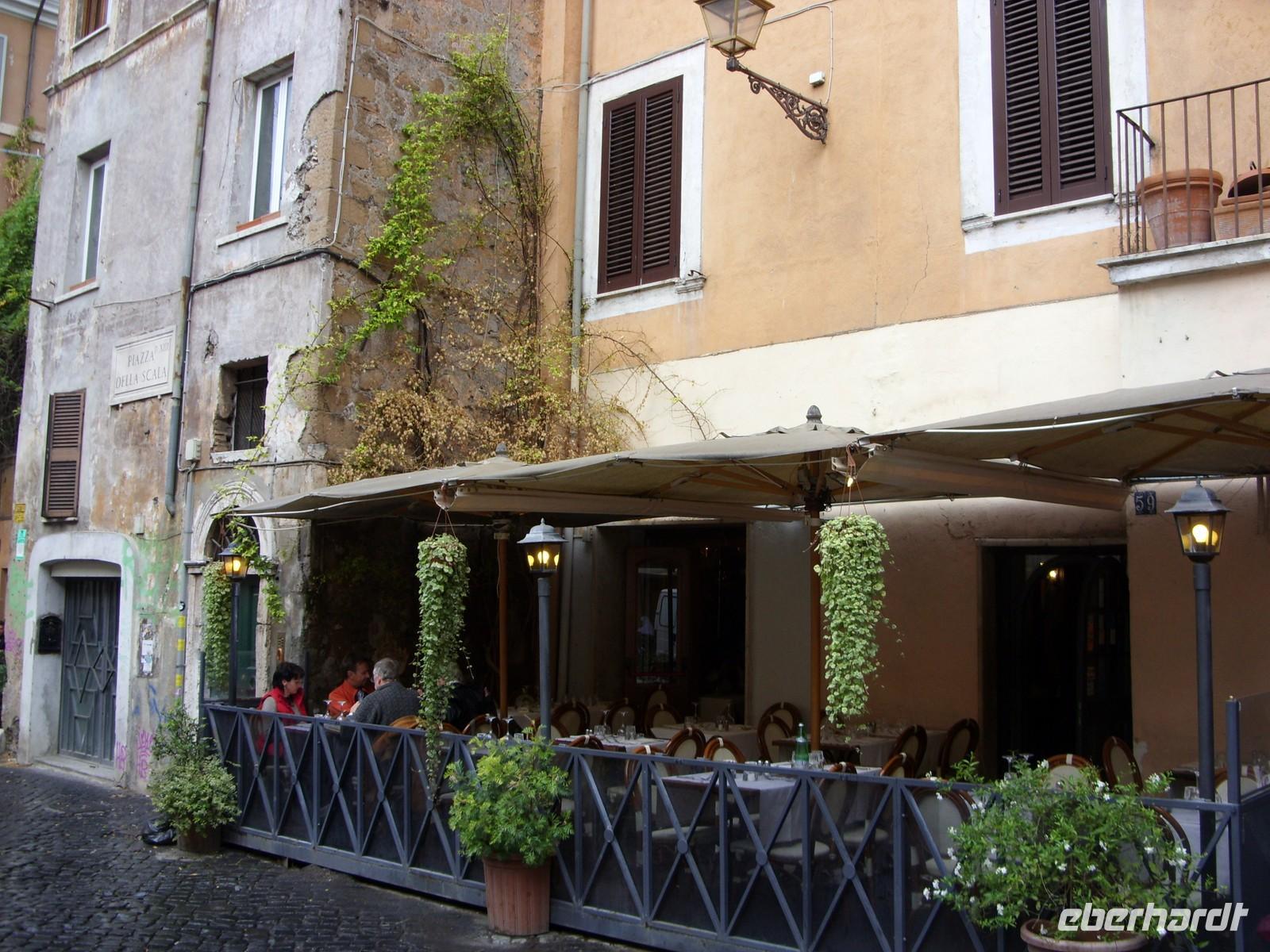 Im Anschluss schlenderten wir über die Engelsbrücke weiter durch die altstädtischen Gassen von Rom bis wir den viel besuchten Piazza Navona erreichten. Dieser Platz gilt schon seit Jahrhunderten als eines der Lebenszentren Roms und könnte ein wenig mit dem Pariser Montmartre verglichen werden - hier tummeln sich fast zu jeder Tages- und Nachtzeit Maler, Künstler, Gaukler, Touristen. Danach ging's zu einem weiteren sehenswerten Platz, dem Campo de' Fiori, dem Blumenmarkt. Was für eine Augendweide: dieses leckere Obst und Gemüse von den Feldern Italiens! Maria Theresa rundete das Ganze mit ihrer amüsanten Erzählung des richtigen Spaghetti-Kochens - natürlich al dente! - ab. Nun war der Tiber nicht mehr weit. Wir überquerten den Fluss und erreichten sogleich ein neues, sehr lebendiges Viertel namens Trastevere. Da es langsam an der Zeit war uns zu stärken, visierten wir das Ristorante La Scala an, wo wir auch schon erwartet wurden. Hier wurden wir mit leckeren Rigatoni, Kalbfleisch und natürlich der typischen, niemals fehlenden Süssspeise verköstigt. Gut gestärkt wartete im Anschluss an die Mittagspause eine weitere Kirchenbesichtigung auf uns: Santa Maria in Trastevere. Auch diese romanische Kirche verzauberte uns mit ihrer prächtigen Innenausstattung, besonders sehenswert waren dabei die Apsis-Mosaiken aus dem 12. und 13. Jahrhundert.