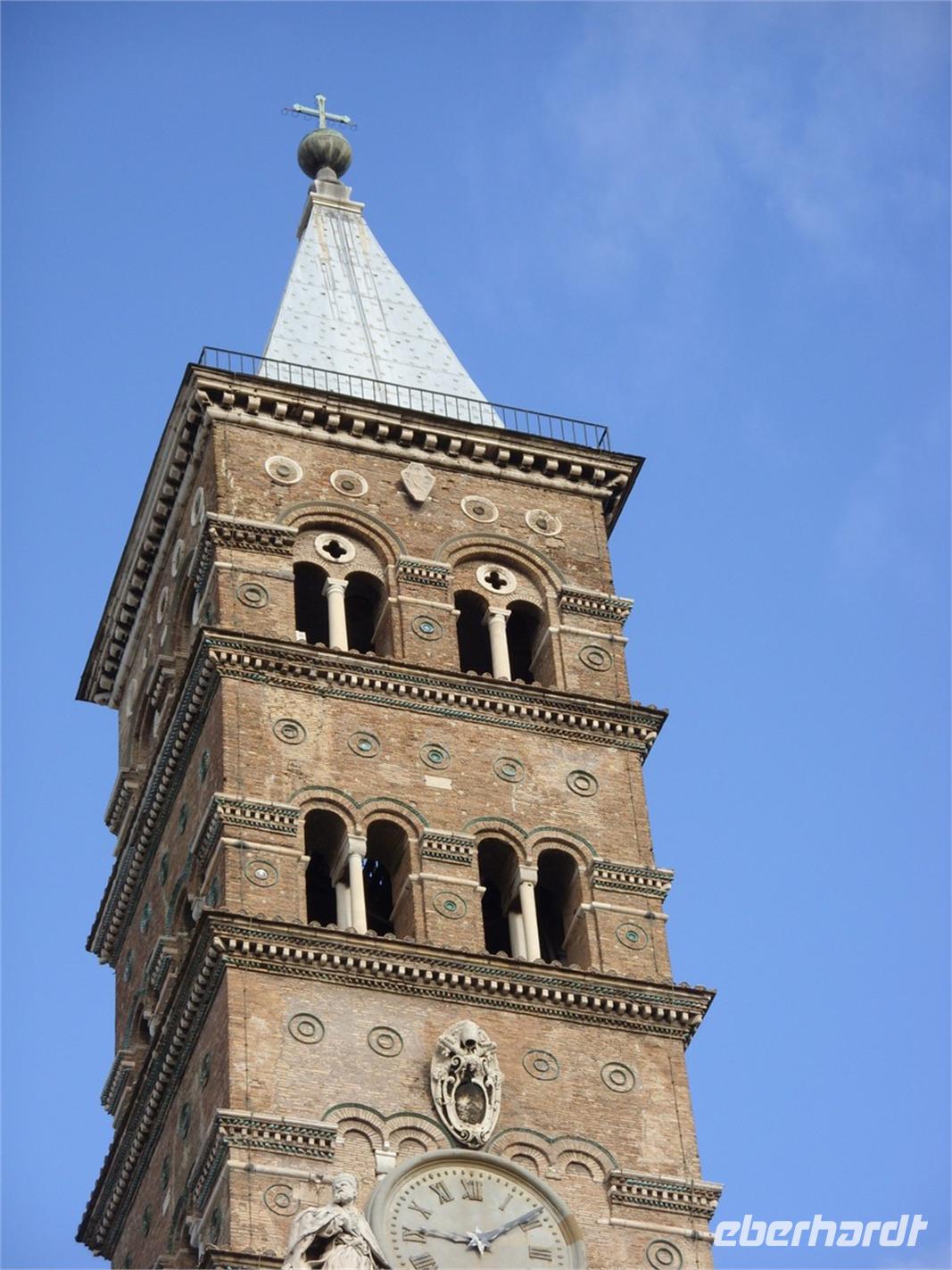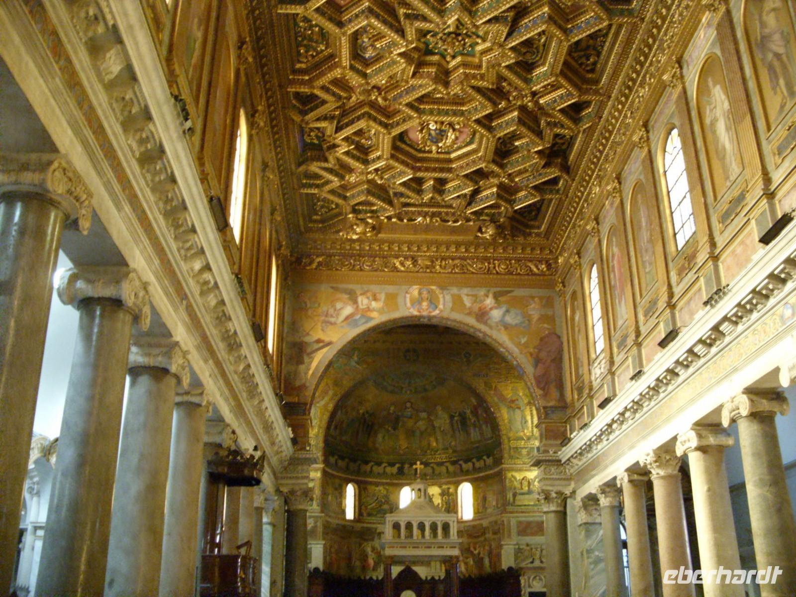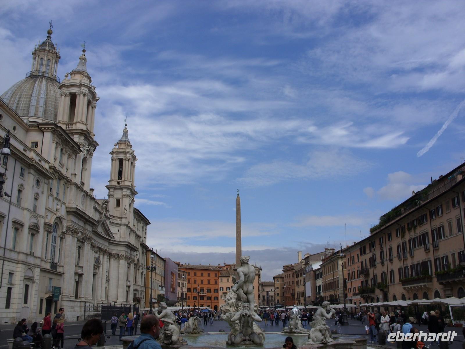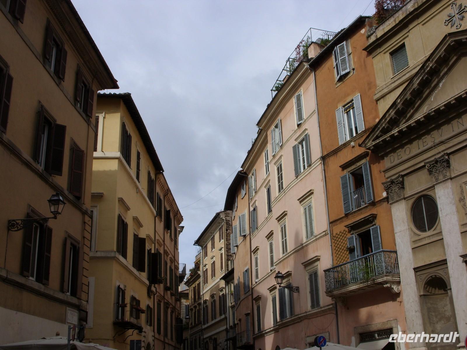 Im Anschluss schlenderten wir über die Engelsbrücke weiter durch die altstädtischen Gassen von Rom bis wir den viel besuchten Piazza Navona erreichten. Dieser Platz gilt schon seit Jahrhunderten als eines der Lebenszentren Roms und könnte ein wenig mit dem Pariser Montmartre verglichen werden - hier tummeln sich fast zu jeder Tages- und Nachtzeit Maler, Künstler, Gaukler, Touristen. Danach ging's zu einem weiteren sehenswerten Platz, dem Campo de' Fiori, dem Blumenmarkt. Was für eine Augendweide: dieses leckere Obst und Gemüse von den Feldern Italiens! Maria Theresa rundete das Ganze mit ihrer amüsanten Erzählung des richtigen Spaghetti-Kochens - natürlich al dente! - ab. Nun war der Tiber nicht mehr weit. Wir überquerten den Fluss und erreichten sogleich ein neues, sehr lebendiges Viertel namens Trastevere. Da es langsam an der Zeit war uns zu stärken, visierten wir das Ristorante La Scala an, wo wir auch schon erwartet wurden. Hier wurden wir mit leckeren Rigatoni, Kalbfleisch und natürlich der typischen, niemals fehlenden Süssspeise verköstigt. Gut gestärkt wartete im Anschluss an die Mittagspause eine weitere Kirchenbesichtigung auf uns: Santa Maria in Trastevere. Auch diese romanische Kirche verzauberte uns mit ihrer prächtigen Innenausstattung, besonders sehenswert waren dabei die Apsis-Mosaiken aus dem 12. und 13. Jahrhundert.