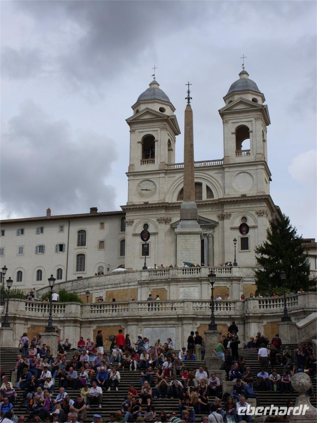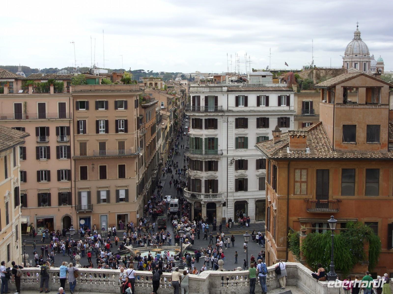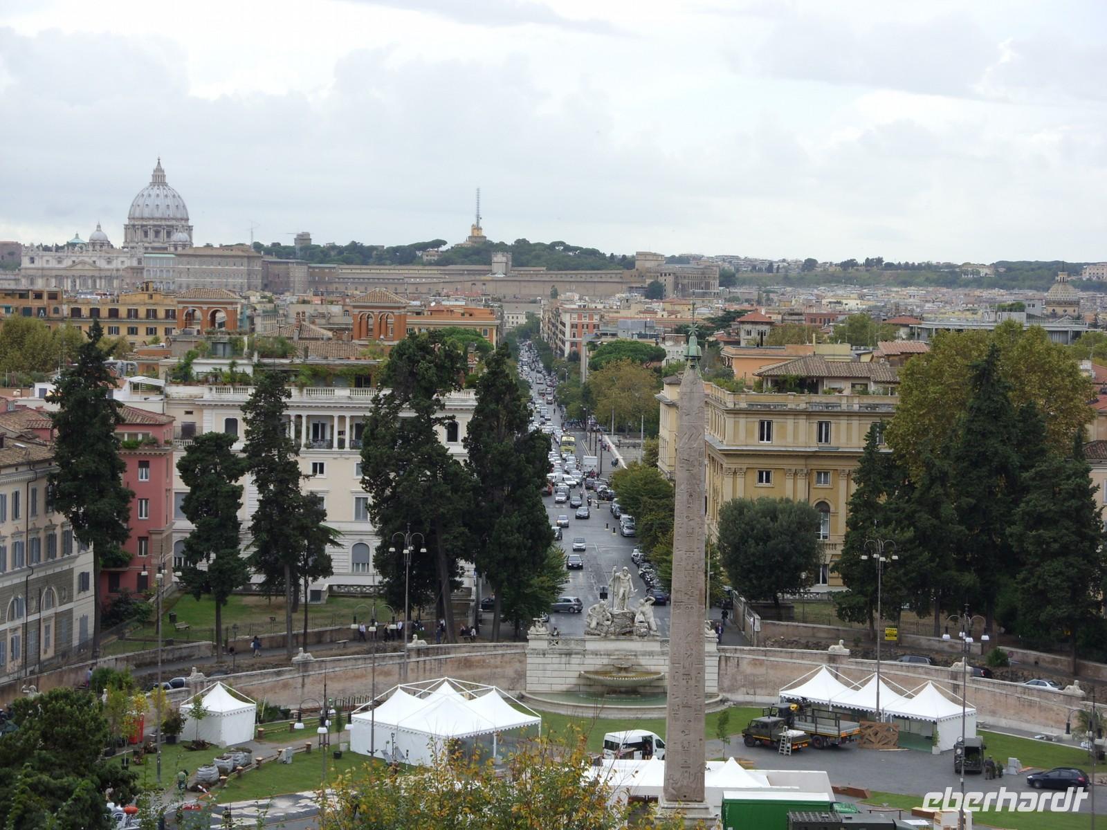 Nach einer einstündigen Pause erwarteten uns nun im Folgenden weitere kleine Gassen der Innenstadt Roms. Ziel unseres Spaziergangs war dabei das Pantheon - ein "allen Göttern geweihter Tempel" und eines der besterhaltenen Bauwerke der "Ewigen Stadt". Grund dafür ist vor allem die Nutzung des Pantheons als christliche Kirche bereits seit der Spätantike. Ein beeindruckendes Bauwerk! Nach einer kurzen Innenbesichtigung schlenderten wir durch die schicken und teuren Einkaufsstraßen der Stadt bis wir den beliebten Treffpunkt, die Spanische Treppe, erreichten. Einmal auf den Stufen sitzen und die Menschen beobachten ... Dafür war nun Zeit, denn den Rest des Nachmittags stand uns zur freien Verfügung. Mit einem Teil der Gäste spazierte ich dann weiter an der Villa Medici vorbei bis zum Pincio am westlichen Rand des Park Borghese. Von diesem bei Jugendlichen beliebten Platz hatten wir nochmals einen herrlichen Blick über die Dächer von Rom und den direkt unter uns liegenden Piazza del Popolo, dem Platz des Volkes, welcher oftmals für Kundgebungen und Veranstaltungen jeglicher Art genutzt wird. Hier befanden wir uns zudem direkt an der Pforte, wo einst tausende Pilger in der Stadt Rom ankamen.