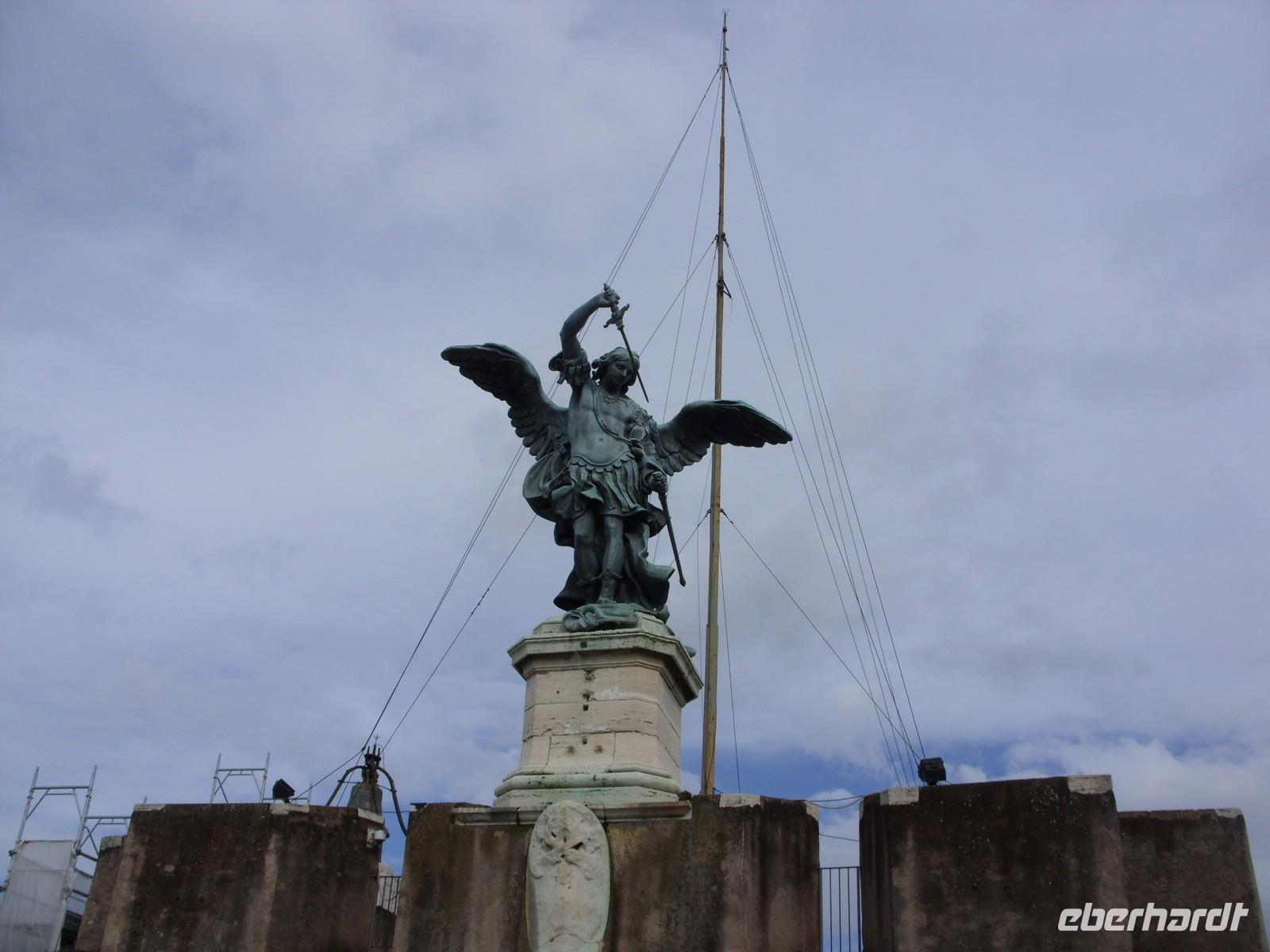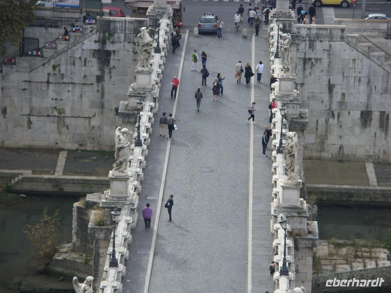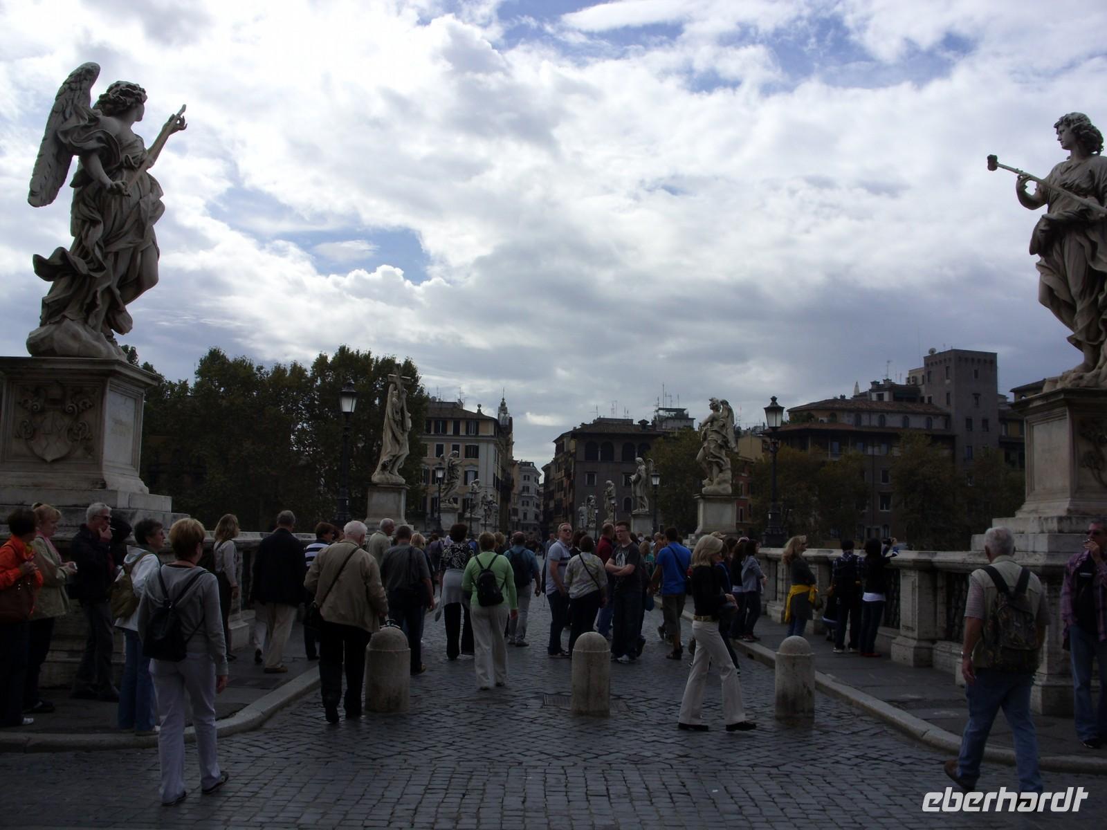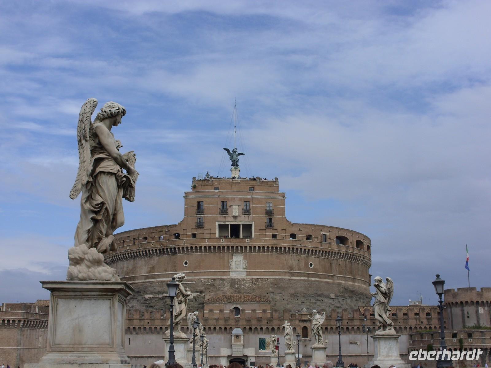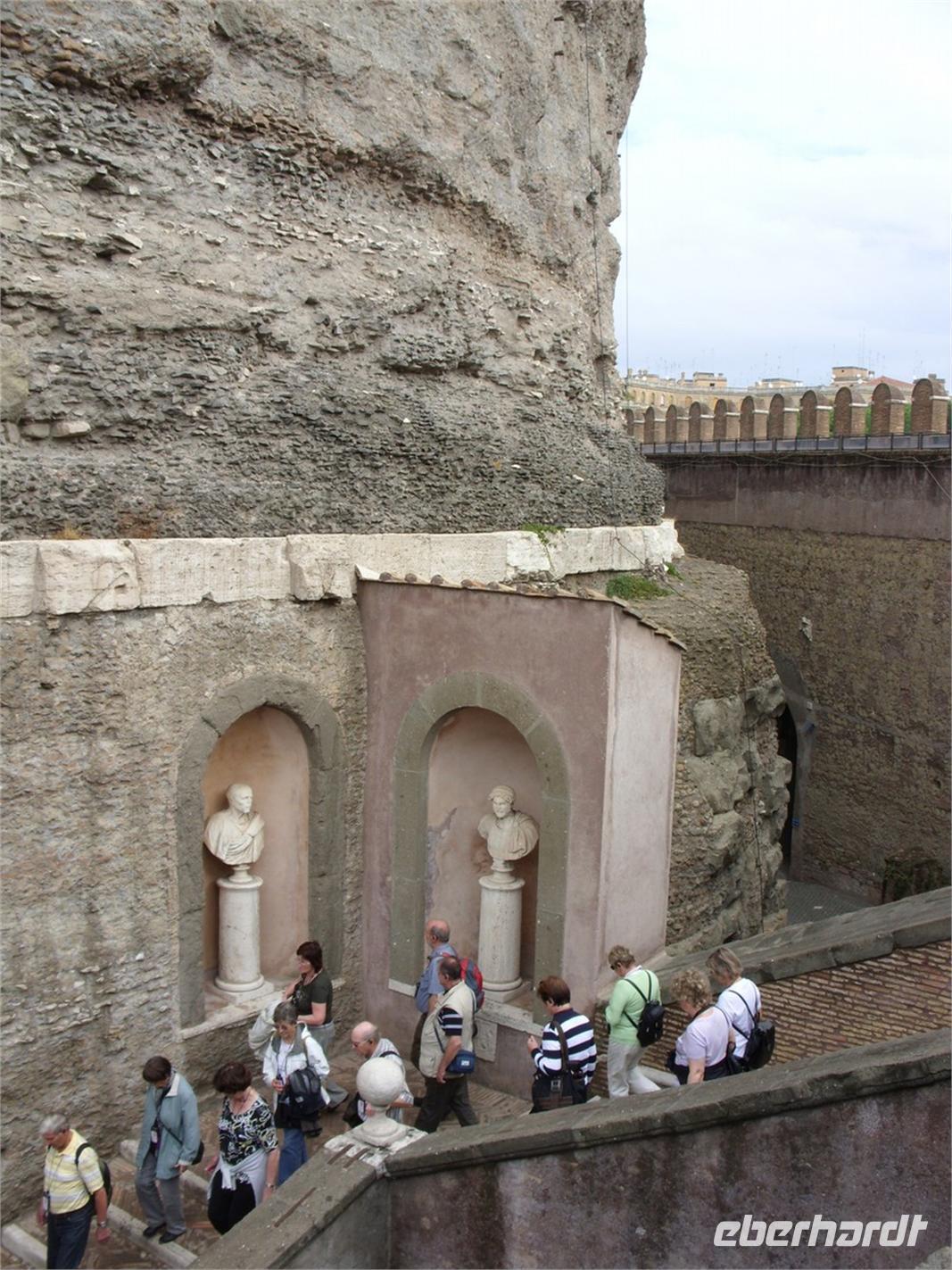 Am heutigen Donnerstag stand nun eine eher gemütliche Entdeckungstour auf dem Programm. Zunächst fuhren wir mit einem leicht überfüllten Stadtbus in die Nähe des Petersplatz, wo auch schon wieder Maria Theresa auf uns wartete. Gemeinsam schlendertern wir dann an der Leoninischen Mauer entlang zur Engelsburg. Diese ehemalige Mausoleum für Kaiser Hadrian wurde bereits im Jahr 130 n.Chr. erbaut, wechselte dann jedoch im Laufe der Jahrhunderte seine Bestimmung vom militärischen Stützpunkt im 5.Jh. sowie zur Festung und Gefängnis ab dem 10. Jh. Heute befindet sich in der eindrucksvollen Anlage ein Museum, welches auch sogleich Ziel unseres Besuches war. Über Rampen und Stufen kletterten wir bis zur Dachterrasse, von wo aus wir ein herrliches Panorama über die Dächer von Rom hatten. Das war doch der beste Platz auch mal ein Gruppenfoto zu machen! Dankeschön.