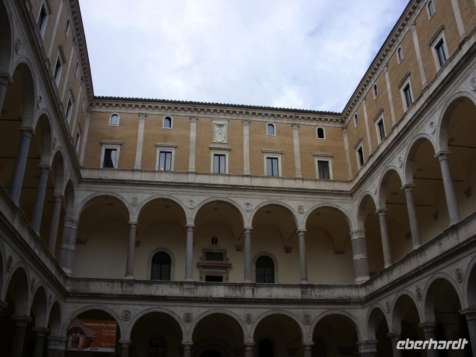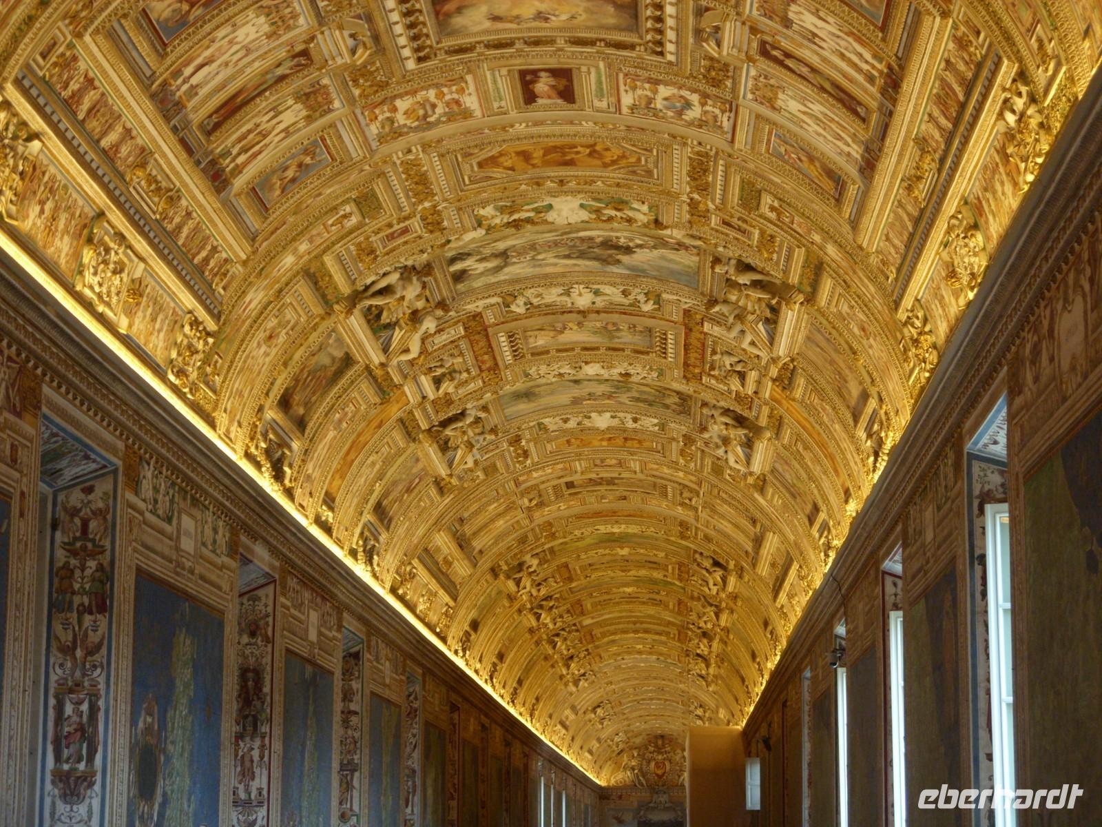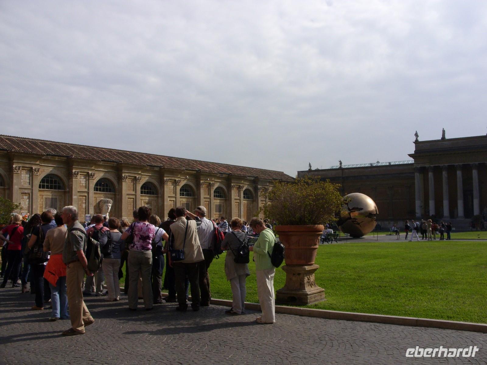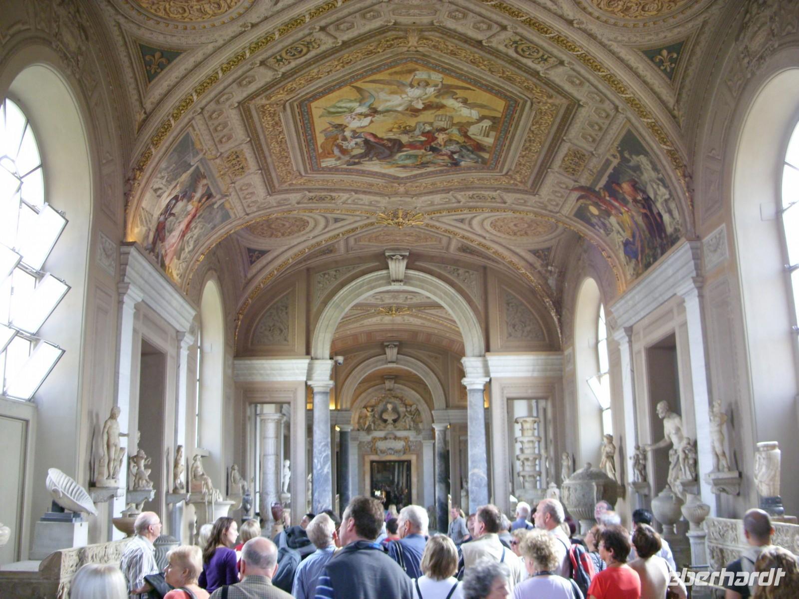 Nach der Ruhe und dem Frieden in den Vatikanischen Gärten erwartete uns nach der Mittagspause in der Cafeteria der Vatikanischen Museen eine recht touristische Welt. Mit Sicherheit benötigt man eine Woche Zeit, um sich all die Ausstellungsräume der bereits Anfang des 19. Jh. gegründeten Museen anzuschauen. Wir "mussten" uns bei den nun folgenden Besichtigungen auf den Innenhof Cortila della Pigna, den Museumsteil Museo Pio Clementino und die Sixtinische Kapelle beschränken. Trotzdem war auch in diesem Abschnitt eine Fülle von Werken zu bewundern, die einem schlicht und ergreifend fast den Atem rauben. Besonders gespannt waren wir natürlich auch alle auf die einzigartige Sixtinische Kapelle, die einige der berühmtesten Gemälde der Welt enthält. Unter anderem malte ja Michelangelo zwischen 1508 und 1512 die beeindruckenden Deckenfresken - beeindruckend vor allem deswegen weil er ohne jede Vorzeichnungen arbeitete!