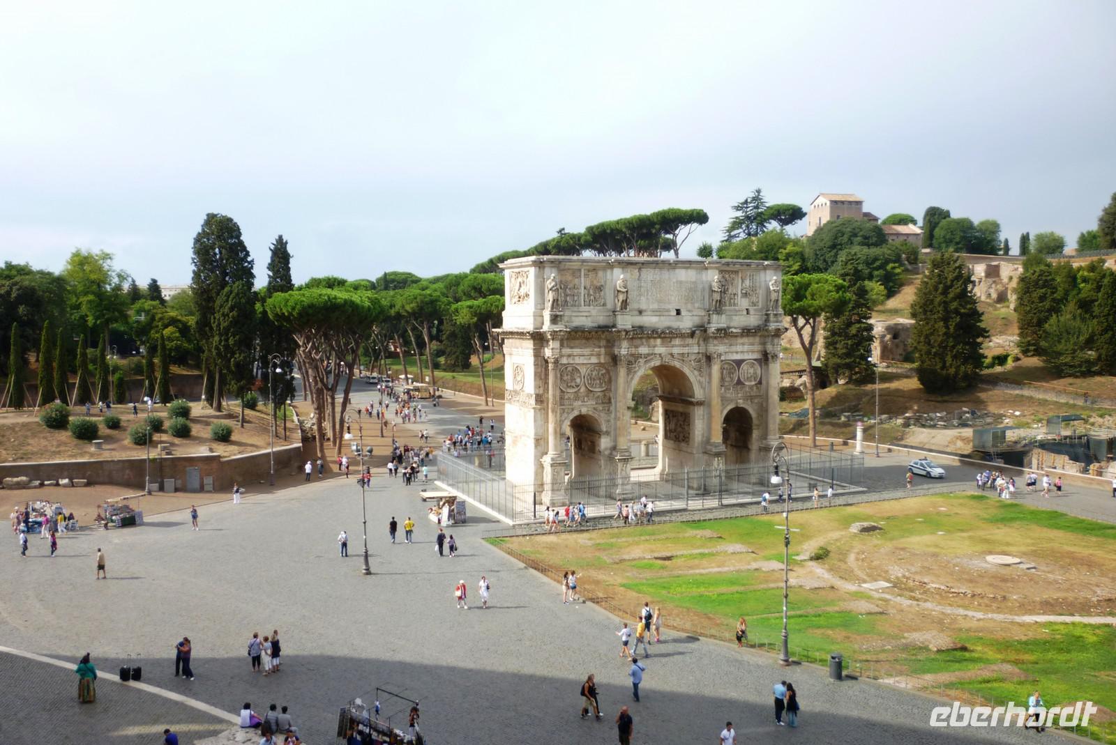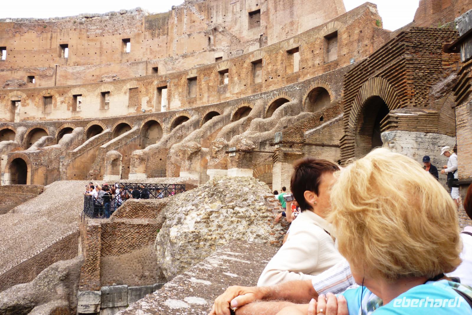 Um 09:00 Uhr trafen wir am Kolosseum auf unsere Stadtführerin Sylvia und wurden von ihr in das antike Oval hineingeführt, das als Kampf-Spielstätte aus der Zeit 80 n. Chr. alle Zeiten überdauert hat. Danach gelangten wir auf den Palatin-Hügel, um die noch vorhandenen Reste ehemaliger Kaiserpaläste zu sehen und anhand der noch erhaltenen Grundmauern die Größe und das Machtbewusstheit der römischen Herrscherschicht geistig nachzuvollziehen. Anschließend besuchten wir das Forum Romanum und ließen uns die bedeutendsten Stätten ausführlich erläutern. Leichter Regen war kein Hindernis, sich in die Antike zurückzuversetzen. Nach diesem Erlebnis erstiegen wir den Kapitolsplatz und bewunderten, wie alle Besucher zu jeder Zeit, die geniale Konzeption dieses Platzes durch Michelangelo. In den Kapitolinischen Museen sahen wir uns die Original-Statue des Mark Aurel sowie andere berühmte Kunstwerke an, darunter auch Porträt-Plastiken aus römischer Zeit. Auch die noch bis zum 09.09. laufende Ausstellung „Lux in Arcana" (Licht in das Geheimnis- aus den Vatikanischen Privatarchiven) war Bestandteil der Besichtigung. Nach diesem Programm fuhr die Mehrzahl unserer Gäste auf die Plattform des Nationaldenkmals, um von dort den herrlichen Ausblick zu genießen.