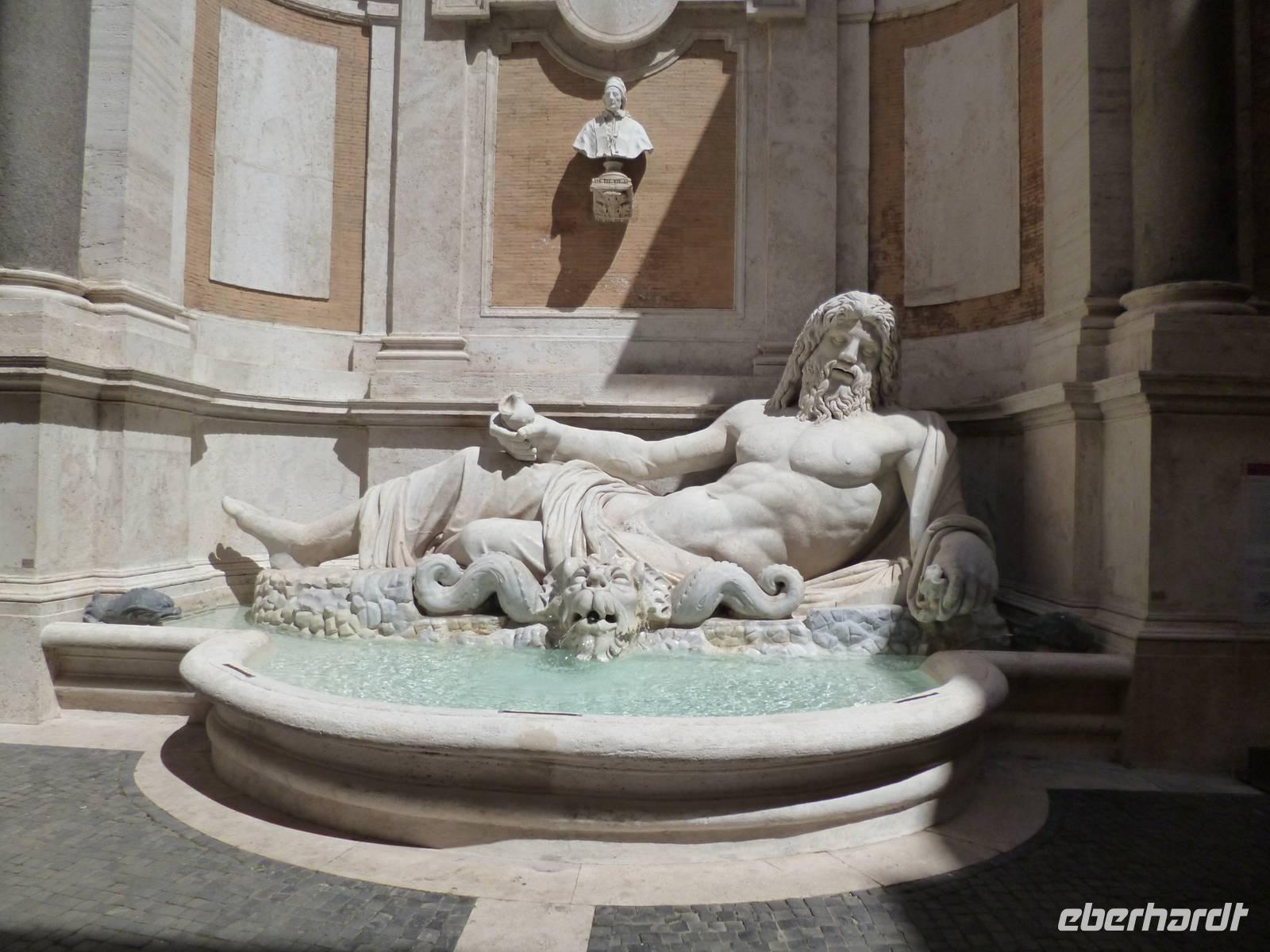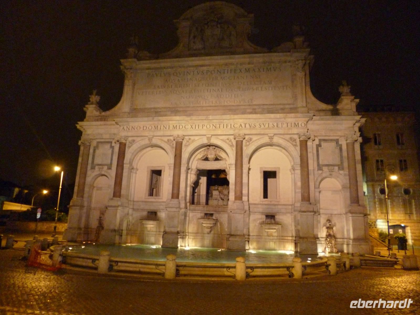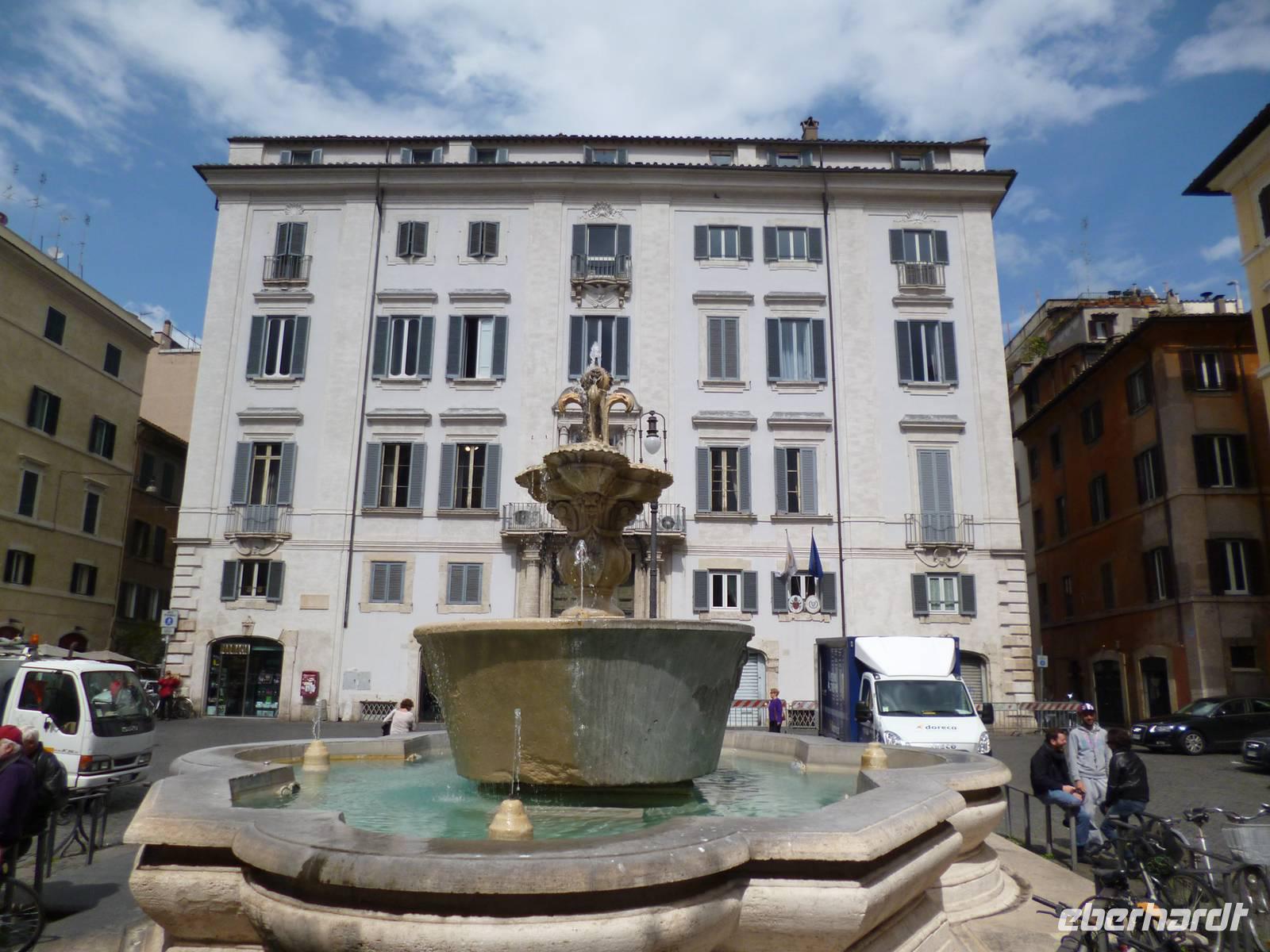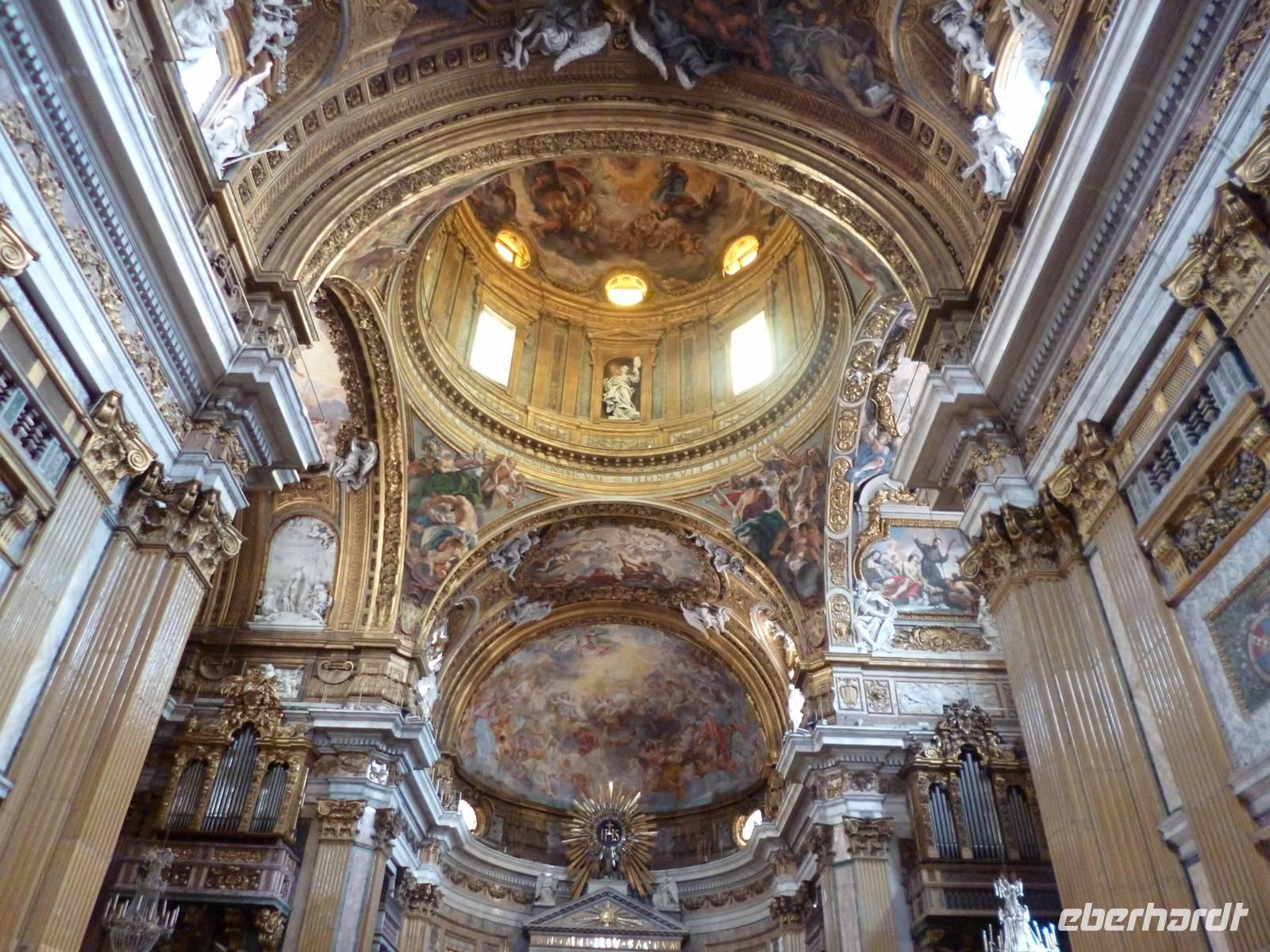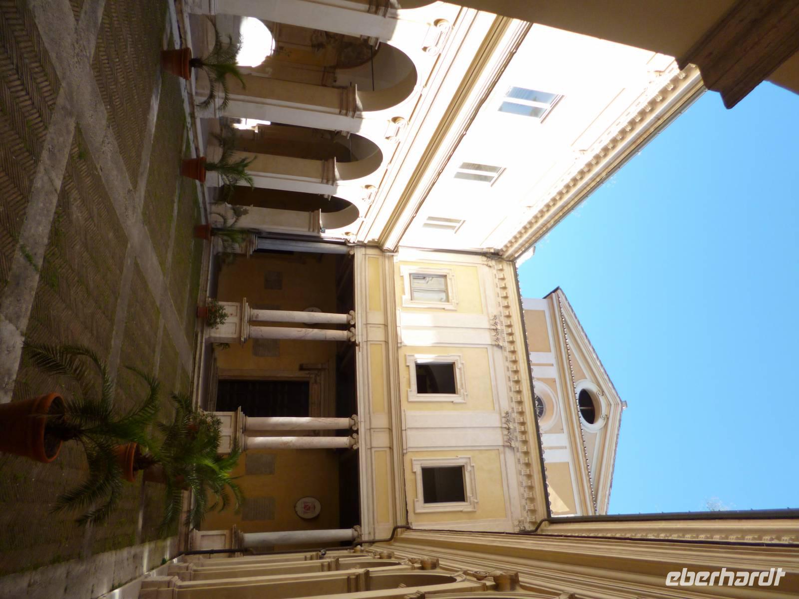 Anschließend brachte uns der Bus wieder zum historischen Stadtzentrum und durch die Ruinen des antiken Marcellustheaters und den Innenhof des Palazzo Gaeta gingen wir zur Jesuitenkirche Sant´ Iganzio, gebaut mit höchstem Pomp als Bollwerk der Gegenreformation, während zeitgleich in Deutschland der Dreißigjährige Krieg tobte. Vor allem bei der lediglich auf eine flache Decke gemalten Kuppel zeigen sich die Ordensbrüder als in den Naturwissenschaften geschulte Meister der optischen Täuschung. Nach der anschließenden Mittagspause war leider auch das nahe gelegene Pantheon wegen des Feiertags, wie auch sämtliche Kirchen geschlossen und so erklärte Frau Berlin von außen die Geschichte diese grandiosen antiken Tempelbaus, der als Kirche zweitausend Jahre überstand, obwohl man aus dem Bronzedach seiner Vorhalle den Baldachin im Petersdom fertigte.
