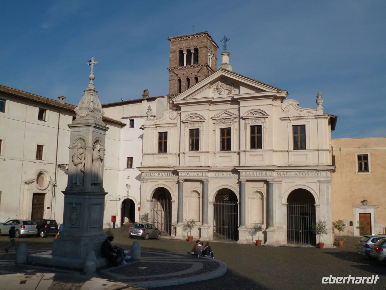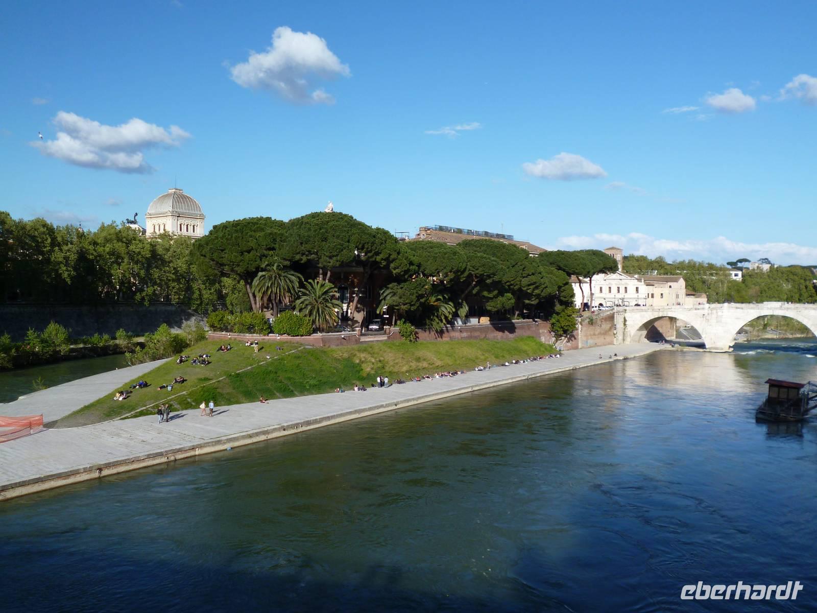 Ich bot den Gästen einen Spaziergang an und schlenderte gemütlich mit fast der gesamten Gruppe zur Aussichtspromenade auf dem Gianicolo, wo man einen guten topografischen Überblick des alten Rom hat. Dann ging es hinunter zum Tempietto des Bramante, der an der Stelle steht, wo der Apostel Petrus sein Martyrium erlitt, heute Teil des Klosters San Pietro in Montorio. Unten in Trastevere legten wir eine Mittagspause ein und danach ging es über die Tiberinsel mit der Bartholomäuskirche zur Synagoge, den beiden antiken Tempeln und zur Kirche Santa Maria in Cosmedin, wo Hunderte Japaner am so genannten Mund der Wahrheit Schlange für ihr Urlaubsfoto stehen. Zurück dann durchs Boarium mit dem Tempel des Janus Quadrifons, durch das Marcellustheater zurück zum Tiber und mit Bahn und Bus ins Hotel, wo der Begrüßungsaperitif auf uns wartete.
