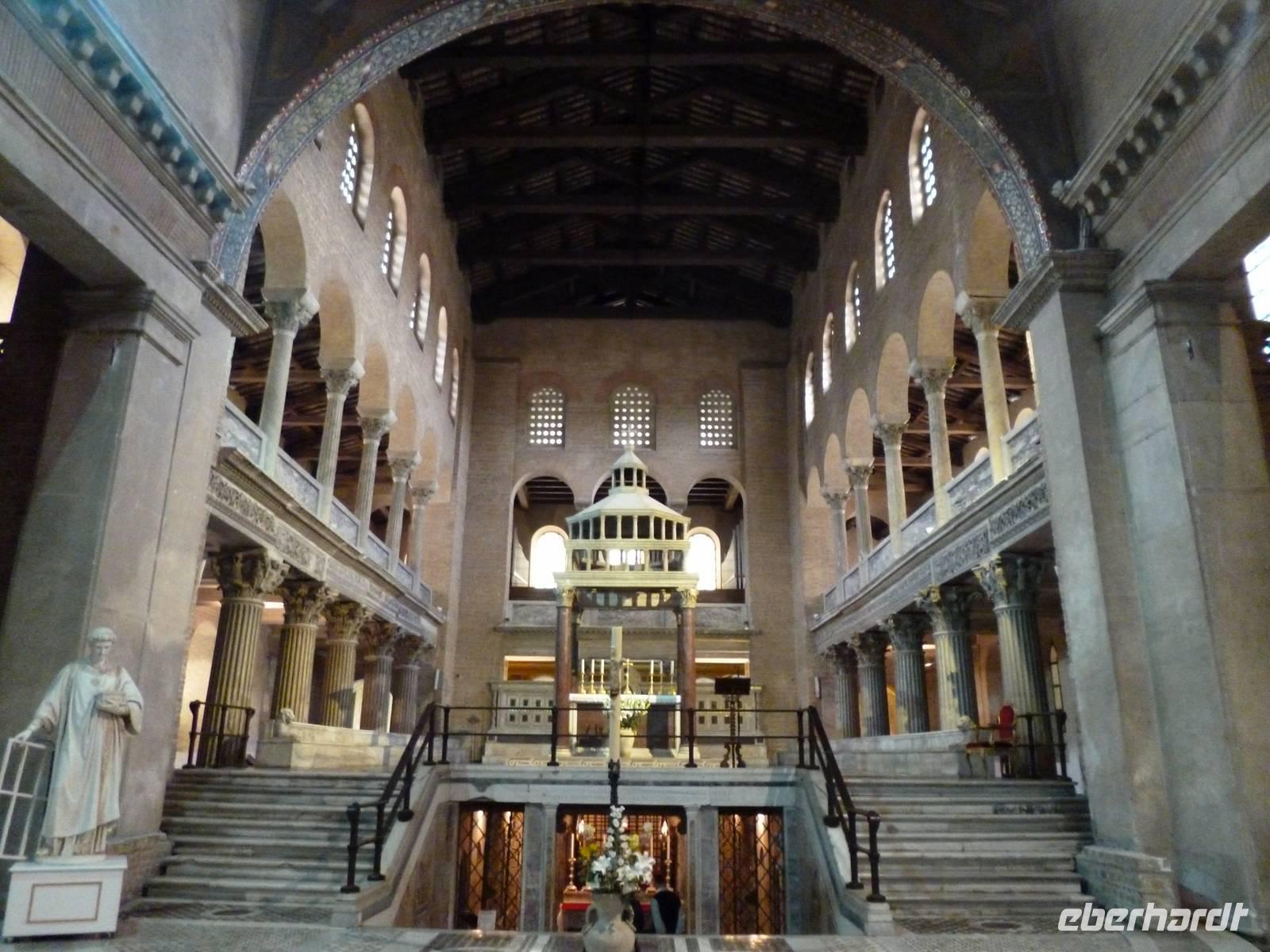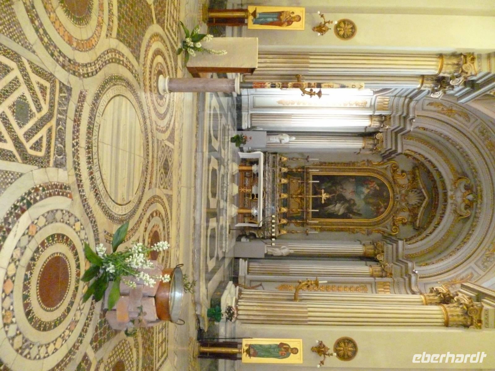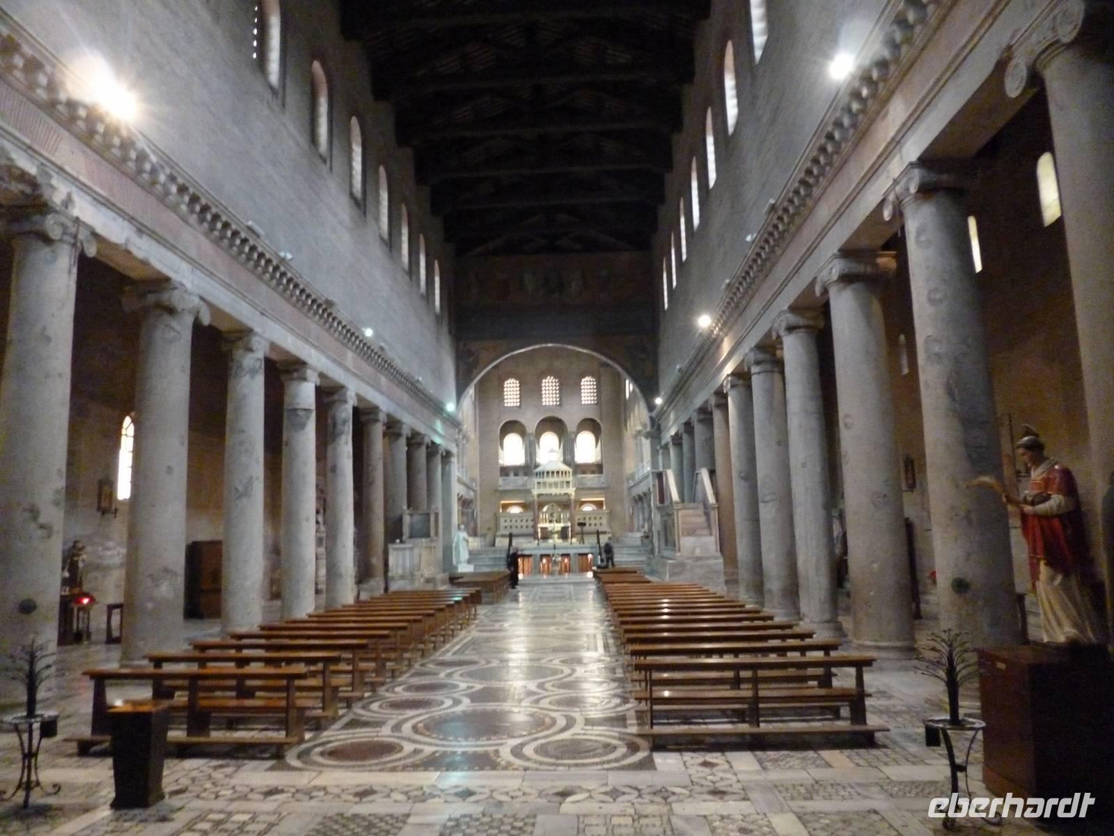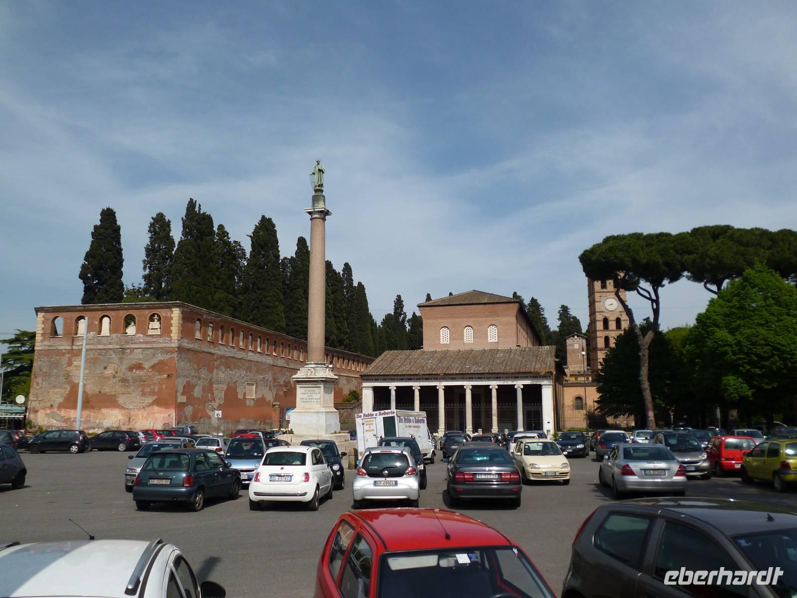 Um neun holte uns ein Bus vom Hotel ab, weil am Feiertag so gut wie keine öffentlichen Verkehrsmittel fuhren. Schnell waren wir bei der Pilgerkirche Sankt Paul vor den Mauern, die ursprünglich schon im vierten Jahrhundert von Kaiser Konstantin über dem Grab des Apostels Paulus errichtet wurde. Die nach dem Petersdom zweitgrößte Kirche Roms brannte 1823 fast komplett ab, so dass wir eine nach Befunden rekonstruierte Kirche vor uns haben. Interessant am inneren Gesims die Bilder aller bisher amtierenden Päpste bis hin zu Francesco.