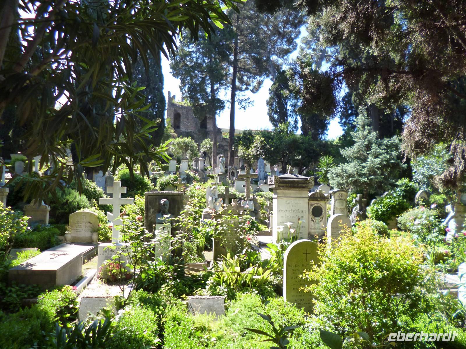 Nicht weit liegt die Cestiuspyramide, erbaut 12 vor Christi als Grabmal für einen römischen Prätor, der für die Festbankette verantwortlich zeichnete. Eingebaut in die Aurelianische Stadtmauer grenzt sie an den Nichtkatholischen Friedhof der Stadt. Als zu Beginn des 19. Jahrhunderts zwei Kinder des preußischen Gesandten Wilhelm von Humboldt in Rom starben, konnte der Diplomat dank seiner Kontakte als erster Nichtkatholik offiziell ein Stückchen Land an der Stadtmauer für die Grabstätten erwerben. Daraus entwickelte sich in den zwanziger Jahren des 19. Jahrhunderts ein Friedhof, auf dem Berühmtheiten wie Keats, Shelley und Goethes einziger Sohn August ihre letzte Ruhe fanden.
