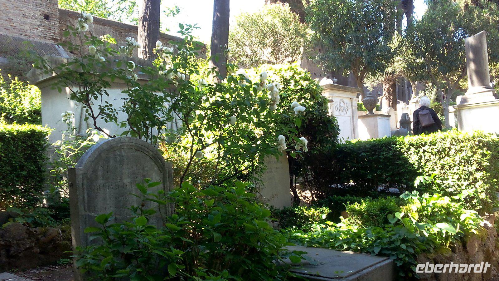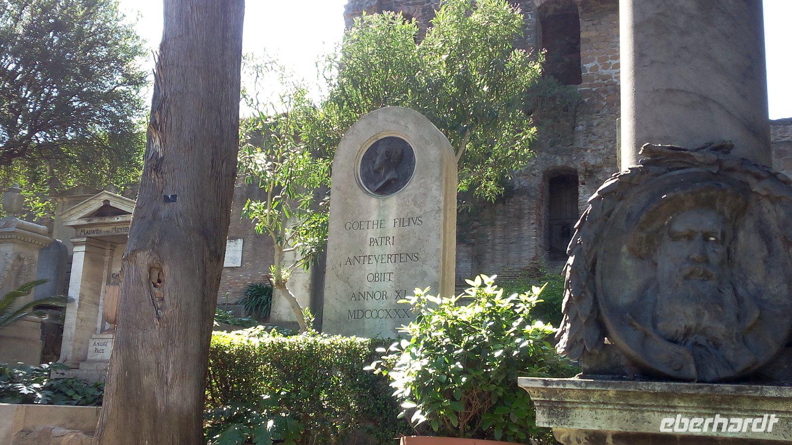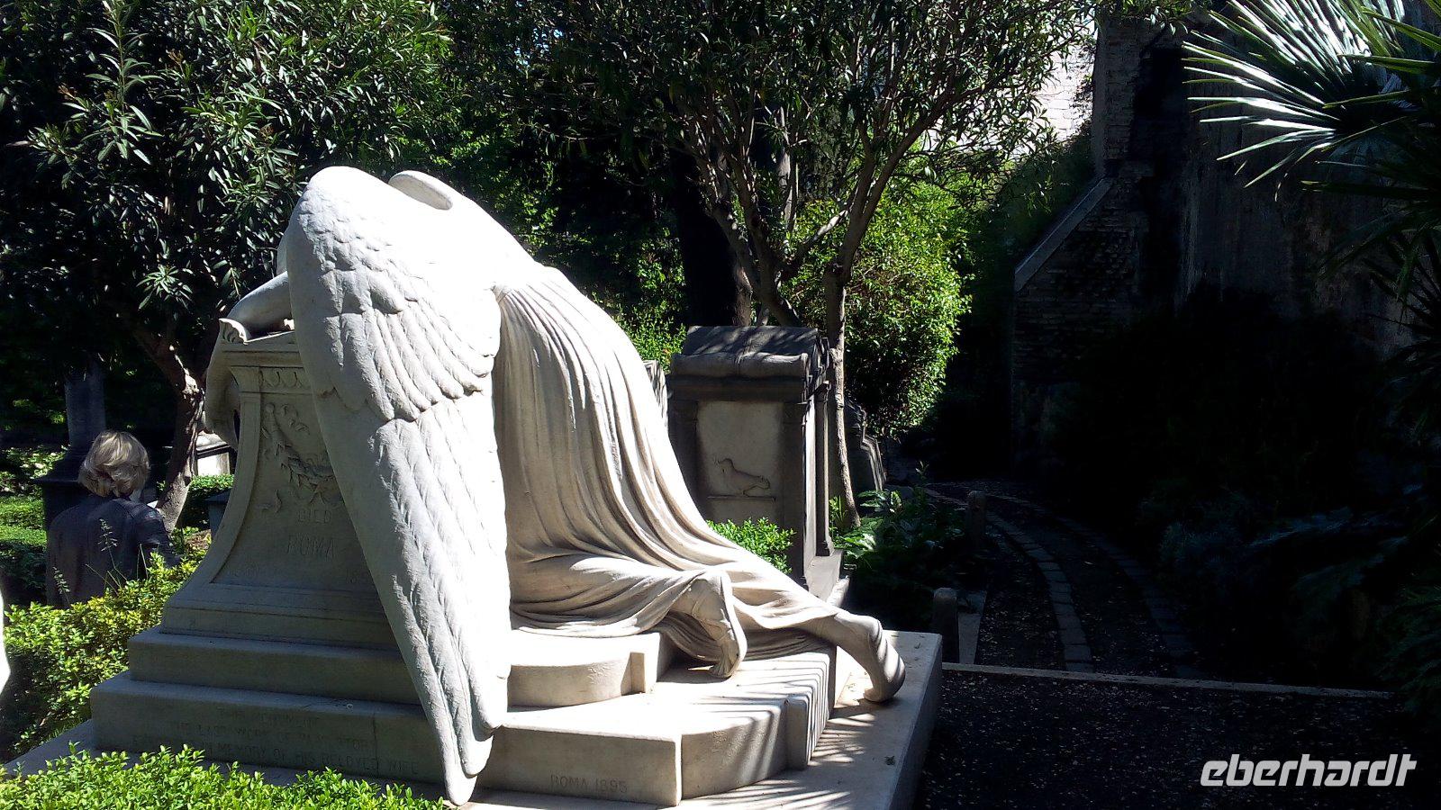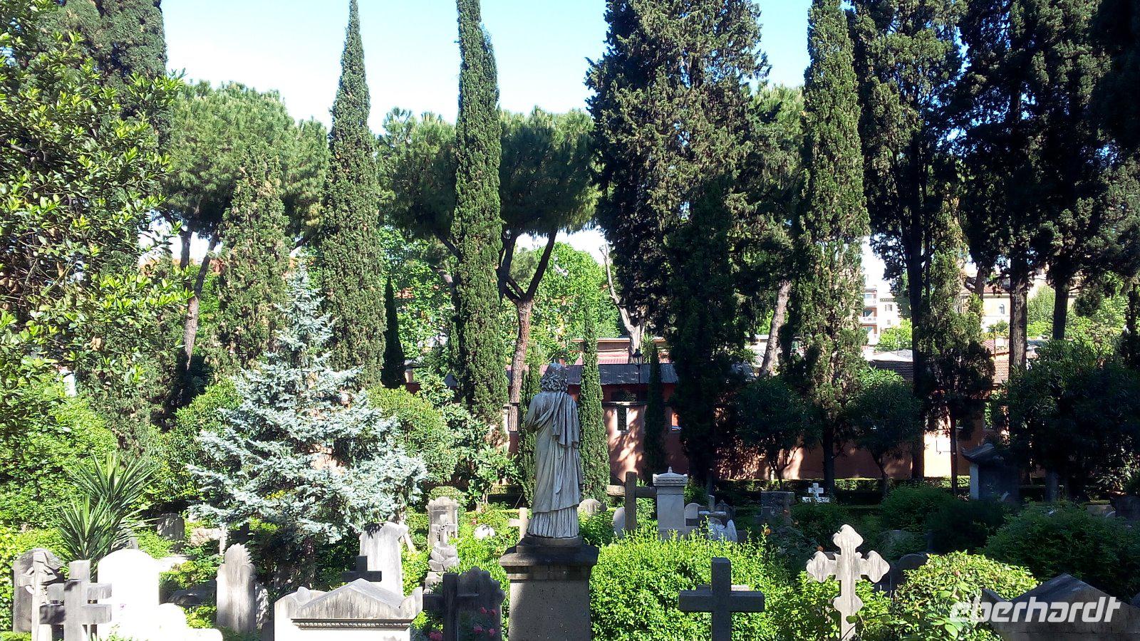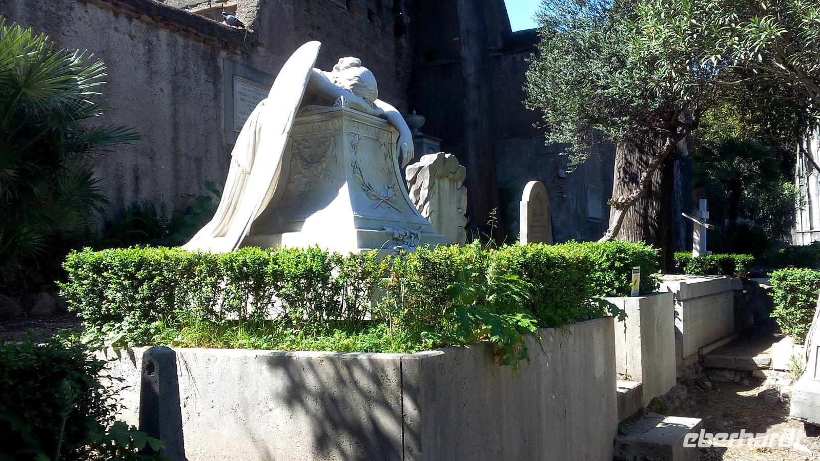 Mit der Buslinie 75 fahren wir zum Piazza Di Porta S.Paola(Pyramide) und spazieren von hieraus zum Nichtkatholischen Friedhof (Cimitero accatolico) Sylvia informiert, dass mit Aufkommen der Italiensehnsucht im 18. Jahrhundert verstärkt Ausländer nach Rom kamen, die nicht katholischen Glaubens waren, hier vor allem Engländer und Deutsche. Starben diese in Rom, durften sie nicht auf den allgemeinen Friedhöfen bestattet werden, Wir verweilen an den Gräbern von August Goethe(Sohn von Johann Wolfgang Goethe) und am Grab von Gottried Semper. Nach etwas Freizeit auf dem Friedhof der auch, wie die meisten Friedhöfe Ruhe ausstrahlt, treffen wir uns wieder am Ausgang. Wir haben heute noch weitere interessante Erkundungen auf dem Programm.