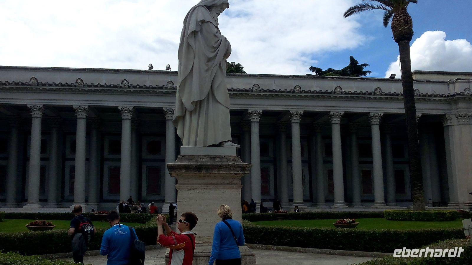 Wir treffen uns mit Agnieszka auf den Petersplatz. Zuvor quälen wir uns mit dem Bus 115 durch den Straßenverkehr der Stadt. Wir kommen aber noch rechtzeitig zur Papstaudienz. Es ist schon spannend zwischen dem internationalen Publikum auf dem Petersplatz zu sitzen. Bevor wir der Ansprache des Papstes Franziskus hören, fährt er eine Runde um den Petersplatz. Unmittelbar vor unserem Standort segnet er ein kleines Kind. Für uns war es Glück, diesen Moment so nah miterleben zu können. Gegen 11.00 treffen wir uns wieder und setzten unser Programm für heute fort. Wir spazieren zur Engelsburg, die 130 n. Chr. von Kaiser Hadrian als Mausoleum für sich und seine Nachfolger gebaut wurden. Mit dem Bau der Aurelianischen Stadtmauer wurde die Engelsburg in die Befestigungsmauer einbezogen und dank seiner strategischen Lage zur stärksten Festung Roms ausgebaut. Wir bestaunen diesen gewaltigen Bau und spazieren anschließend entlang der antiken Engelsbrücke, um zum Piazza Navoma zu gelangen. Dieser Platz ist für die Römer ein beliebter Treffpunkt und wir nutzen diesen Platz und die Seitengassen, um die gute italienische Küche zu probieren. Bevor wir unseren Spaziergang durch Rom fortsetzen, erklärt uns Agnieszka noch, dass unter unseren Füßen das Stadion des Dominitian war. Zum Abschluss unser heutigen Programms besuchen wir einen allen Göttern des Olymps geweihten Tempel.