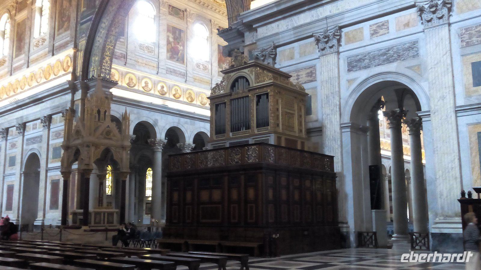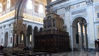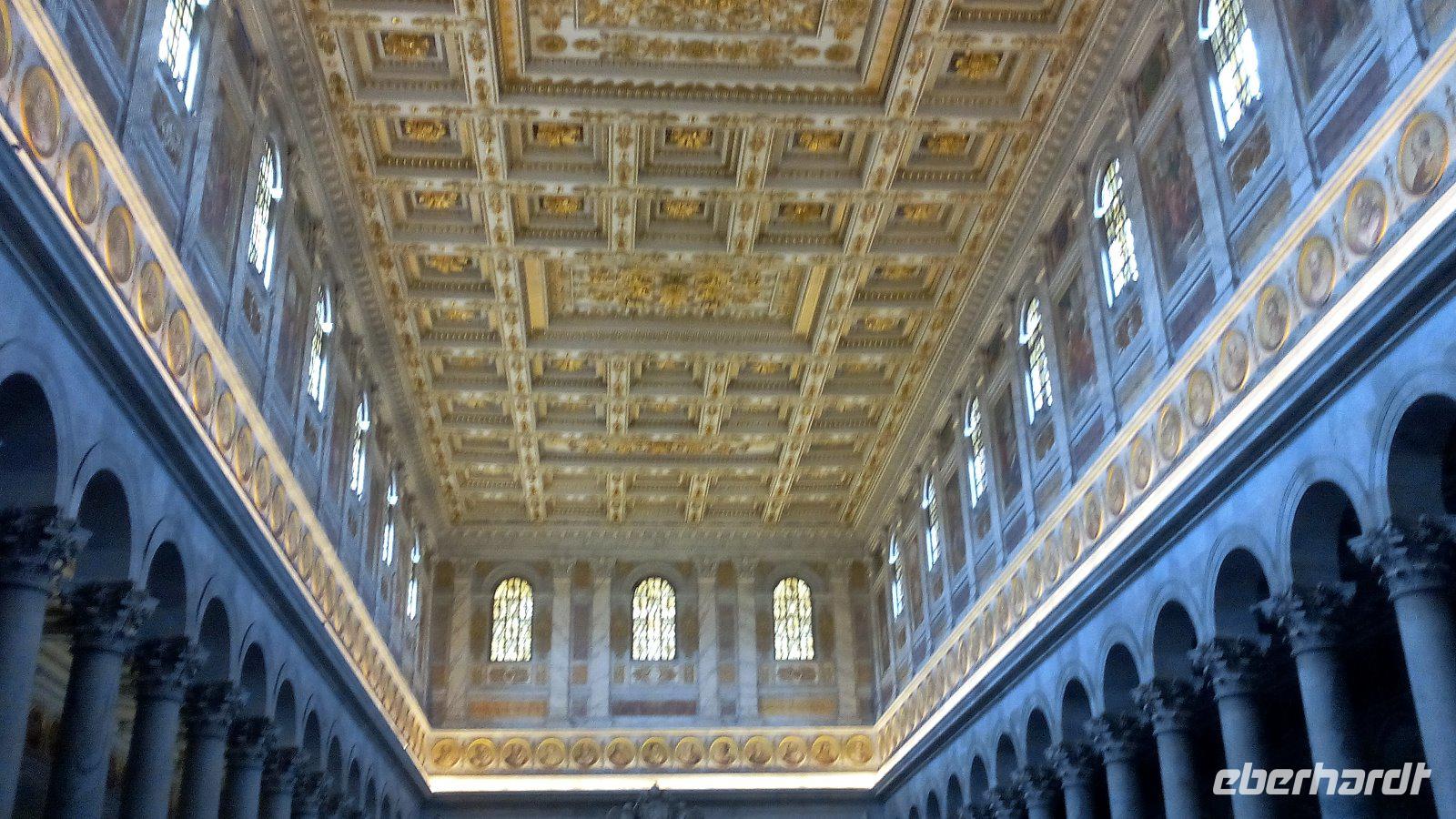 der sieben Pilgerkirchen, die es in Rom gibt. Ein beeindruckendes Bauwerk. Wir erfahren von Sylvia, dass die erste Paulus-Basilika im Auftrag von Kaiser Konstantin über dem vermeintlichen Grab des Apostels Paulus errichtet wurde, die heutige Kirche aber von 1823-1854 errichtet wurde. Sehr beeindruckt uns das Apsismosaik aber auch das Paulusgrab. Erst 2006 gaben vatikanische Archäologen bekannt, dass sie das Grab Paulus entdeckt hätten. Ob es aber wirklich Paulus ist, bleibt eine Glaubensfrage. Auch für uns.