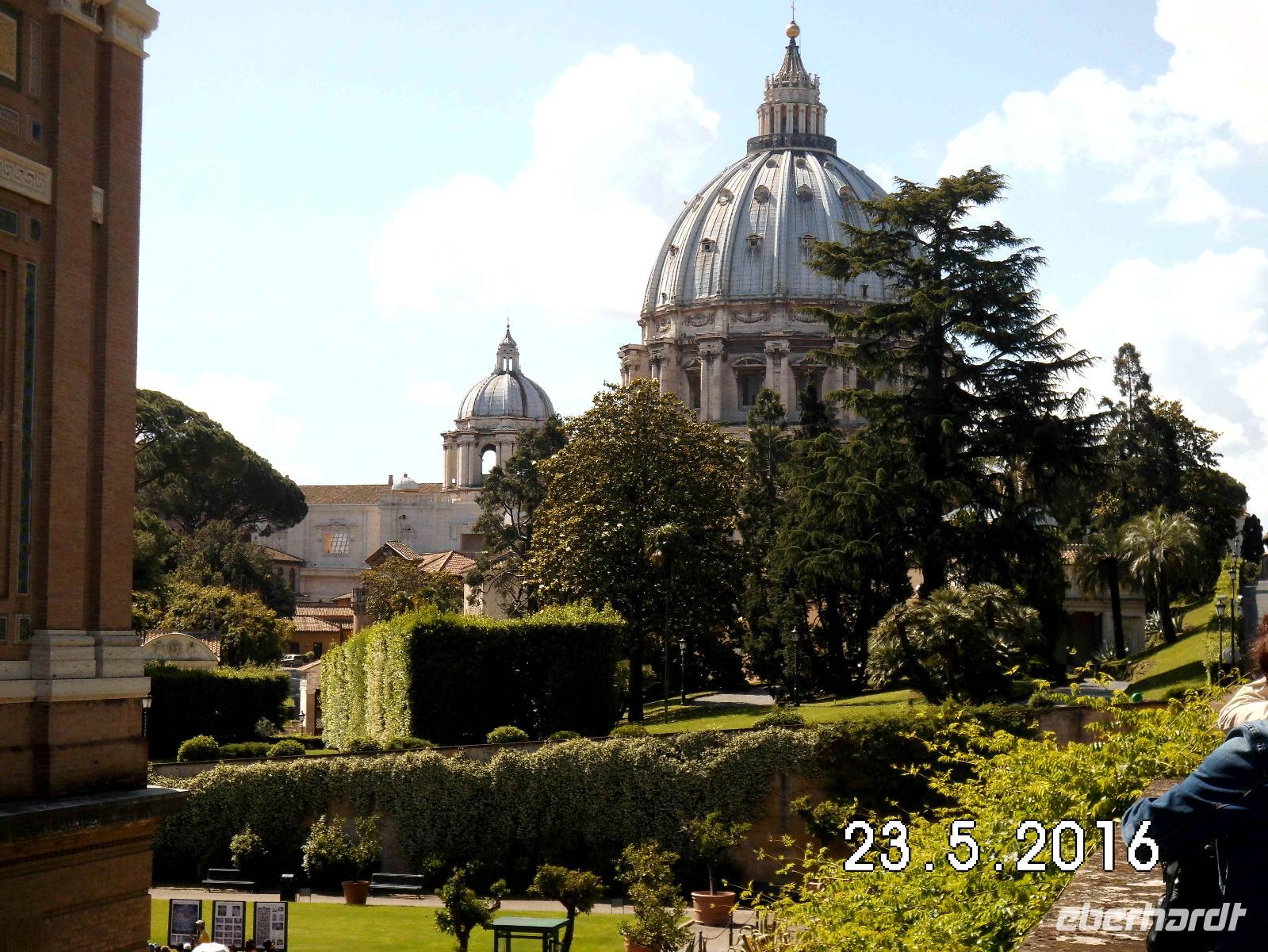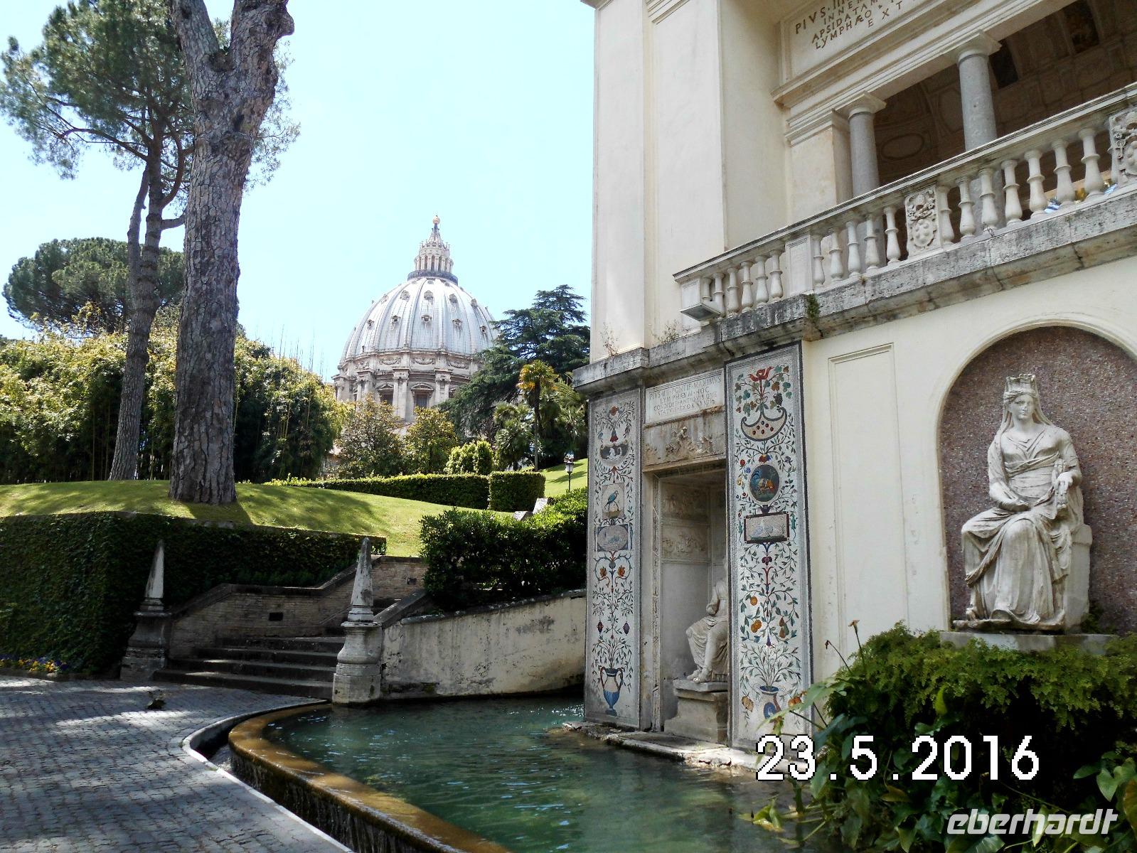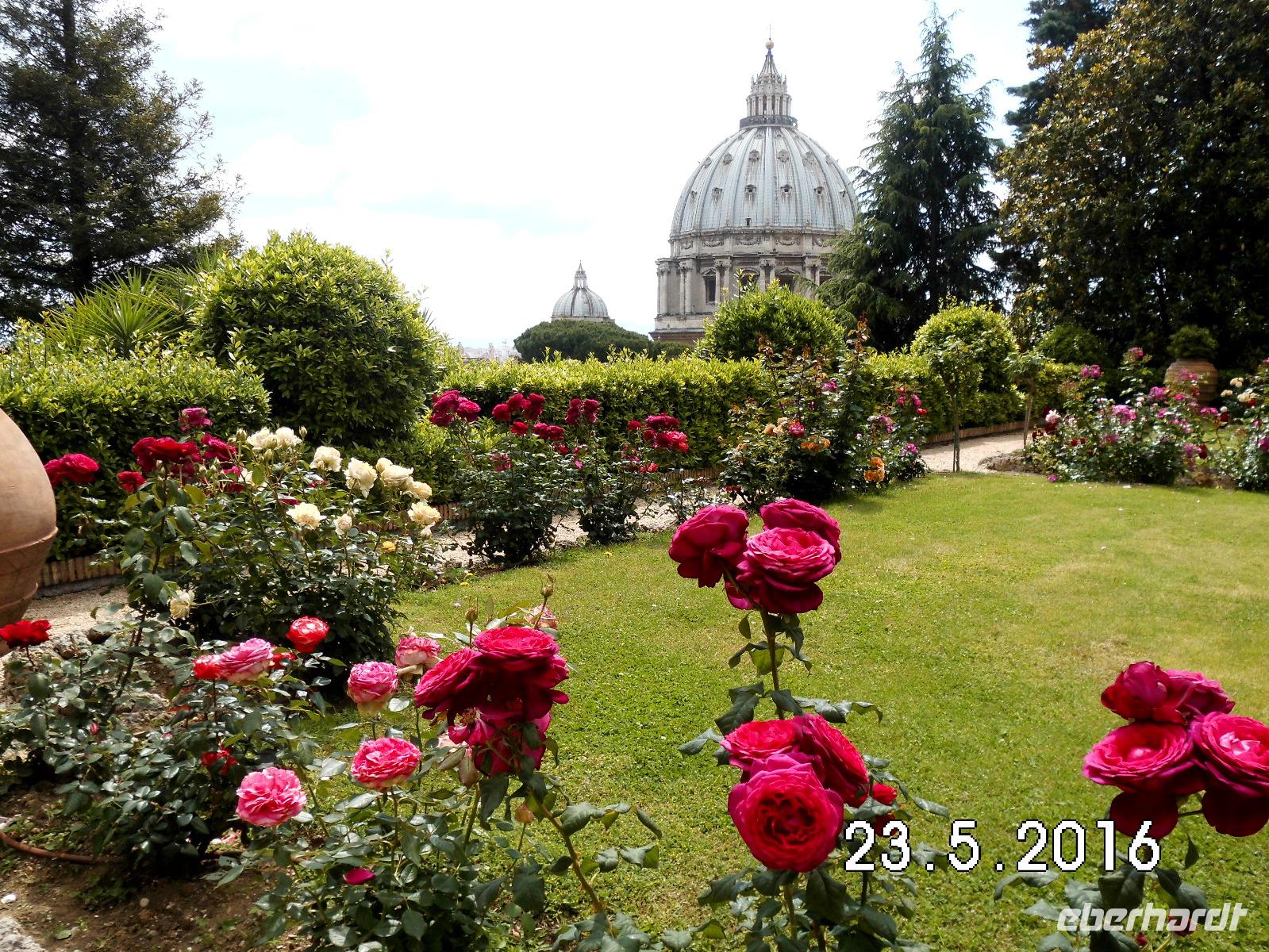 Dieser Tag war wohl für die Gäste, die den fakultativen Tag gebucht hatten. ein Höhepunkt unserer Romreise .Die S-Bahn brachte uns in die Nähe der Vatikanischen Museen, wo wir von unserer Führerin durch die Gärten schon erwartet wurden. Durch die unterschiedliche Gestaltung der Gärten erhielten wir einen Eindruck vom jeweiligen Zeitgeschmack und auch den der jeweiligen Päpste. Sogar die Nester von grünen Papageien konnten wir in den Palmen entdecken .Zur Mittagspause fanden wir ein kleines Cafe im Hof der Vatikanischen Museen. Dann zeigte uns Malte die wichtigsten Skulpturen -darunter die berühmte Laokoon-Gruppe-, kunstvoll gestaltete flämische Wandteppiche und Landkarten, welche die den Römern damals bekannte Welt zeigen. Auch die gewaltige Größe der Peterskirche und ihre architektonische Schönheit fanden unsere Bewunderung. Wer mochte, konnte danach noch den Ausblick von der Kuppel genießen.