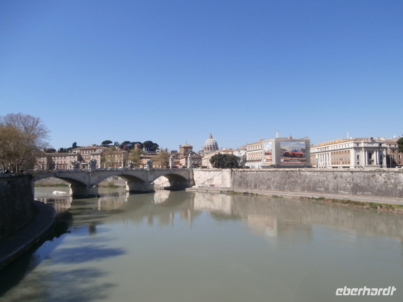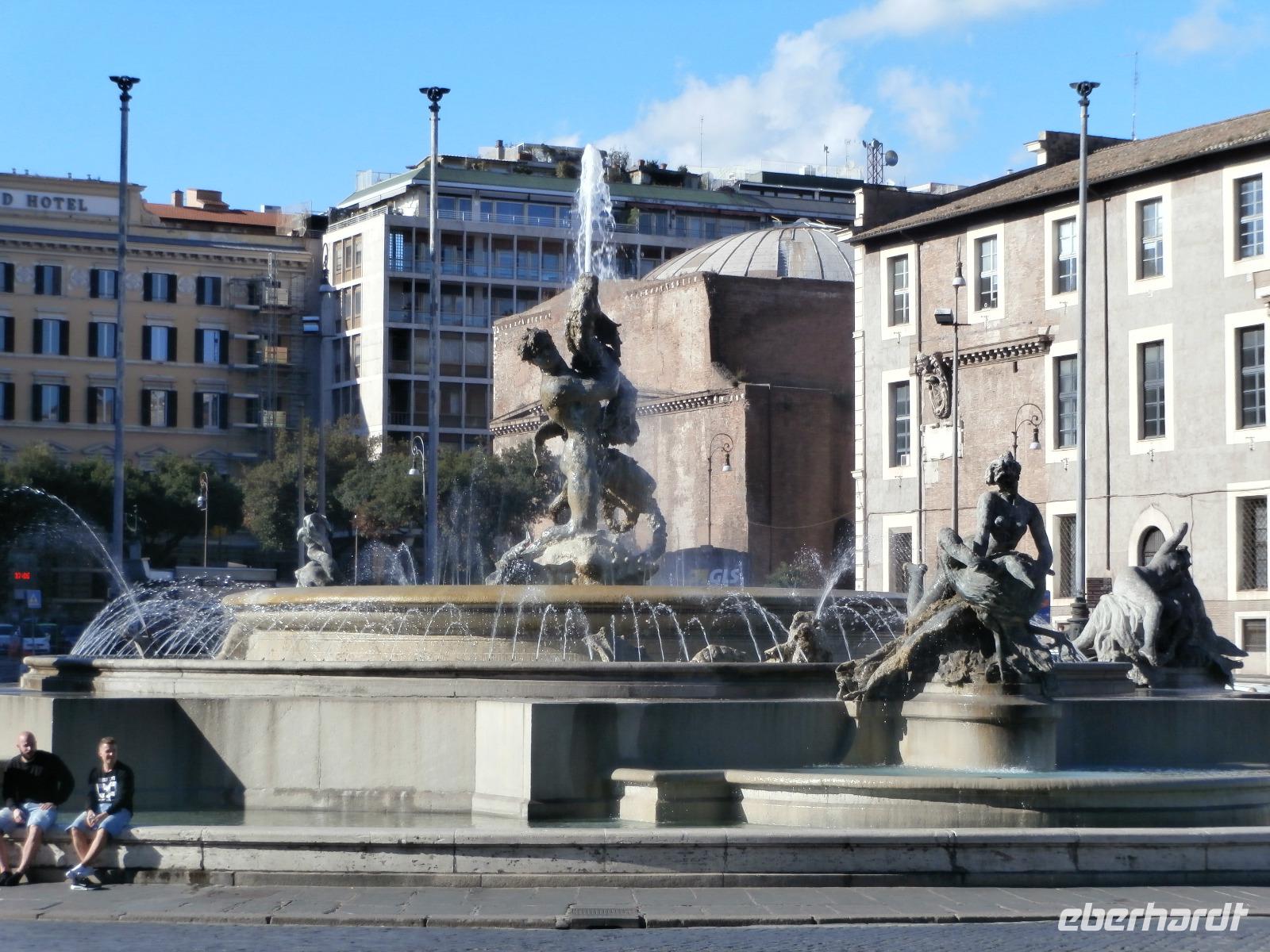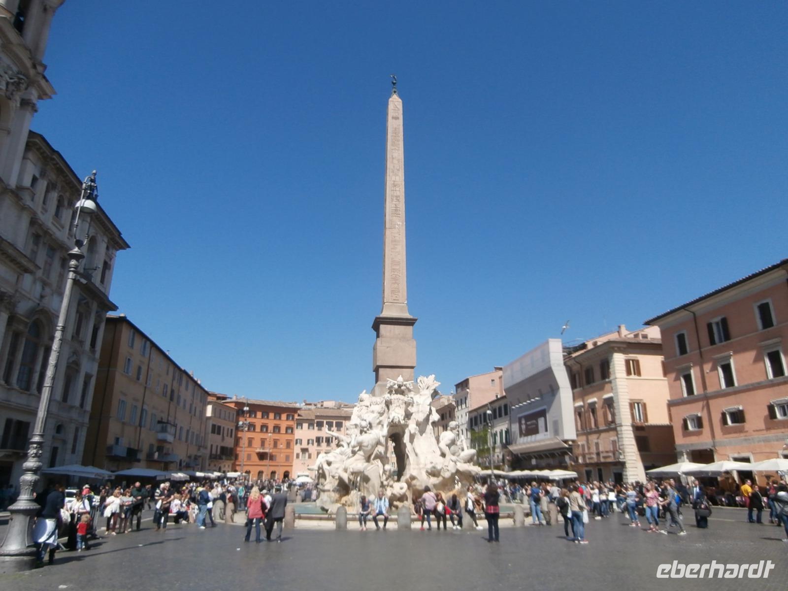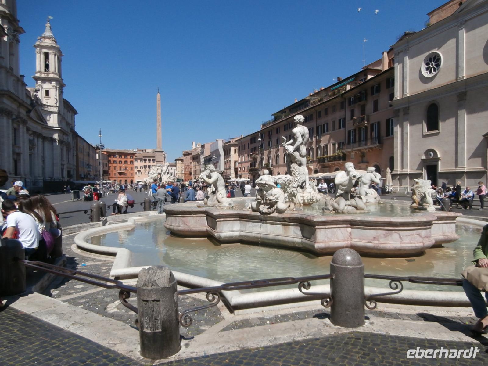 Wir nehmen den Weg entlang des Passetto di Borgo, dem Straßenviertel entlang der Mauer, die der Fluchtweg der Päpste war. An der Engelsburg, die wir nun von außen bewundern, hören wir viel vom Kaiser Hadrian, es war mal seine Grabstätte. Benannt wird die Festung nach dem Erzengel Michael, der auf der Spitze dieser Anlage thront. Die herrliche Aussicht über den Tiber bis hinüber zum Petersdom und den Hügeln Roms sind überwältigend. Über die Ponte Sant' Angelo queren wir den Tiber. Durch enge Gassen gelangen wir zum Wohnzimmer der Römer, zum Piazza Navona. Hier steht in der Mitte des Platzes der Vier Ströme Brunnen, den noch ein Obelisk schmückt. An beiden Enden des Platzes gibt es noch 2 Brunnen. Unsere Mittagspause legen wir hier ein, viele kleine Restaurants laden dazu ein.