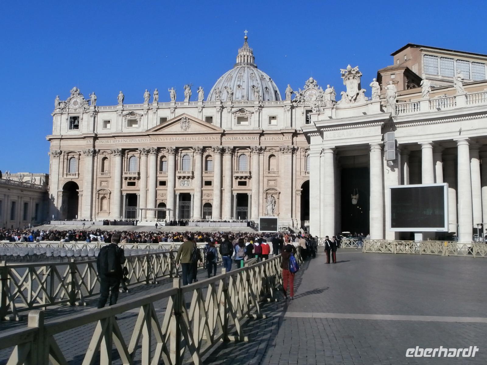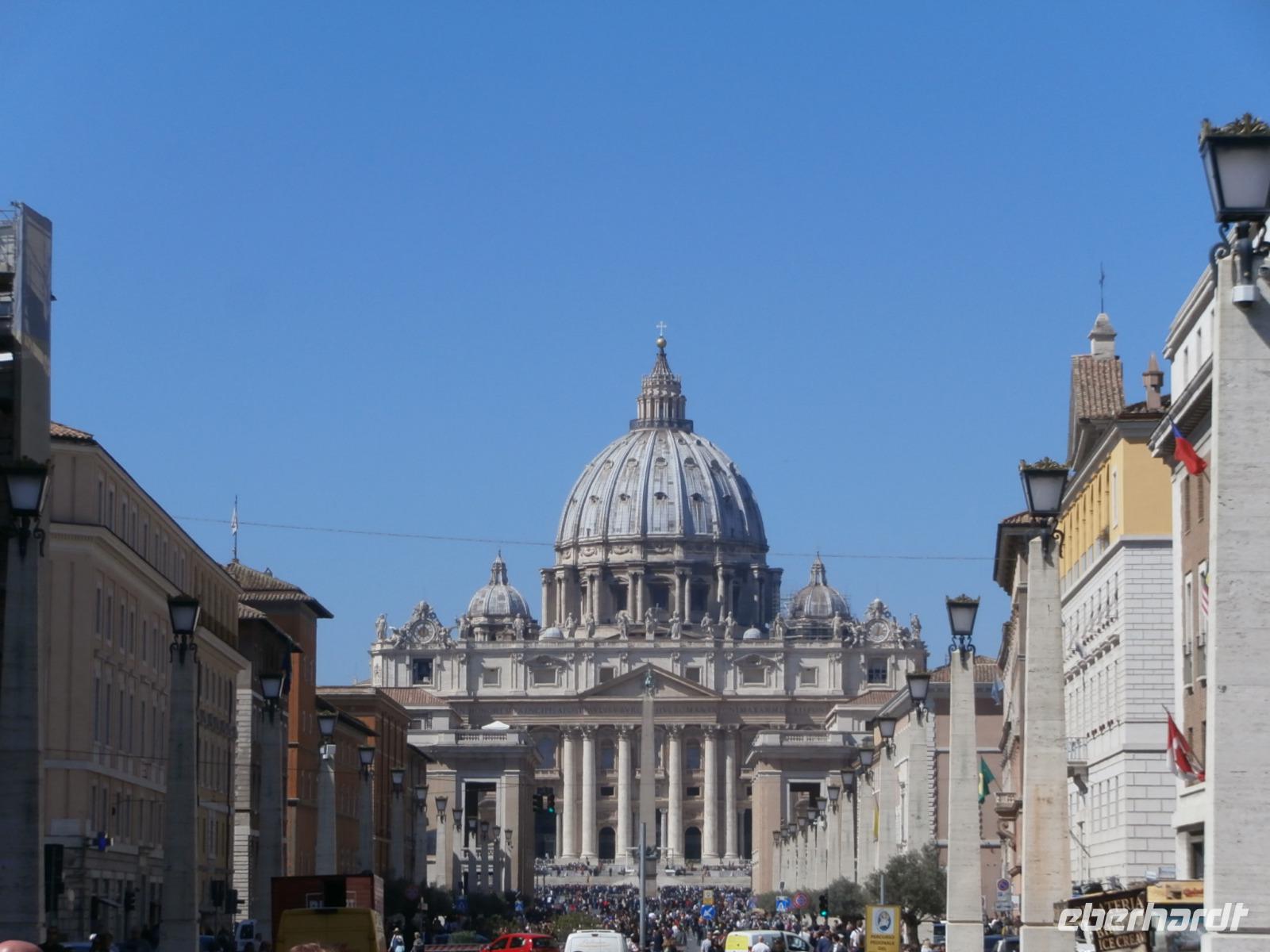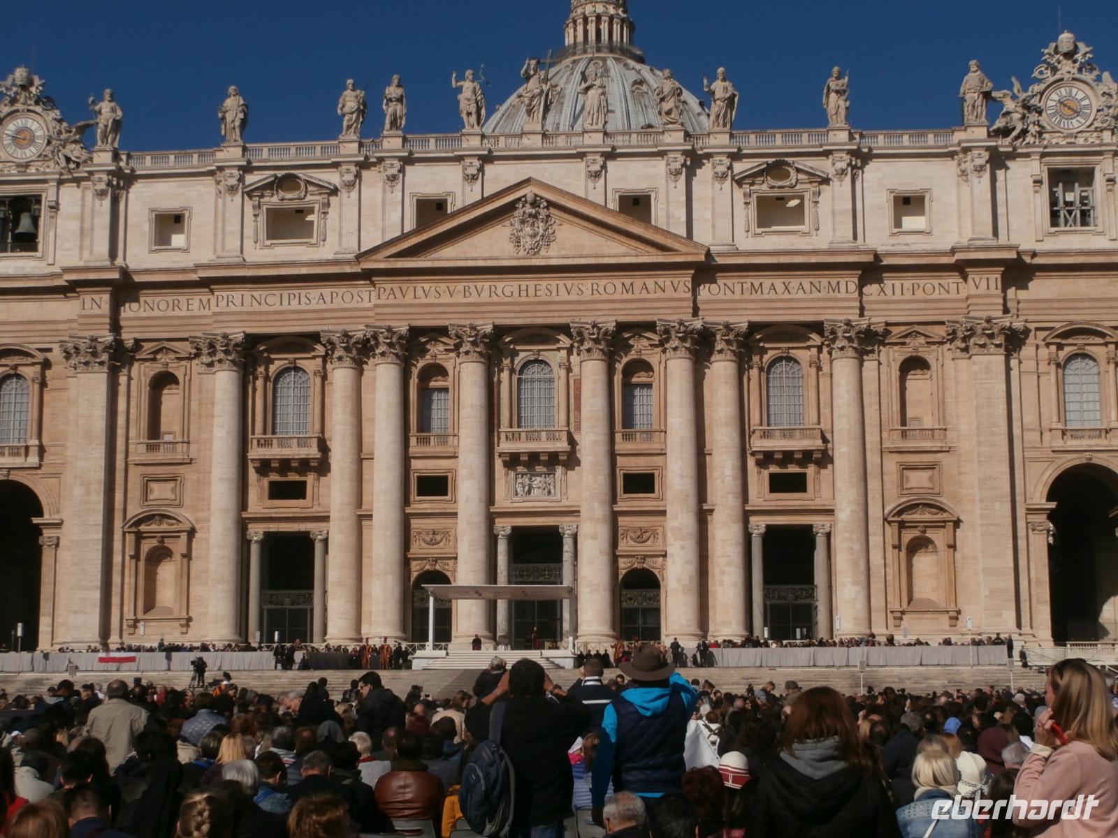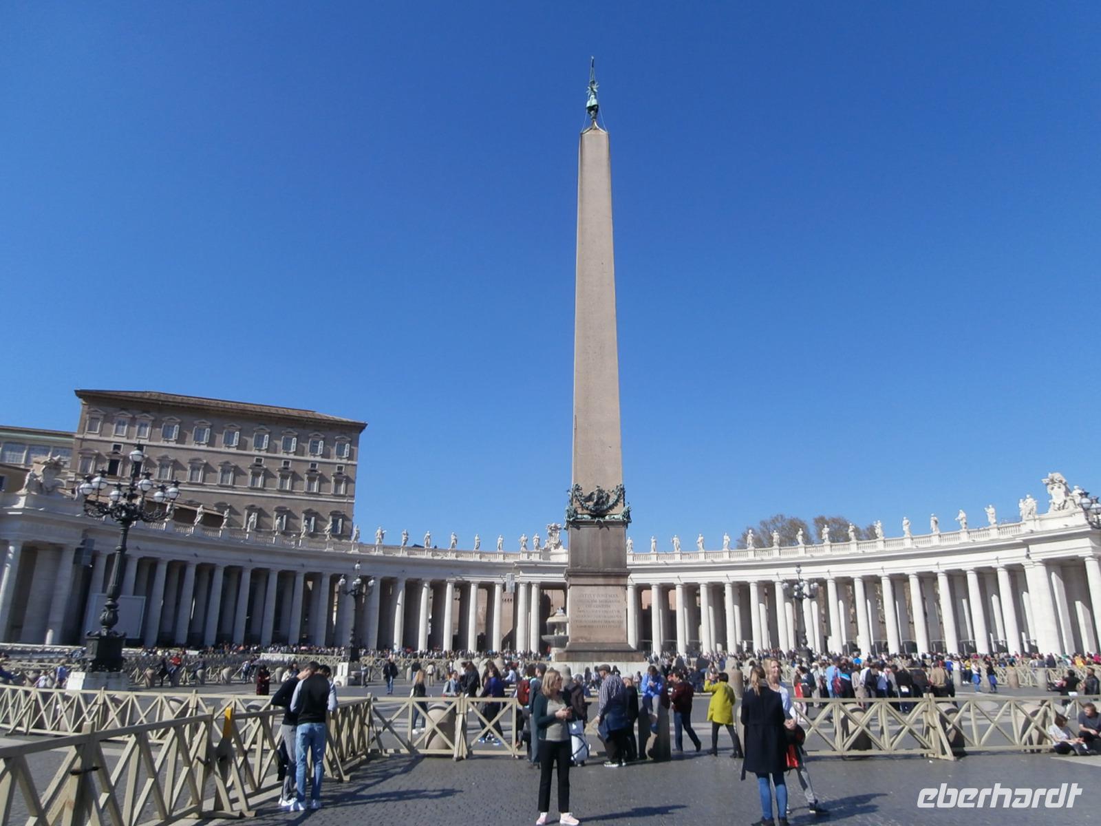 Die Gesamtanlage des Petersplatzes, der übrigens den Grundriss eines auf den Kopf gestellten Schlüssellochs hat und von Bernini entworfen wurde, beschreiten wir zum Teil beim Verlassen des Petersdomes.