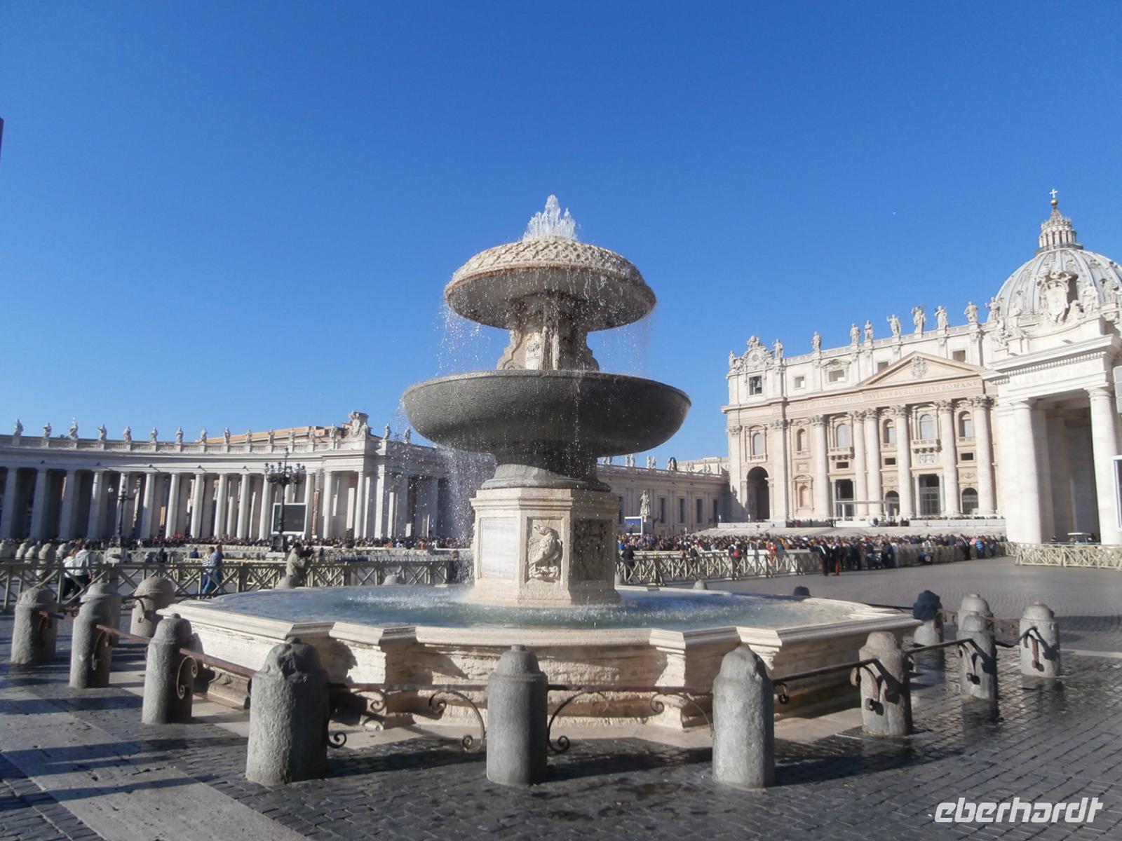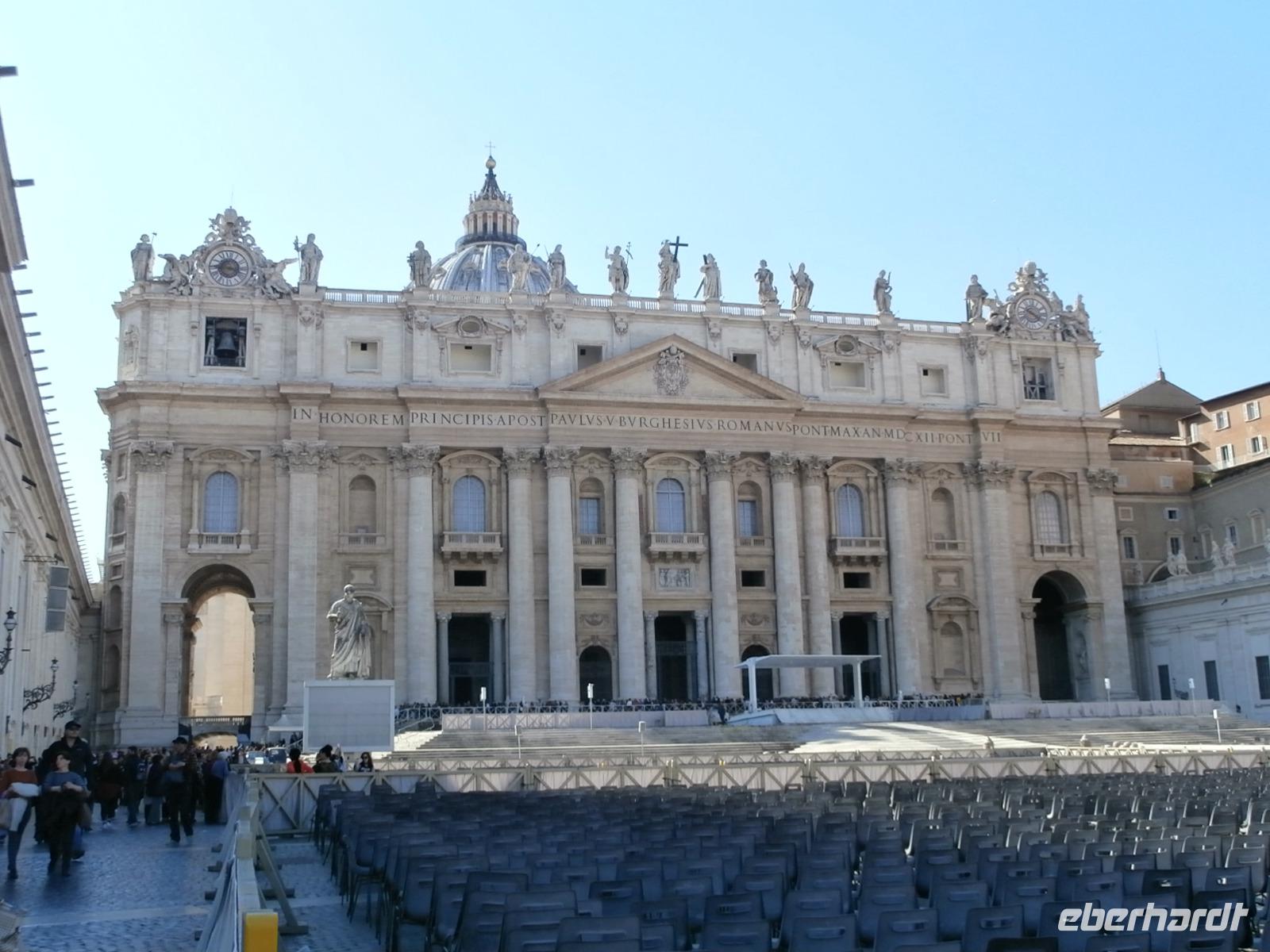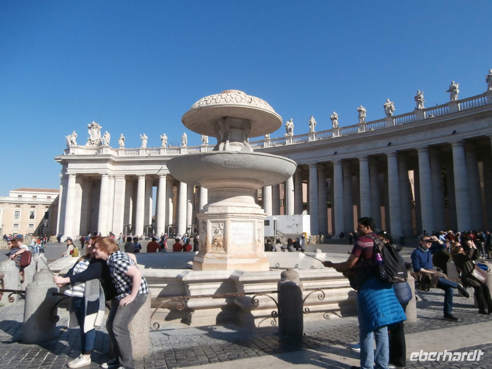 Die Gesamtanlage des Petersplatzes, der übrigens den Grundriss eines auf den Kopf gestellten Schlüssellochs hat und von Bernini entworfen wurde, beschreiten wir zum Teil beim Verlassen des Petersdomes.