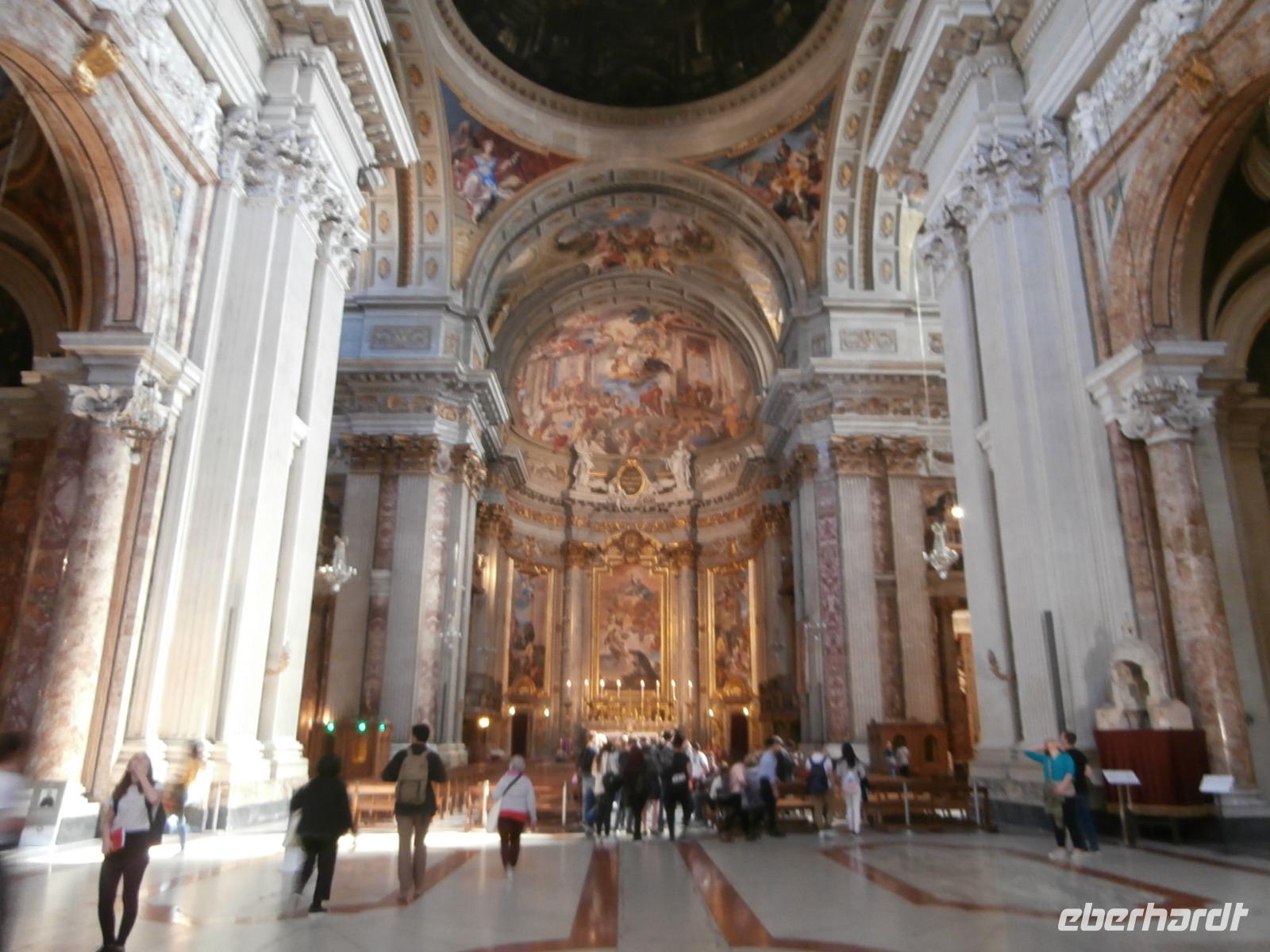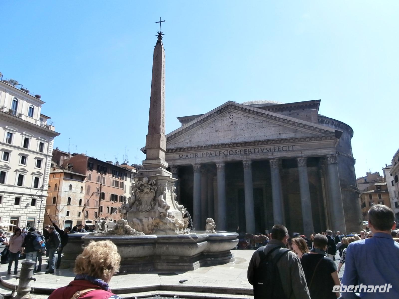 Das Pantheon sehen wir als nächstes Kunstobjekt, einst Tempel und später Kirche, ist es neben dem Kolosseum das besterhaltene Bauwerk der Antike. Immer noch faszinierend sind der harmonische Innenraum und die perfekt proportionierende Kuppel. Einzige Lichtquelle ist die 9 m große unverglaste Öffnung im Scheitelpunkt der Kuppel. Abschluss unseres heutigen Tagesprogrammes ist die Besichtigung der nahegelegene Kirche St. Ignatius von Loyola. Sie ist die zweitgrößte Jesuitenkirche Roms und Grabstätte eines Papstes und von drei Heiligen. Nach der Verabschiedung von Agnieszka geht es heute mit dem Bus 63 zum Hotel zurück.