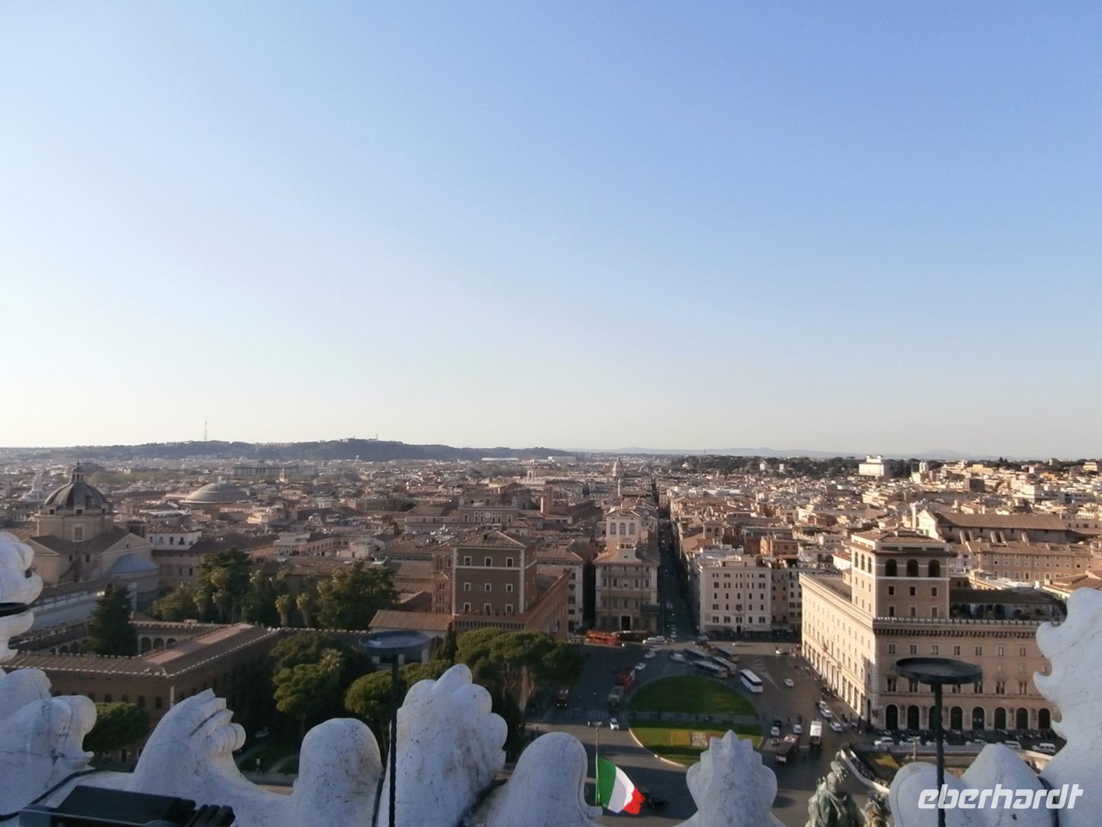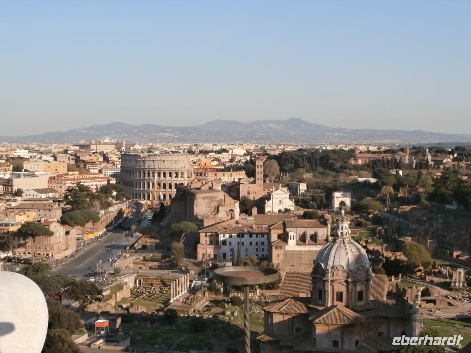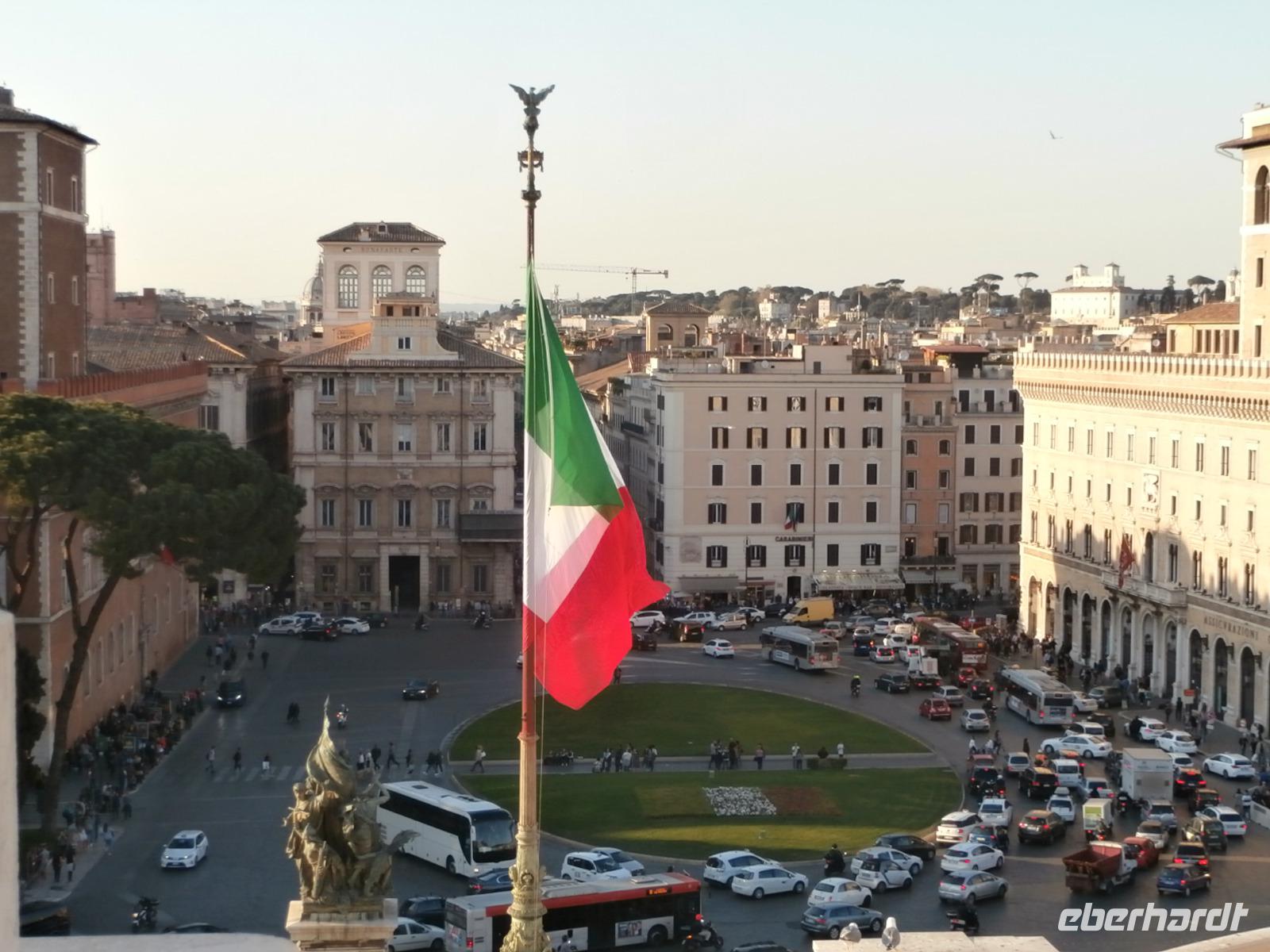 Am Monumento a Vittorio Emanuele II. treffen wir uns am Abend zum Stadtspaziergang mit Agnieszka. Mit einem 360-Grad-Blick über das antike Rom und die Altstadt bis hin zu den Albaner Bergen, werden wir von der Terrasse auf 70 m Höhe belohnt. Weiter führt uns Agnieszka vorbei am Marcellus Theater über den Tiber bis ins ursprüngliche Rom, nach Trastevere. Hier endet die Blaue Stunde und unsere Rom Reise intensiv. Mit dem Bus fahren wir gemeinsam zum Empire Palast Hotel zurück. Im Hotel Restaurant nehmen wir unser Abendessen ein, mit einem neuen Menü erwartet uns die Mannschaft. Es ist alles sehr schmackhaft und schön hergerichtet. Müde fallen wir heute in die Betten. Schön war auch dieser letzte Tag unseres intensiven Aufenthaltes in Rom.