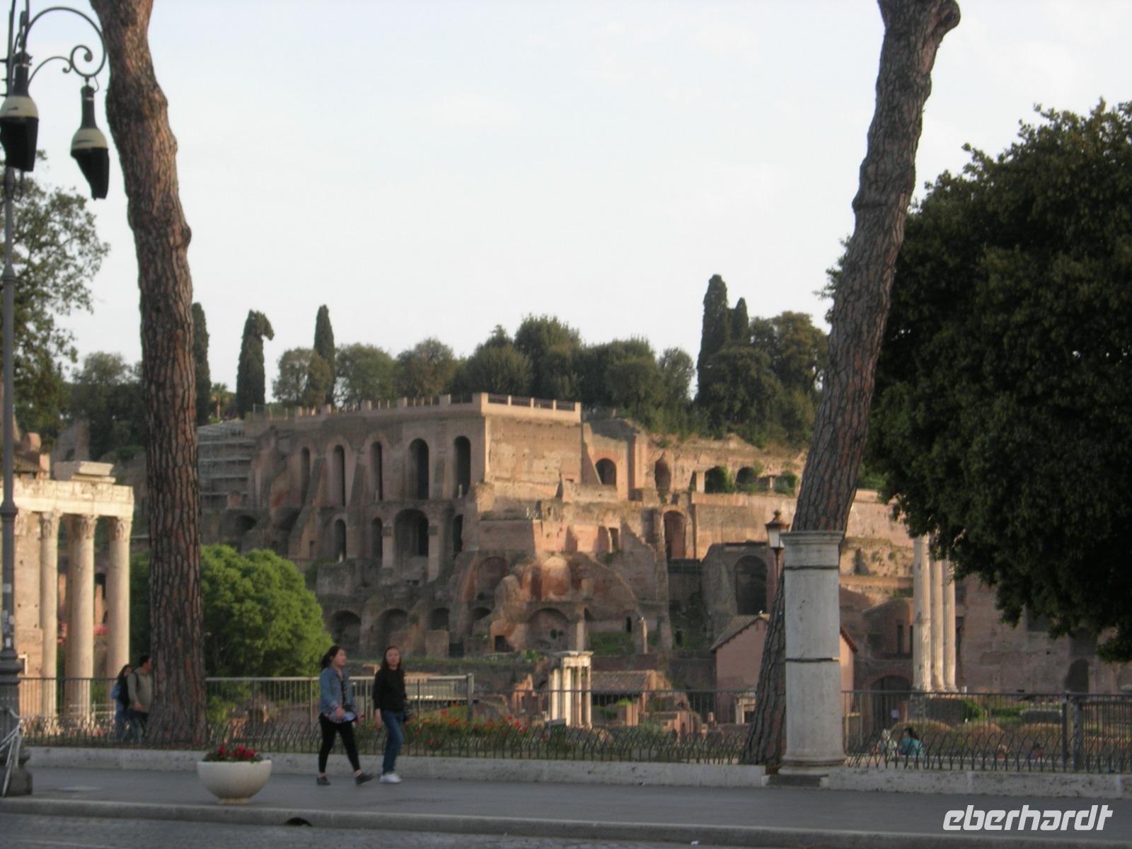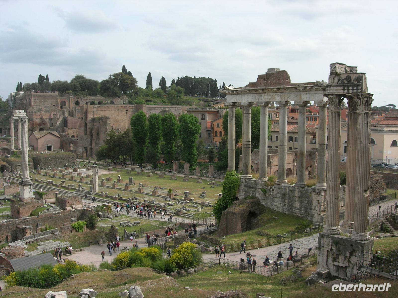 Nach diesen großartigen Eindrücken setzten wir unsere Wanderung durch das antike Rom auf dem Forum Romanum fort. Wir betrachten den Titusbogen, der unter Kaiser Domitian zu Ehren seines Bruders Titus errichtet wurde, dessen Siege in Judäa mit der Eroberung Jerusalems und der Plünderung des jüdischen Tempels endete. Wir staunten über die drei riesigen Tonnengewölbe der Basilika des Konstantin und Maxentius und bewunderten die Säulenfront des Tempels, den Kaiser Antonius Pius zu Ehren seiner Frau Faustina errichtet hatte und hinter der in der Barockzeit eine Kirche erbaut wurde. Ein Blick hinauf zum einstigen Senatorenpalast, dem heutigen Sitz der Bürgermeisterin von Rom, schloss unseren Rundgang über das Forum Romanum ab.