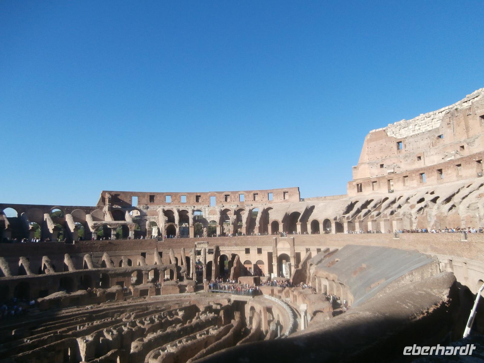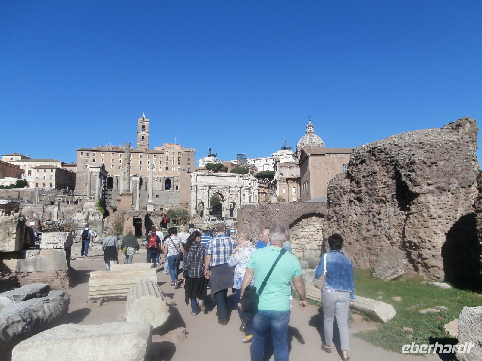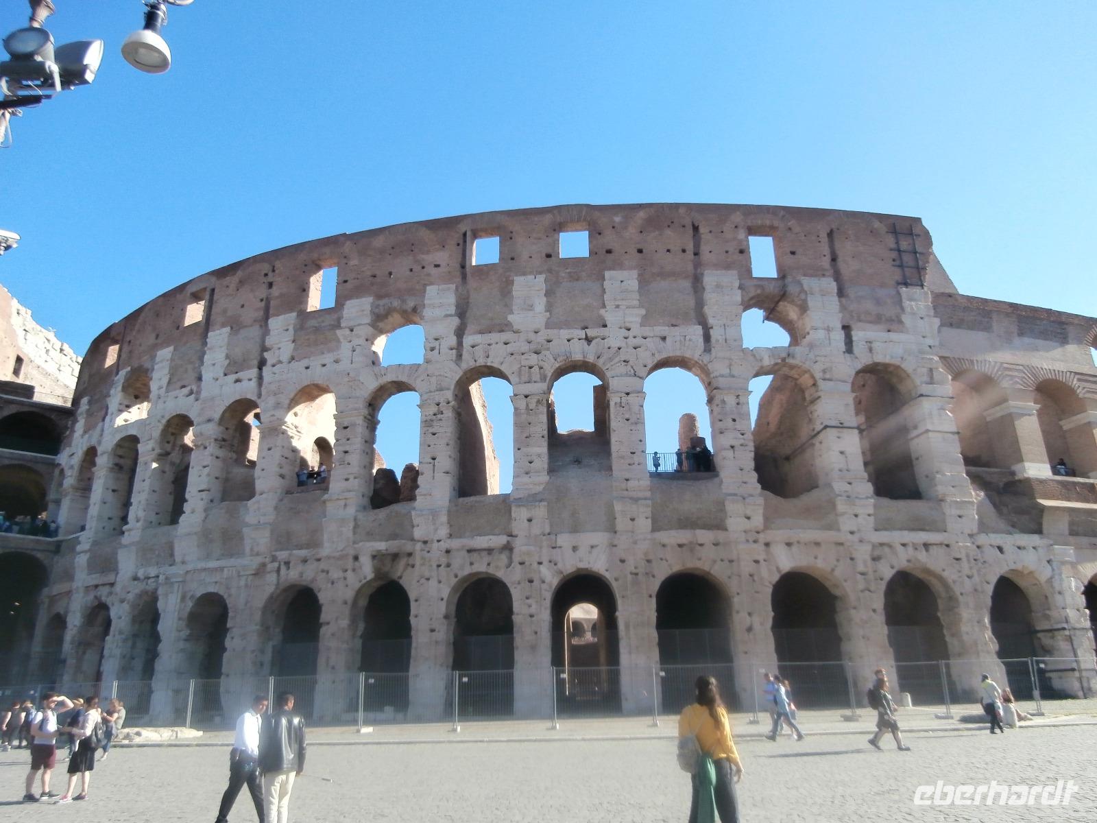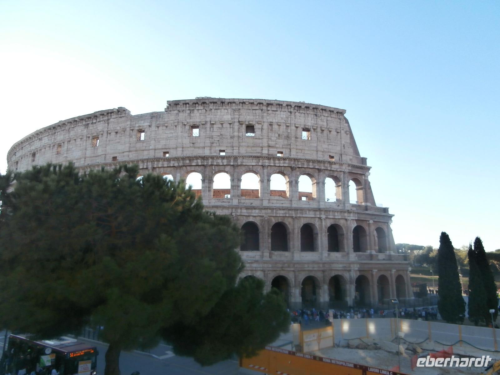 Gemeinsam fahren wir am Morgen mit dem Bus Nr. 75 in Nähe vom Hotel ab. Ingrid hat zuvor im Hotel an alle die Audioguids ausgegeben und mit uns getestet. Am Kolosseum werden wir von Sylvia, unserer örtlichen Reiseleitung, erwartet. Wir gehen zuerst ins Kolosseum, hier erfahren wir viel über die Tierkämpfe und Gladiatoren. Wir sind begeistert vom Erhalt der Anlage. Vorbei am Konstantinbogen gehen wir hinüber bis zum Forum Romanum, welches von vielen Säulen, Bögen und Tempeln reichlich zum Staunen und Sehen bietet. Den Titus Bogen halten wir fotografisch fest. Weiter gehen wir zum Piazza Venezia. Das Nationaldenkmal Emanuele II. sehen wir von der Seite. In einem Restaurant hat Sylvia für uns alle Plätze zur Mittagszeit bestellt. Sommerliche Temperaturen lassen uns schwitzen. Mit dem Bus fahren wir am Nachmittag zur Pyramide und sehen uns in nächster Nähe den Nichtkatholischen Friedhof an. Gottfried Semper, der Baumeister der Semper Oper in Dresden, ist hier beerdigt. Eine grüne Oase der Stille ist dieser Ort. Nochmals benutzen wir den Bus für unsere Fahrt zur Kirche St. Paul vor den Mauern. Ein Wald aus 80 Säulen trägt die fünf Schiffe dieser Basilika, gestiftet 386 über dem Grab des Apostels Paulus. Porträts aller bisherigen Päpste sind oberhalb der Säulen zu sehen. Der Tag unterwegs im antiken Rom ist schön aber auch anstrengend gewesen. Mit Metro und Bus fahren wir gemeinsam zum Hotel zurück.