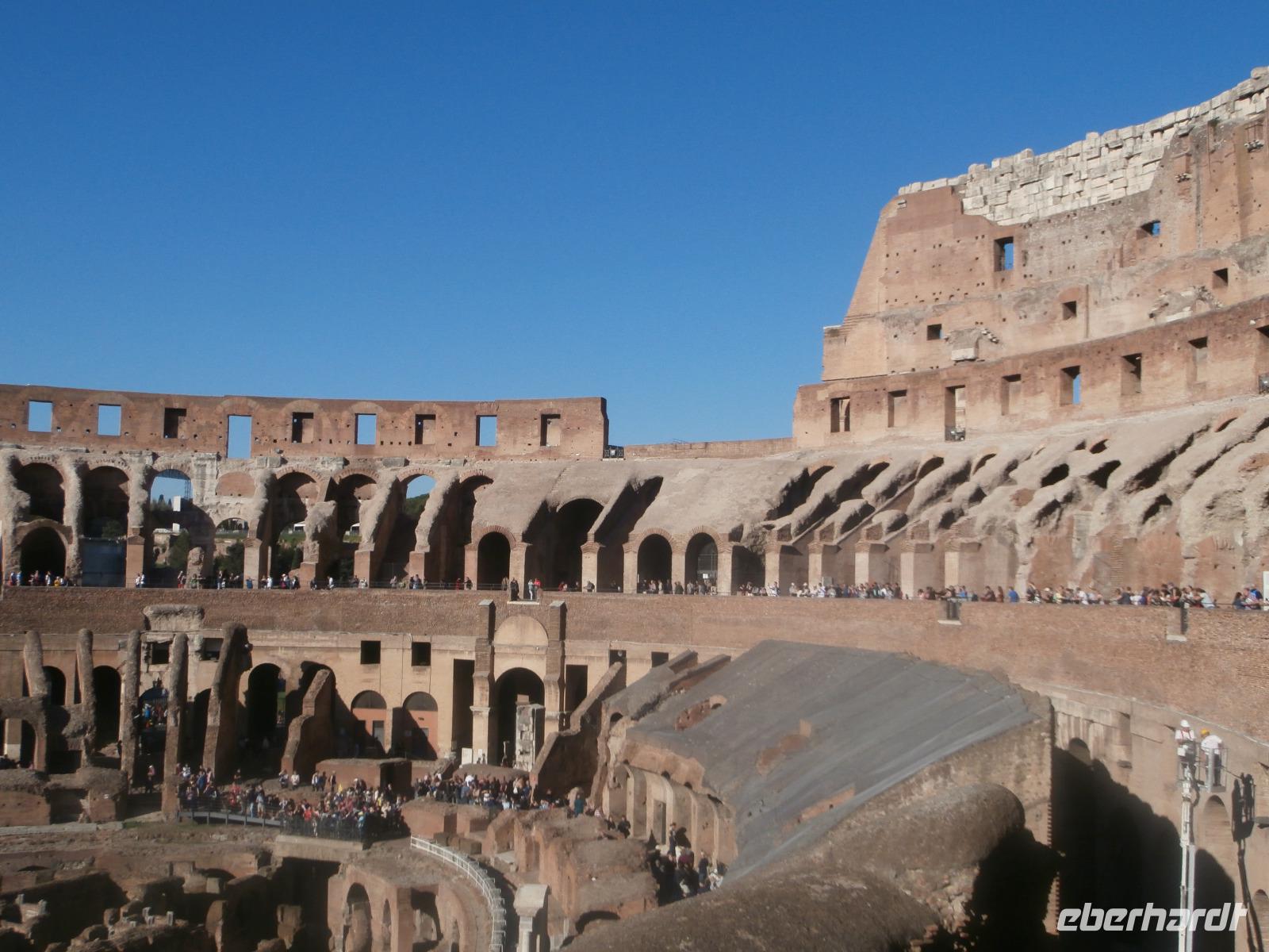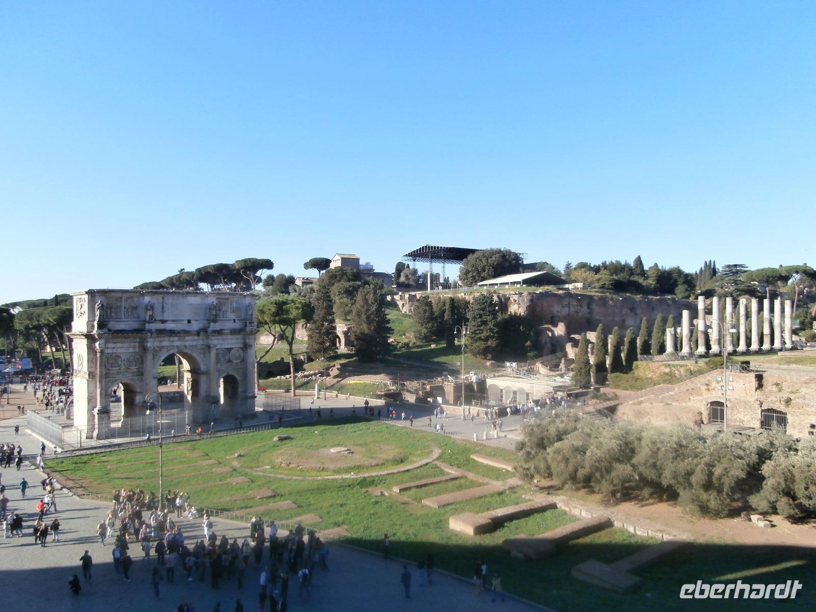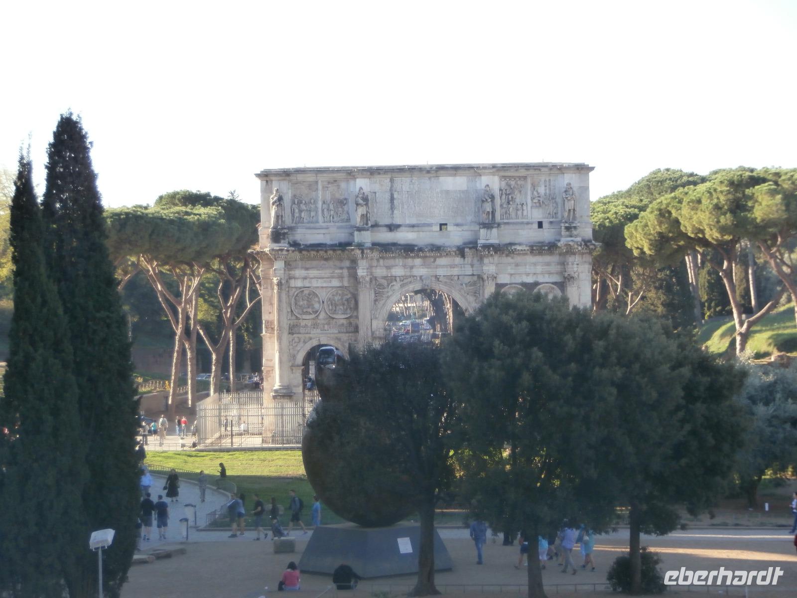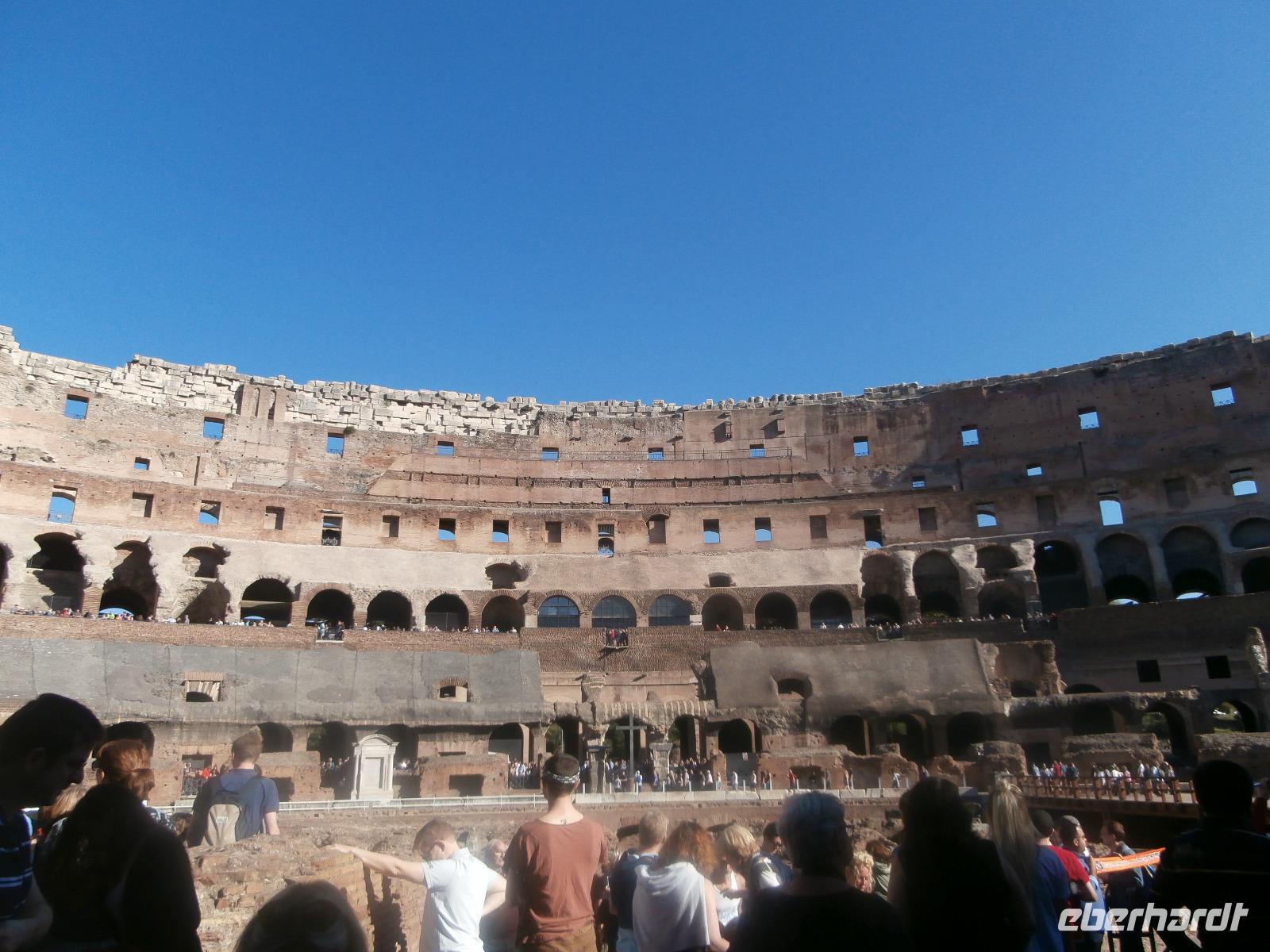 Gemeinsam fahren wir am Morgen mit dem Bus Nr. 75 in Nähe vom Hotel ab. Ingrid hat zuvor im Hotel an alle die Audioguids ausgegeben und mit uns getestet. Am Kolosseum werden wir von Sylvia, unserer örtlichen Reiseleitung, erwartet. Wir gehen zuerst ins Kolosseum, hier erfahren wir viel über die Tierkämpfe und Gladiatoren. Wir sind begeistert vom Erhalt der Anlage. Vorbei am Konstantinbogen gehen wir hinüber bis zum Forum Romanum, welches von vielen Säulen, Bögen und Tempeln reichlich zum Staunen und Sehen bietet. Den Titus Bogen halten wir fotografisch fest. Weiter gehen wir zum Piazza Venezia. Das Nationaldenkmal Emanuele II. sehen wir von der Seite. In einem Restaurant hat Sylvia für uns alle Plätze zur Mittagszeit bestellt. Sommerliche Temperaturen lassen uns schwitzen. Mit dem Bus fahren wir am Nachmittag zur Pyramide und sehen uns in nächster Nähe den Nichtkatholischen Friedhof an. Gottfried Semper, der Baumeister der Semper Oper in Dresden, ist hier beerdigt. Eine grüne Oase der Stille ist dieser Ort. Nochmals benutzen wir den Bus für unsere Fahrt zur Kirche St. Paul vor den Mauern. Ein Wald aus 80 Säulen trägt die fünf Schiffe dieser Basilika, gestiftet 386 über dem Grab des Apostels Paulus. Porträts aller bisherigen Päpste sind oberhalb der Säulen zu sehen. Der Tag unterwegs im antiken Rom ist schön aber auch anstrengend gewesen. Mit Metro und Bus fahren wir gemeinsam zum Hotel zurück.