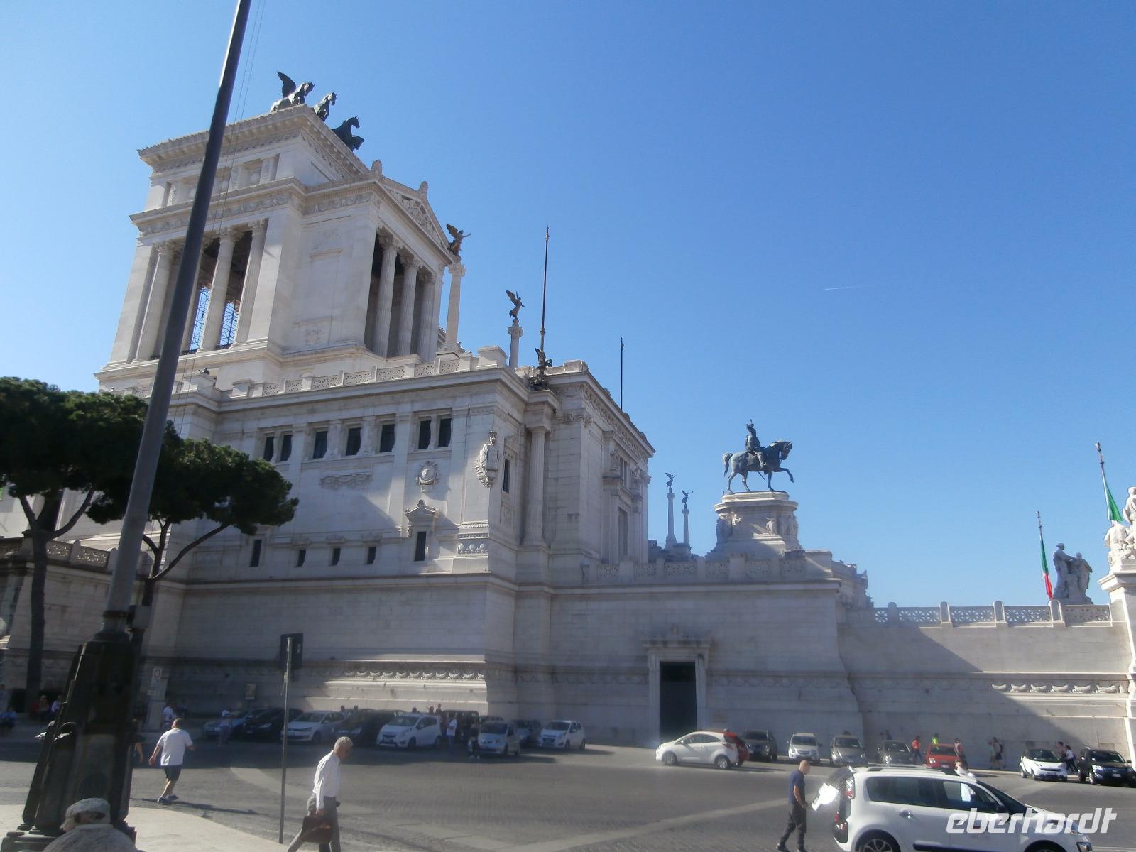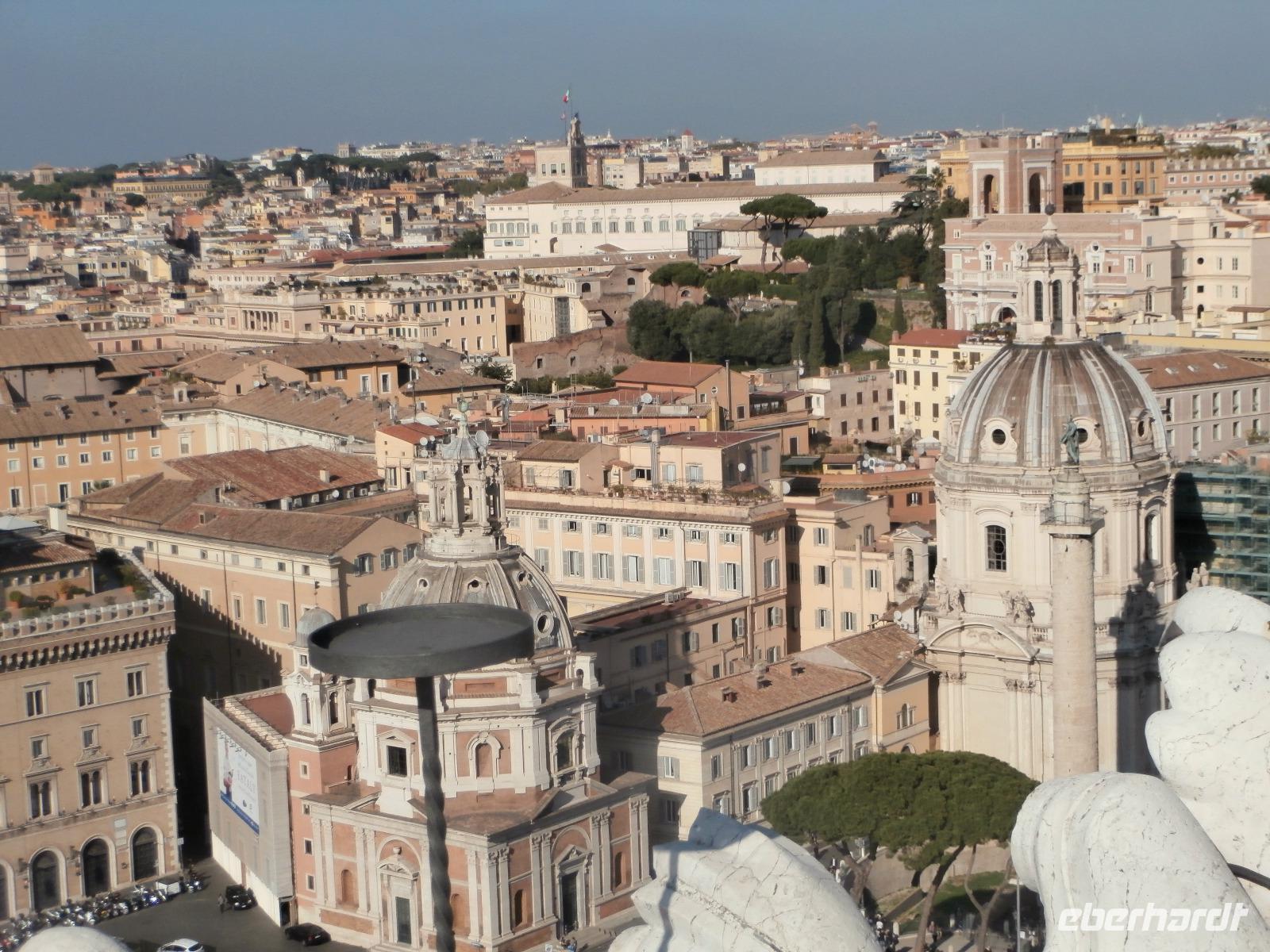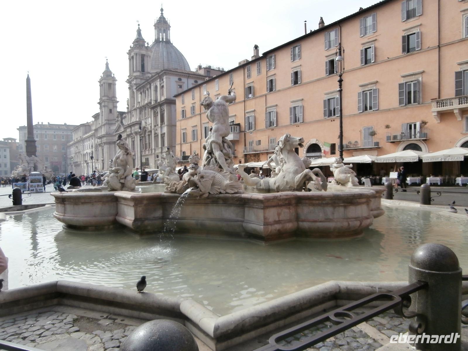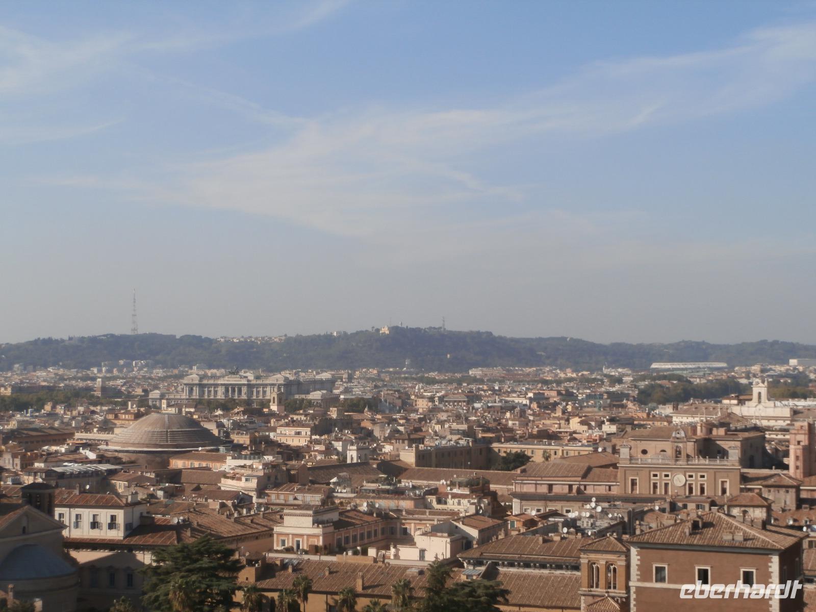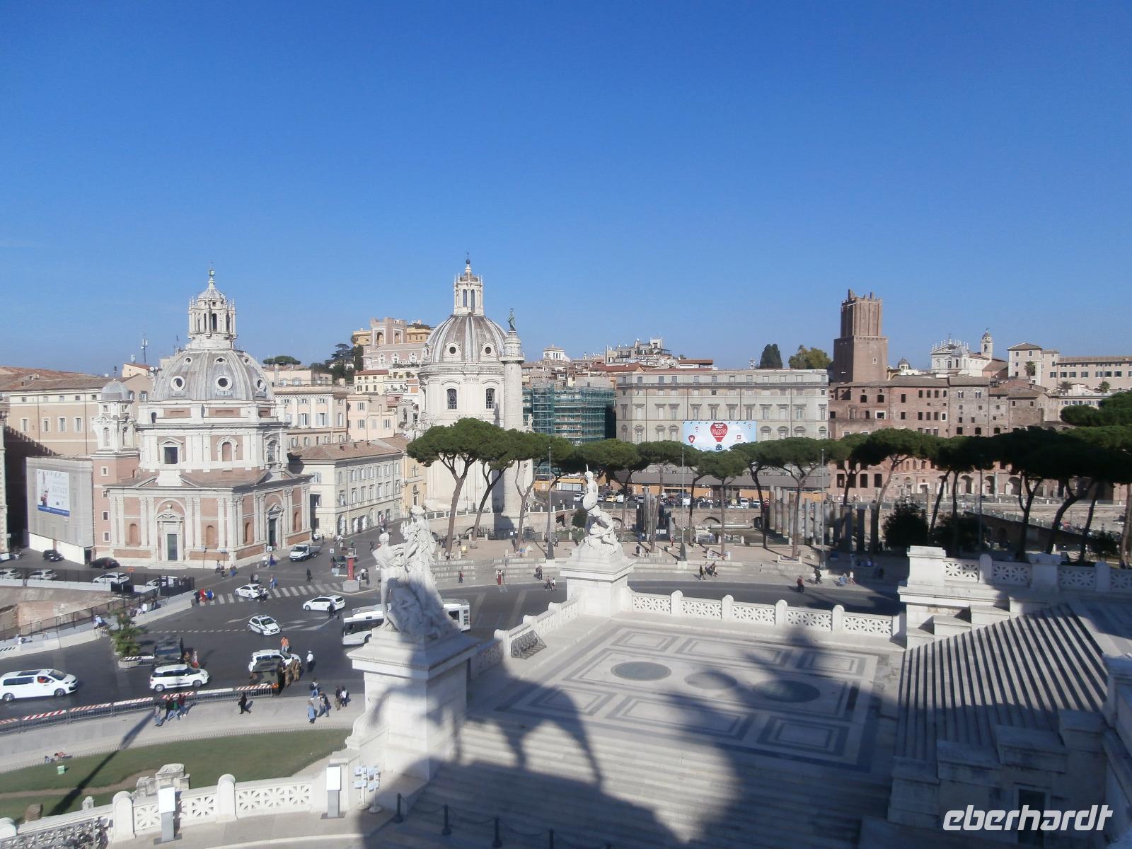 Massen an Menschen strömen im Anschluss weg vom Petersplatz, wir auch, unser Weg führt zur Engelsburg und hier hören wir viel vom Kaiser Hadrian, es war mal seine Grabstätte. Benannt wird die Festung, dazu hat man sie für die Päpste umfunktioniert, nach dem Erzengel Michael, der auf der Spitze dieser Anlage thront. Über die Ponte Sant' Angelo gehen wir über den Tiber. Durch enge Gassen gelangen wir zum Wohnzimmer der Römer - zum Piazza Navona. Hier steht in der Mitte des Platzes der Vier Ströme Brunnen, den noch ein Obelisk schmückt. An beiden Enden des Platzes gibt es noch 2 Brunnen. Weiter führt uns Sylvia bis zum Pantheon, hier wird eine längere Pause zur Mittagszeit eingelegt. Nach der Pause sehen wir ins Pantheon als nächstes Kunstobjekt, einst Tempel und später Kirche, ist es neben dem Kolosseum das besterhaltene Bauwerk der Antike. Immer noch faszinierend sind der harmonische Innenraum und die perfekt proportionierende Kuppel. Einzige Lichtquelle ist die 9 m große nicht verglaste Öffnung im Scheitelpunkt der Kuppel. Letzter Besichtigungspunkt unseres heutigen Tagesprogrammes ist die nahegelegene Kirche St. Ignatius von Loyola. Sie ist die zweitgrößte Jesuitenkirche Roms und Grabstätte eines Papstes und von drei Heiligen. Wir verabschieden uns von Sylvia und laufen gemeinsam zum Nationalmonument Emanuele II. Wir fahren gemeinsam auf die Aussichtsplattform. Eberhardt Travel gibt uns dieses Highlight als WOW aus. Fantastisch ist hier oben der Blick auf Rom, welches sich unter uns prächtig präsentiert.