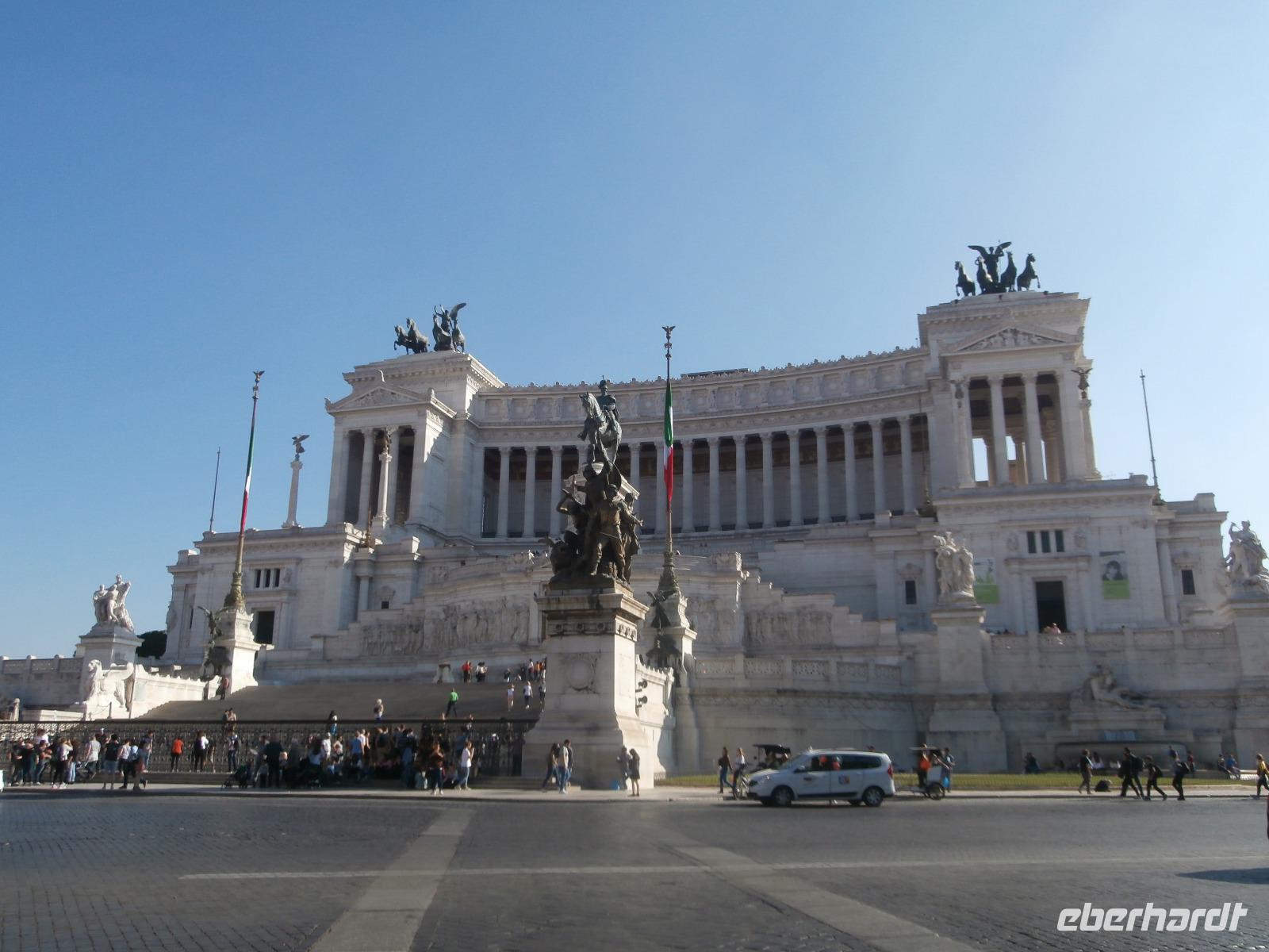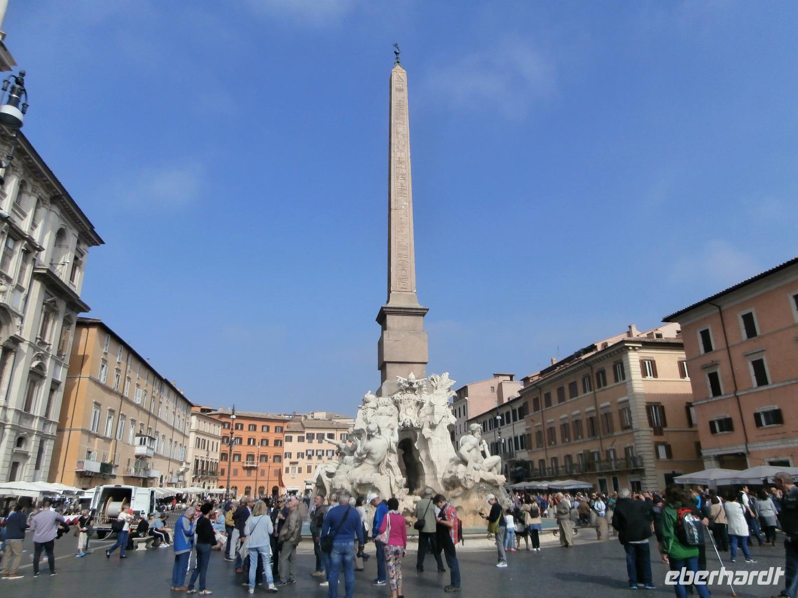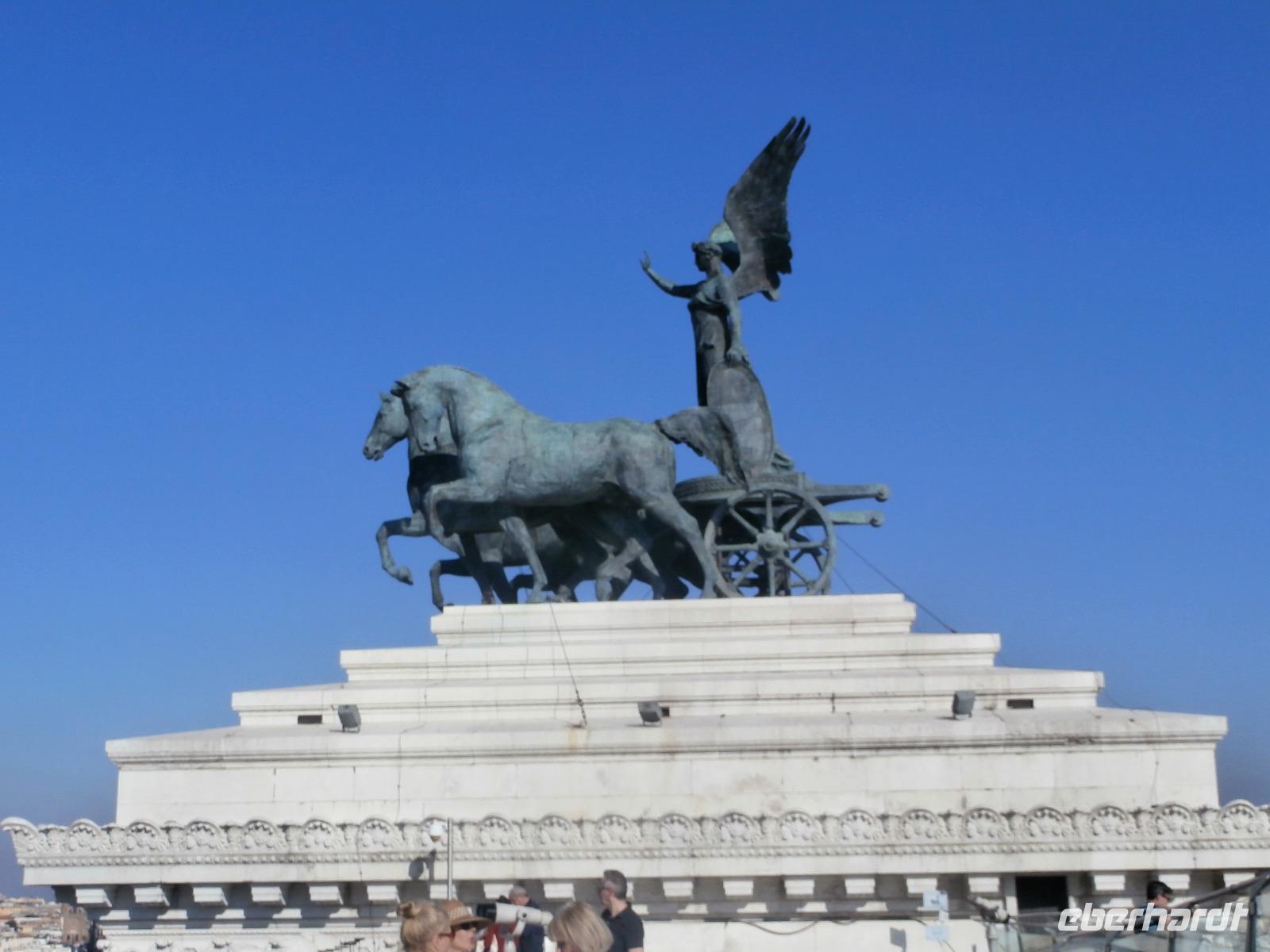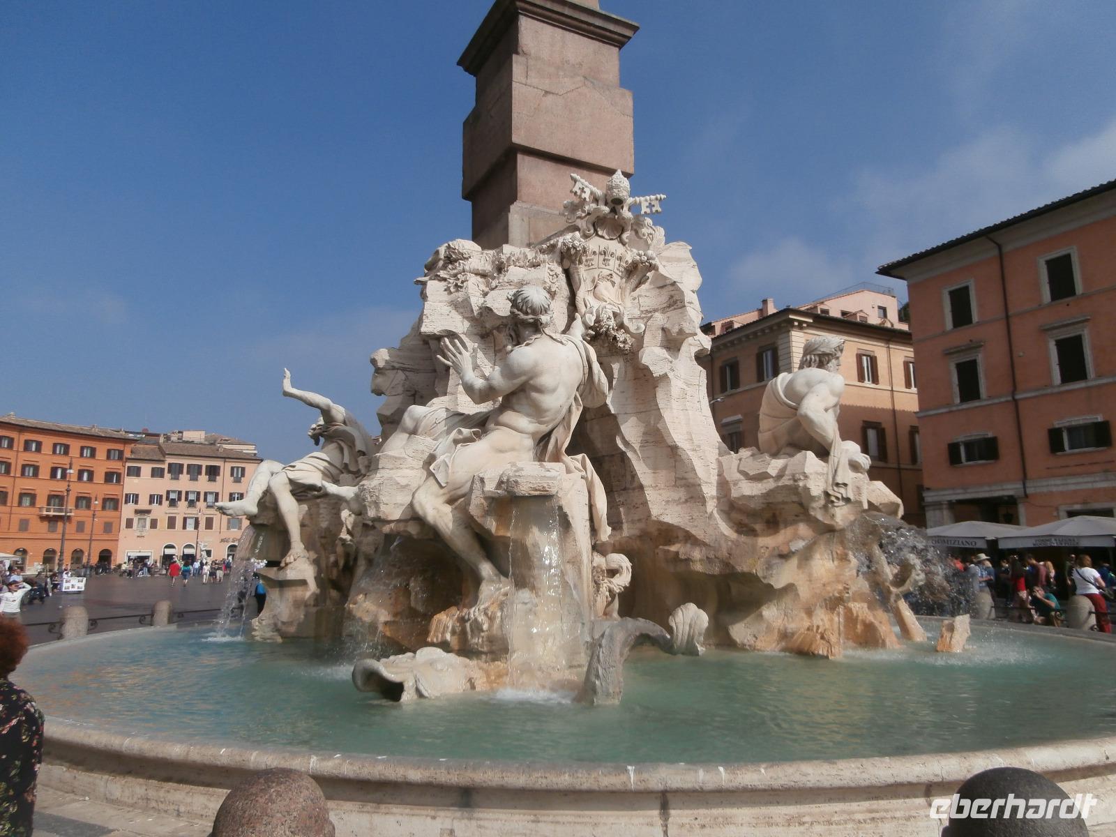 Massen an Menschen strömen im Anschluss weg vom Petersplatz, wir auch, unser Weg führt zur Engelsburg und hier hören wir viel vom Kaiser Hadrian, es war mal seine Grabstätte. Benannt wird die Festung, dazu hat man sie für die Päpste umfunktioniert, nach dem Erzengel Michael, der auf der Spitze dieser Anlage thront. Über die Ponte Sant' Angelo gehen wir über den Tiber. Durch enge Gassen gelangen wir zum Wohnzimmer der Römer - zum Piazza Navona. Hier steht in der Mitte des Platzes der Vier Ströme Brunnen, den noch ein Obelisk schmückt. An beiden Enden des Platzes gibt es noch 2 Brunnen. Weiter führt uns Sylvia bis zum Pantheon, hier wird eine längere Pause zur Mittagszeit eingelegt. Nach der Pause sehen wir ins Pantheon als nächstes Kunstobjekt, einst Tempel und später Kirche, ist es neben dem Kolosseum das besterhaltene Bauwerk der Antike. Immer noch faszinierend sind der harmonische Innenraum und die perfekt proportionierende Kuppel. Einzige Lichtquelle ist die 9 m große nicht verglaste Öffnung im Scheitelpunkt der Kuppel. Letzter Besichtigungspunkt unseres heutigen Tagesprogrammes ist die nahegelegene Kirche St. Ignatius von Loyola. Sie ist die zweitgrößte Jesuitenkirche Roms und Grabstätte eines Papstes und von drei Heiligen. Wir verabschieden uns von Sylvia und laufen gemeinsam zum Nationalmonument Emanuele II. Wir fahren gemeinsam auf die Aussichtsplattform. Eberhardt Travel gibt uns dieses Highlight als WOW aus. Fantastisch ist hier oben der Blick auf Rom, welches sich unter uns prächtig präsentiert.