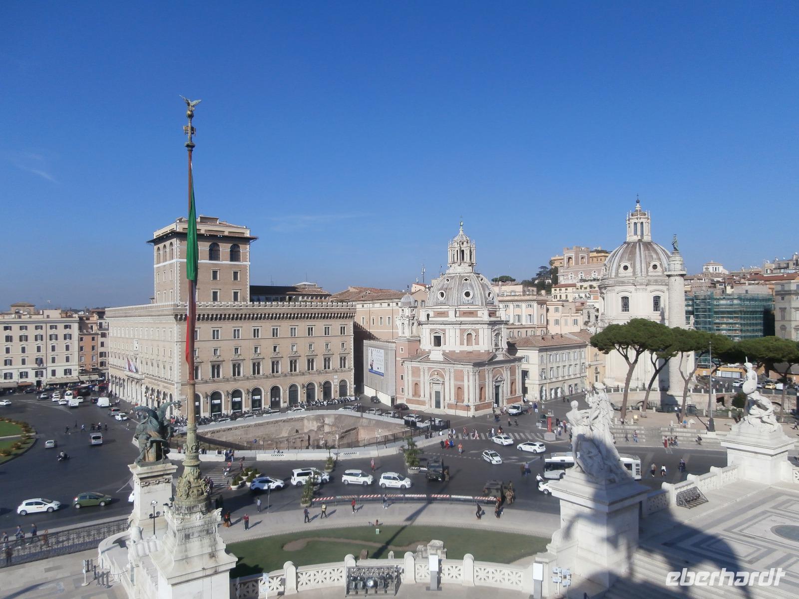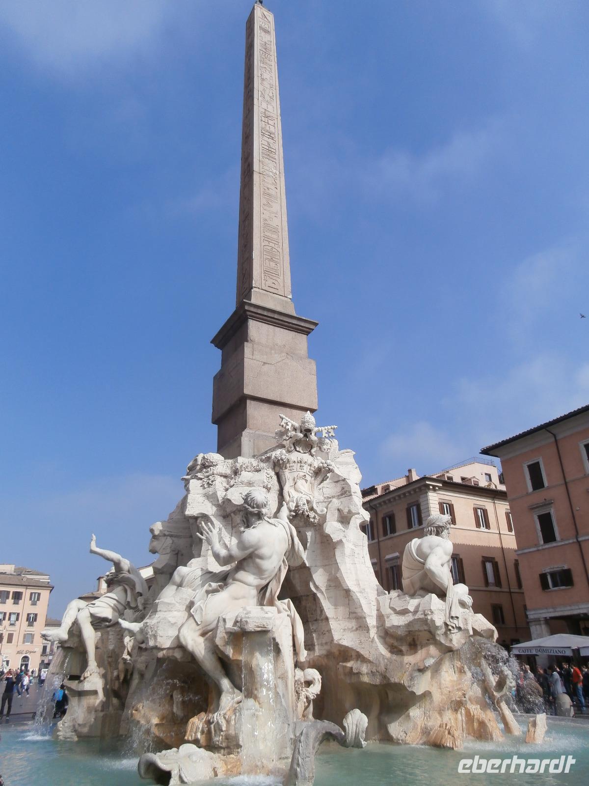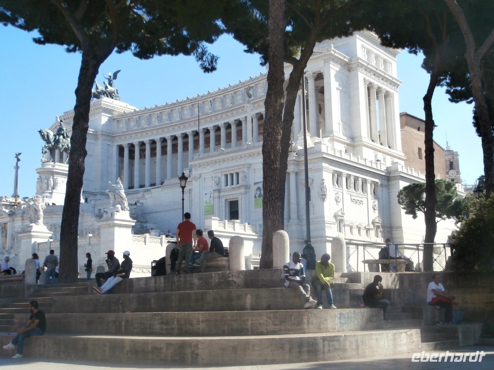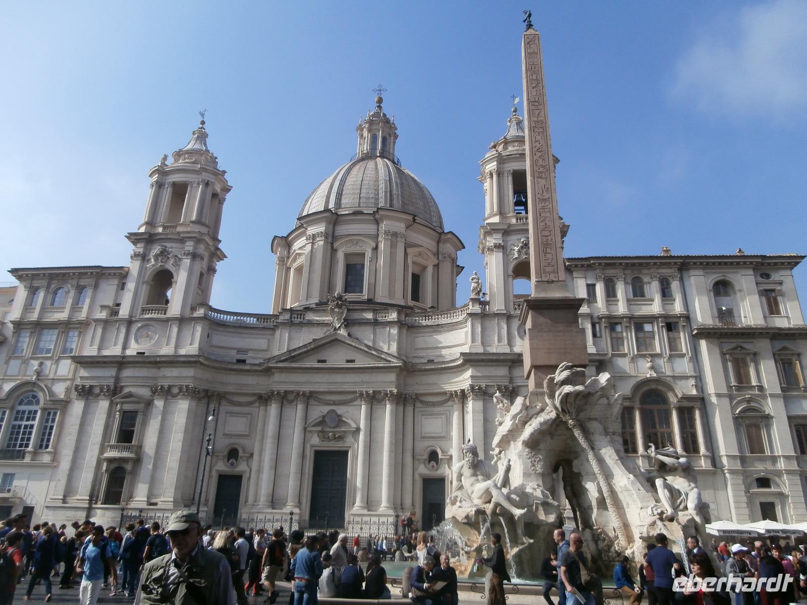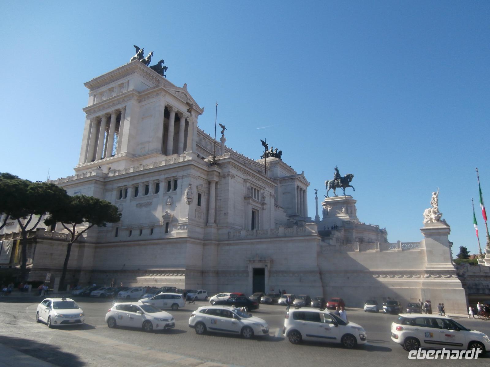 Massen an Menschen strömen im Anschluss weg vom Petersplatz, wir auch, unser Weg führt zur Engelsburg und hier hören wir viel vom Kaiser Hadrian, es war mal seine Grabstätte. Benannt wird die Festung, dazu hat man sie für die Päpste umfunktioniert, nach dem Erzengel Michael, der auf der Spitze dieser Anlage thront. Über die Ponte Sant' Angelo gehen wir über den Tiber. Durch enge Gassen gelangen wir zum Wohnzimmer der Römer - zum Piazza Navona. Hier steht in der Mitte des Platzes der Vier Ströme Brunnen, den noch ein Obelisk schmückt. An beiden Enden des Platzes gibt es noch 2 Brunnen. Weiter führt uns Sylvia bis zum Pantheon, hier wird eine längere Pause zur Mittagszeit eingelegt. Nach der Pause sehen wir ins Pantheon als nächstes Kunstobjekt, einst Tempel und später Kirche, ist es neben dem Kolosseum das besterhaltene Bauwerk der Antike. Immer noch faszinierend sind der harmonische Innenraum und die perfekt proportionierende Kuppel. Einzige Lichtquelle ist die 9 m große nicht verglaste Öffnung im Scheitelpunkt der Kuppel. Letzter Besichtigungspunkt unseres heutigen Tagesprogrammes ist die nahegelegene Kirche St. Ignatius von Loyola. Sie ist die zweitgrößte Jesuitenkirche Roms und Grabstätte eines Papstes und von drei Heiligen. Wir verabschieden uns von Sylvia und laufen gemeinsam zum Nationalmonument Emanuele II. Wir fahren gemeinsam auf die Aussichtsplattform. Eberhardt Travel gibt uns dieses Highlight als WOW aus. Fantastisch ist hier oben der Blick auf Rom, welches sich unter uns prächtig präsentiert.