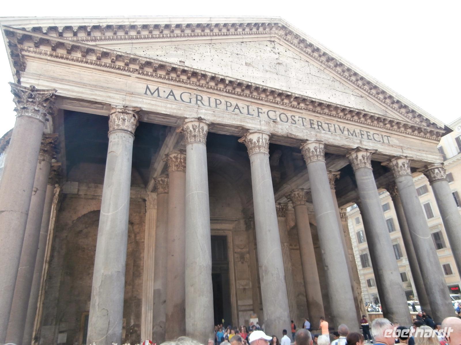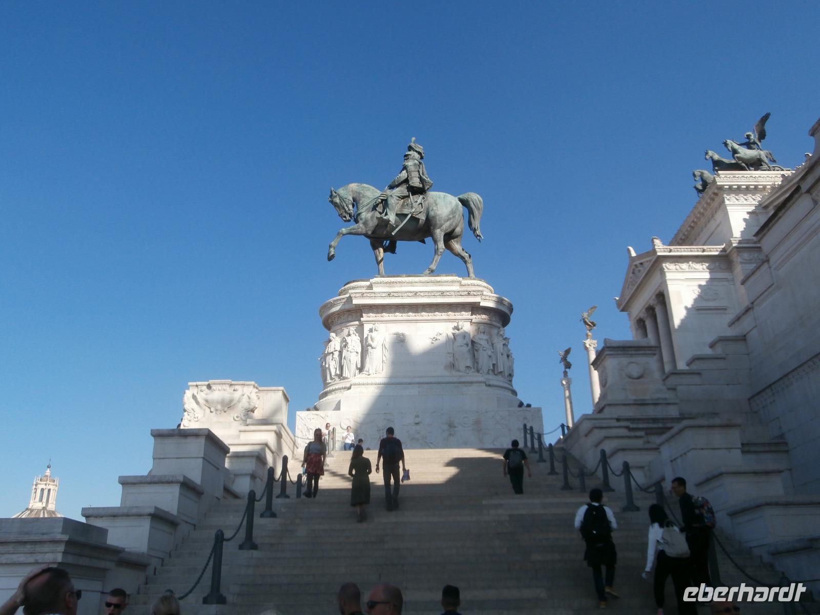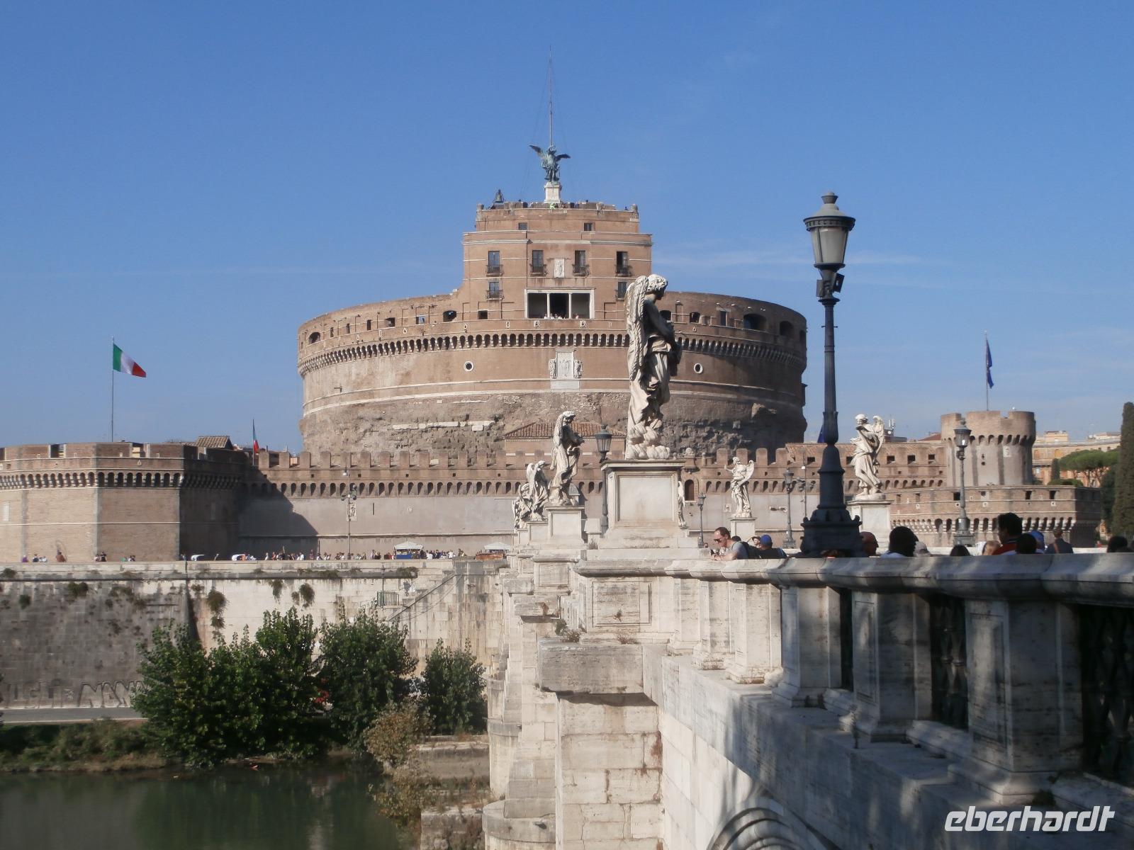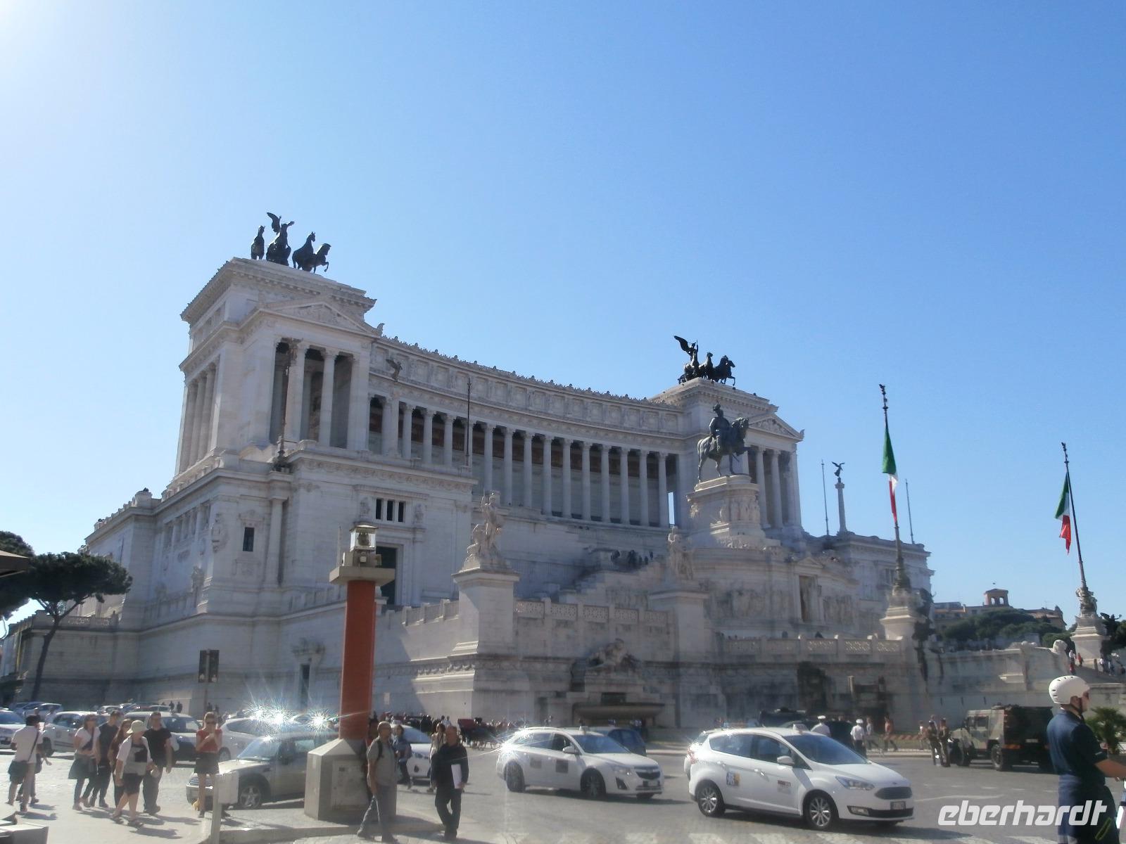 Massen an Menschen strömen im Anschluss weg vom Petersplatz, wir auch, unser Weg führt zur Engelsburg und hier hören wir viel vom Kaiser Hadrian, es war mal seine Grabstätte. Benannt wird die Festung, dazu hat man sie für die Päpste umfunktioniert, nach dem Erzengel Michael, der auf der Spitze dieser Anlage thront. Über die Ponte Sant' Angelo gehen wir über den Tiber. Durch enge Gassen gelangen wir zum Wohnzimmer der Römer - zum Piazza Navona. Hier steht in der Mitte des Platzes der Vier Ströme Brunnen, den noch ein Obelisk schmückt. An beiden Enden des Platzes gibt es noch 2 Brunnen. Weiter führt uns Sylvia bis zum Pantheon, hier wird eine längere Pause zur Mittagszeit eingelegt. Nach der Pause sehen wir ins Pantheon als nächstes Kunstobjekt, einst Tempel und später Kirche, ist es neben dem Kolosseum das besterhaltene Bauwerk der Antike. Immer noch faszinierend sind der harmonische Innenraum und die perfekt proportionierende Kuppel. Einzige Lichtquelle ist die 9 m große nicht verglaste Öffnung im Scheitelpunkt der Kuppel. Letzter Besichtigungspunkt unseres heutigen Tagesprogrammes ist die nahegelegene Kirche St. Ignatius von Loyola. Sie ist die zweitgrößte Jesuitenkirche Roms und Grabstätte eines Papstes und von drei Heiligen. Wir verabschieden uns von Sylvia und laufen gemeinsam zum Nationalmonument Emanuele II. Wir fahren gemeinsam auf die Aussichtsplattform. Eberhardt Travel gibt uns dieses Highlight als WOW aus. Fantastisch ist hier oben der Blick auf Rom, welches sich unter uns prächtig präsentiert.