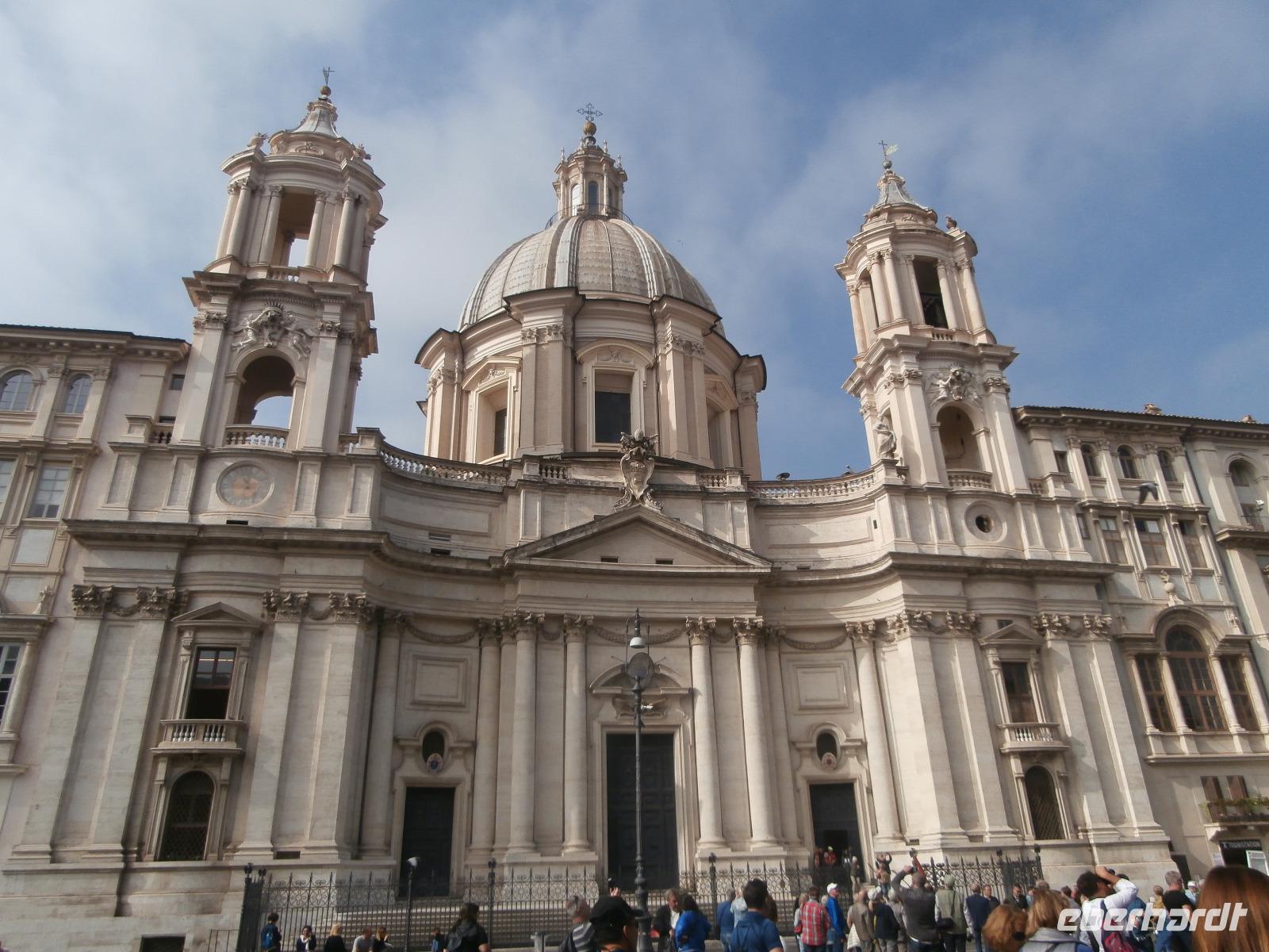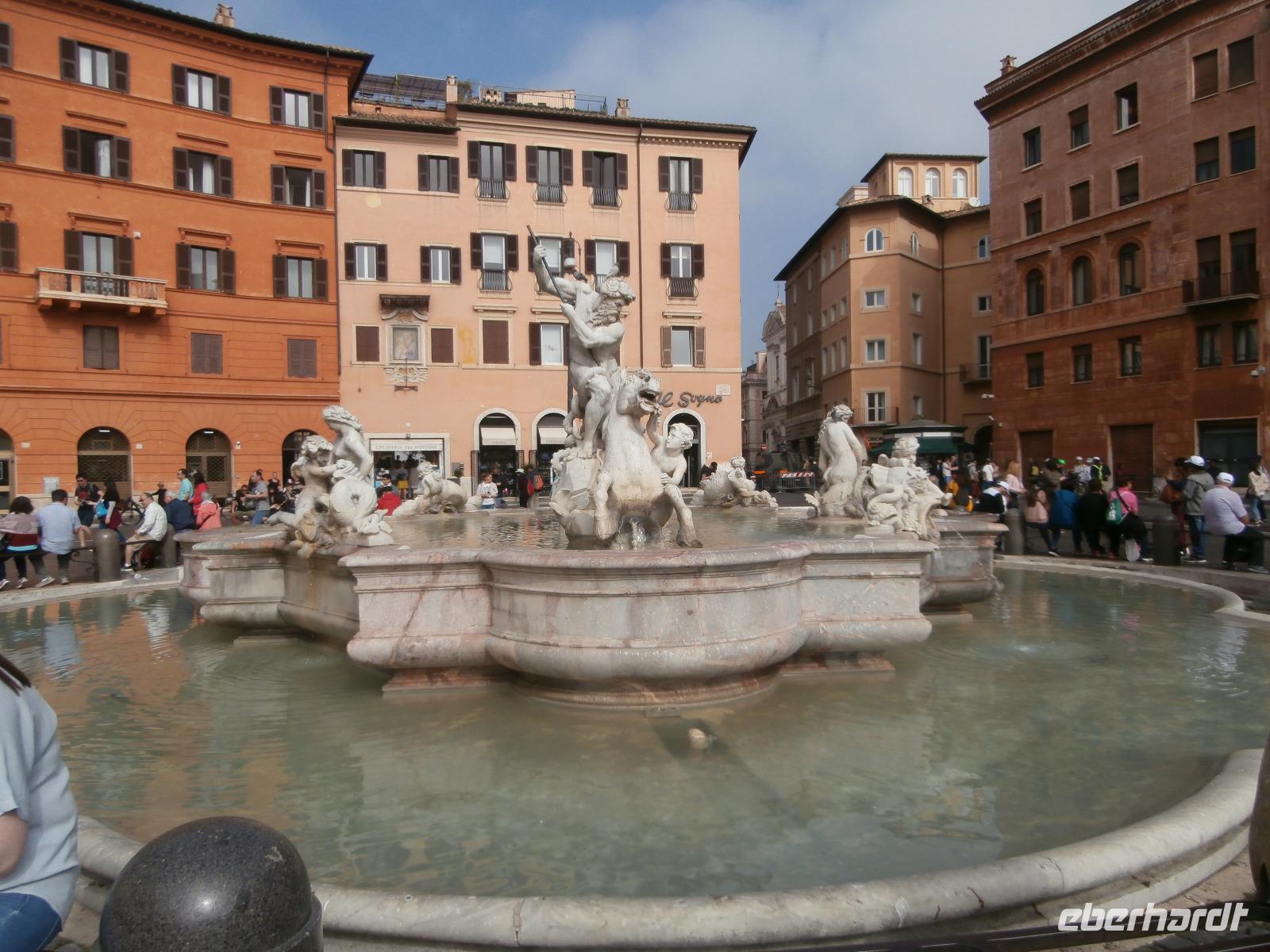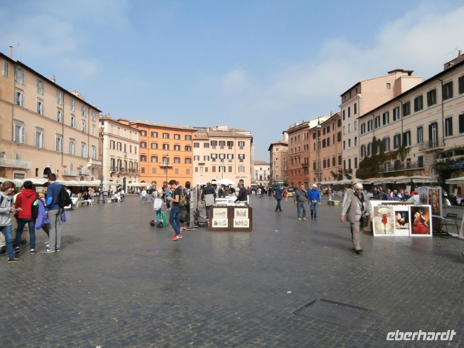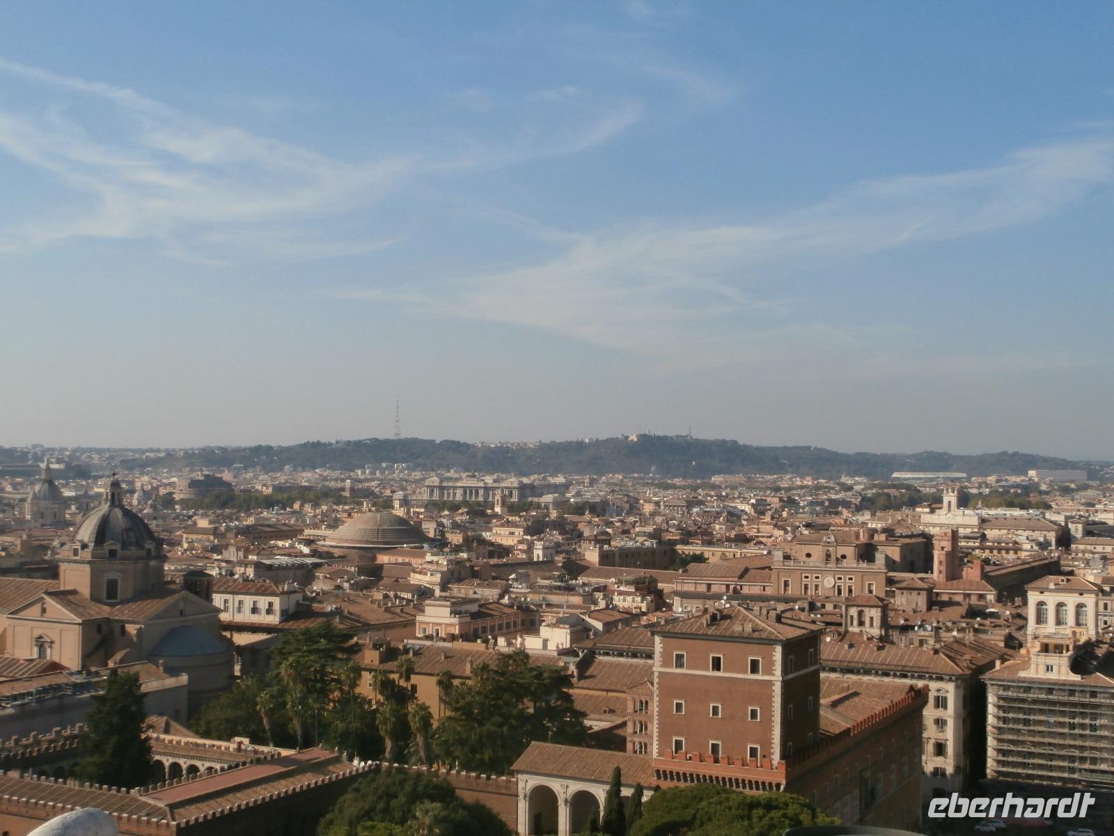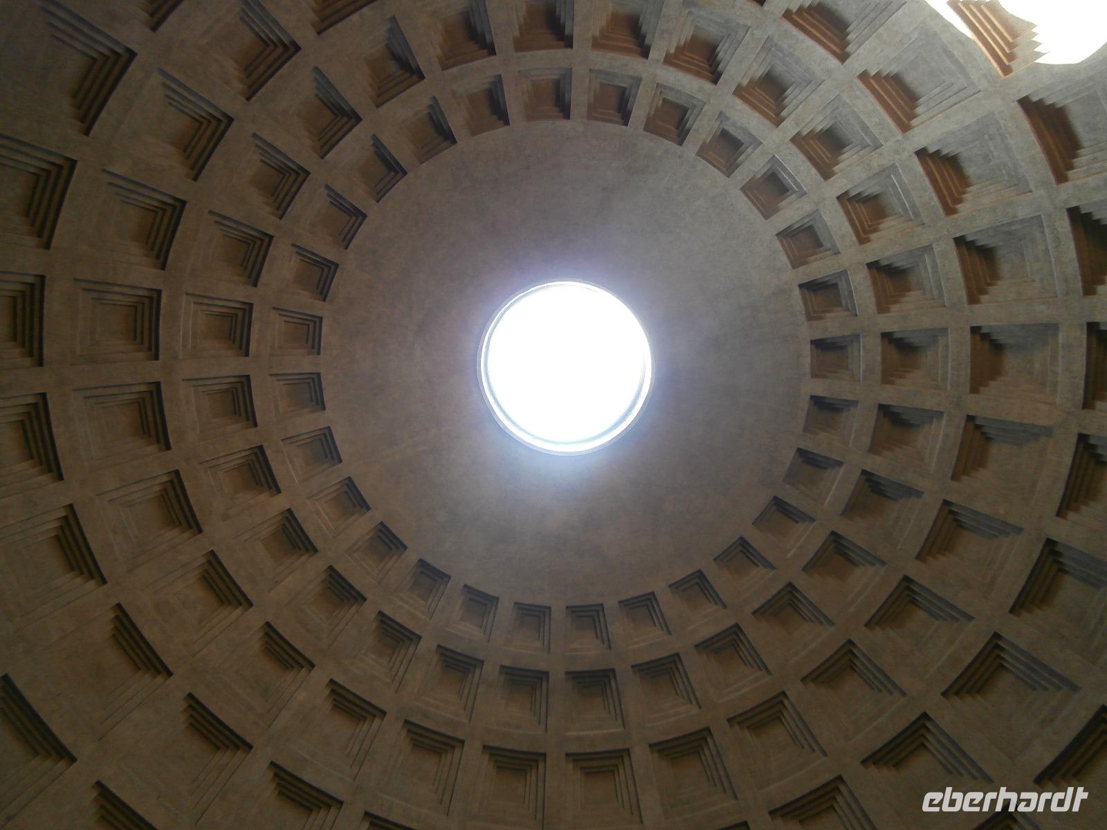 Massen an Menschen strömen im Anschluss weg vom Petersplatz, wir auch, unser Weg führt zur Engelsburg und hier hören wir viel vom Kaiser Hadrian, es war mal seine Grabstätte. Benannt wird die Festung, dazu hat man sie für die Päpste umfunktioniert, nach dem Erzengel Michael, der auf der Spitze dieser Anlage thront. Über die Ponte Sant' Angelo gehen wir über den Tiber. Durch enge Gassen gelangen wir zum Wohnzimmer der Römer - zum Piazza Navona. Hier steht in der Mitte des Platzes der Vier Ströme Brunnen, den noch ein Obelisk schmückt. An beiden Enden des Platzes gibt es noch 2 Brunnen. Weiter führt uns Sylvia bis zum Pantheon, hier wird eine längere Pause zur Mittagszeit eingelegt. Nach der Pause sehen wir ins Pantheon als nächstes Kunstobjekt, einst Tempel und später Kirche, ist es neben dem Kolosseum das besterhaltene Bauwerk der Antike. Immer noch faszinierend sind der harmonische Innenraum und die perfekt proportionierende Kuppel. Einzige Lichtquelle ist die 9 m große nicht verglaste Öffnung im Scheitelpunkt der Kuppel. Letzter Besichtigungspunkt unseres heutigen Tagesprogrammes ist die nahegelegene Kirche St. Ignatius von Loyola. Sie ist die zweitgrößte Jesuitenkirche Roms und Grabstätte eines Papstes und von drei Heiligen. Wir verabschieden uns von Sylvia und laufen gemeinsam zum Nationalmonument Emanuele II. Wir fahren gemeinsam auf die Aussichtsplattform. Eberhardt Travel gibt uns dieses Highlight als WOW aus. Fantastisch ist hier oben der Blick auf Rom, welches sich unter uns prächtig präsentiert.