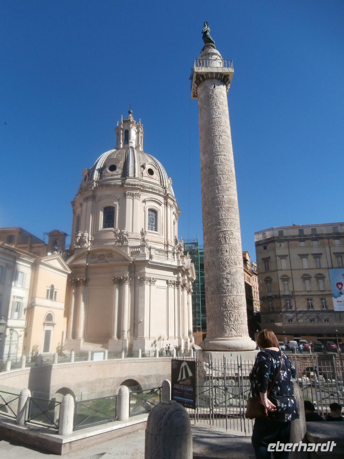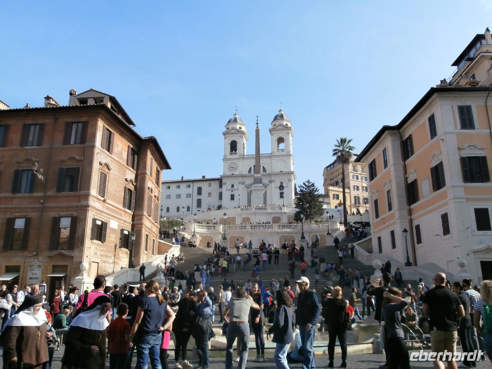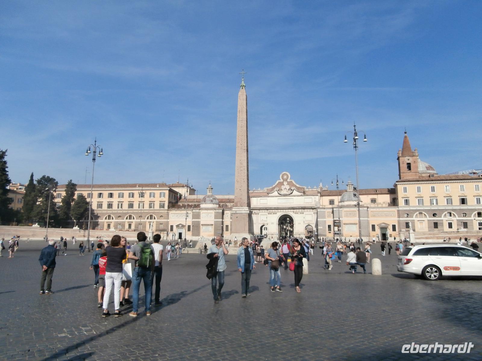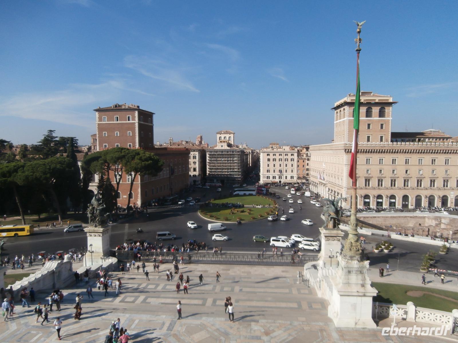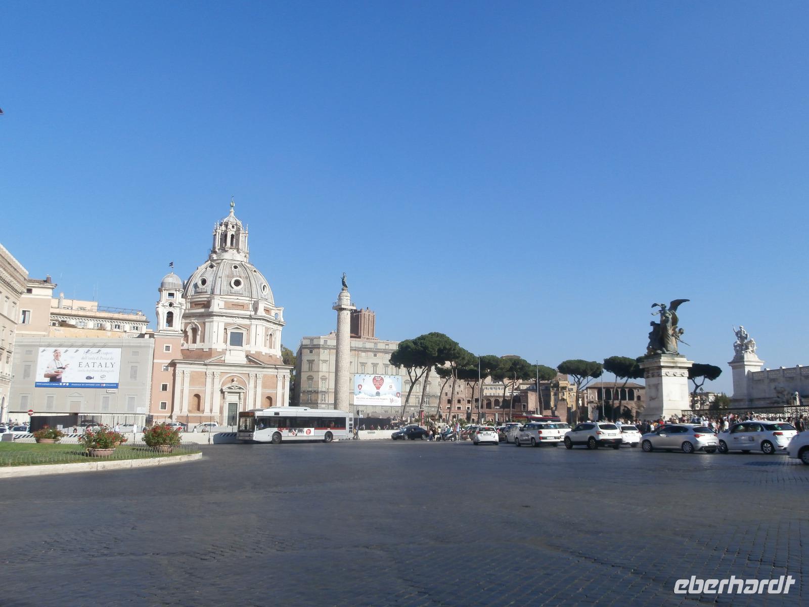 Massen an Menschen strömen im Anschluss weg vom Petersplatz, wir auch, unser Weg führt zur Engelsburg und hier hören wir viel vom Kaiser Hadrian, es war mal seine Grabstätte. Benannt wird die Festung, dazu hat man sie für die Päpste umfunktioniert, nach dem Erzengel Michael, der auf der Spitze dieser Anlage thront. Über die Ponte Sant' Angelo gehen wir über den Tiber. Durch enge Gassen gelangen wir zum Wohnzimmer der Römer - zum Piazza Navona. Hier steht in der Mitte des Platzes der Vier Ströme Brunnen, den noch ein Obelisk schmückt. An beiden Enden des Platzes gibt es noch 2 Brunnen. Weiter führt uns Sylvia bis zum Pantheon, hier wird eine längere Pause zur Mittagszeit eingelegt. Nach der Pause sehen wir ins Pantheon als nächstes Kunstobjekt, einst Tempel und später Kirche, ist es neben dem Kolosseum das besterhaltene Bauwerk der Antike. Immer noch faszinierend sind der harmonische Innenraum und die perfekt proportionierende Kuppel. Einzige Lichtquelle ist die 9 m große nicht verglaste Öffnung im Scheitelpunkt der Kuppel. Letzter Besichtigungspunkt unseres heutigen Tagesprogrammes ist die nahegelegene Kirche St. Ignatius von Loyola. Sie ist die zweitgrößte Jesuitenkirche Roms und Grabstätte eines Papstes und von drei Heiligen. Wir verabschieden uns von Sylvia und laufen gemeinsam zum Nationalmonument Emanuele II. Wir fahren gemeinsam auf die Aussichtsplattform. Eberhardt Travel gibt uns dieses Highlight als WOW aus. Fantastisch ist hier oben der Blick auf Rom, welches sich unter uns prächtig präsentiert.