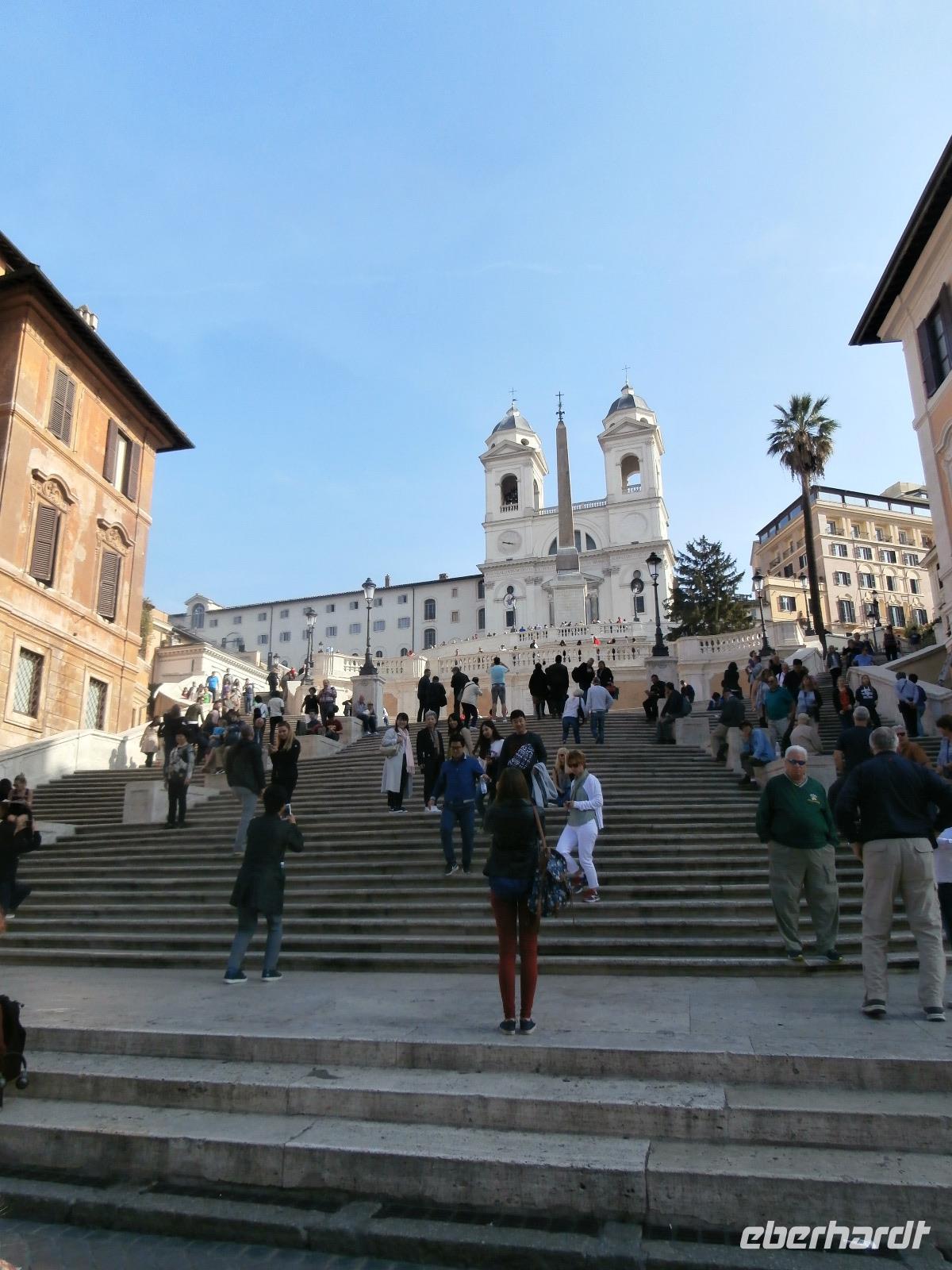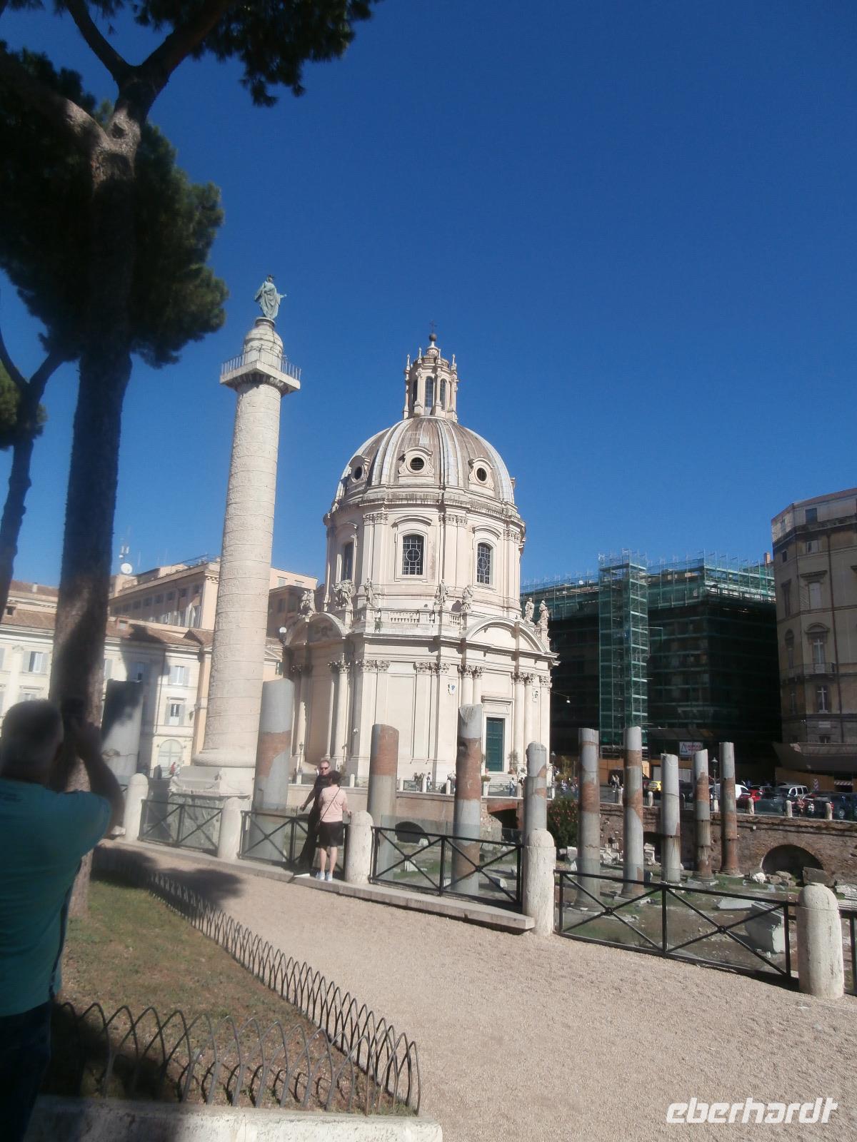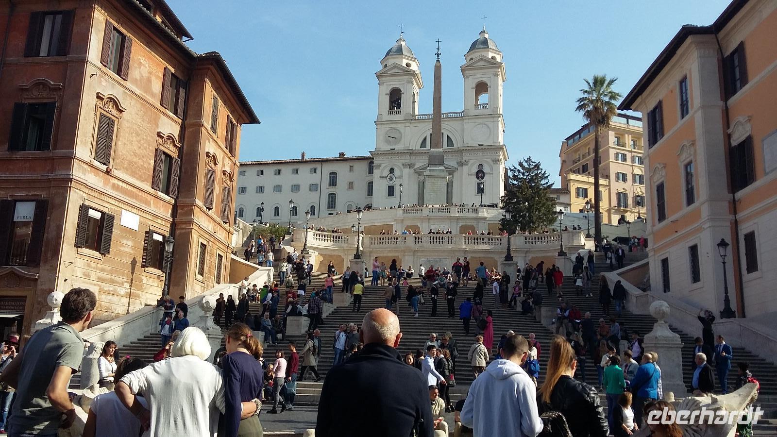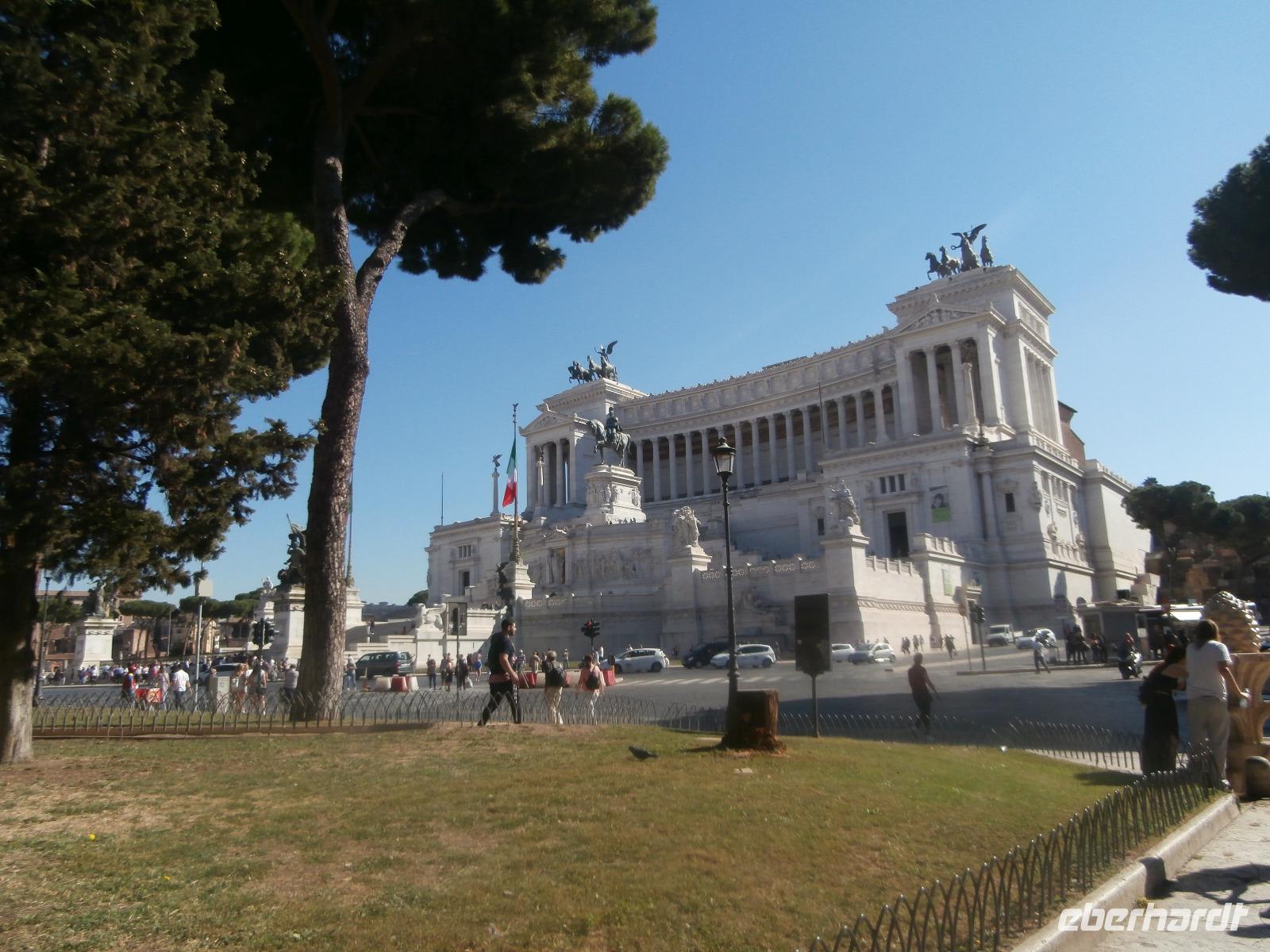 Massen an Menschen strömen im Anschluss weg vom Petersplatz, wir auch, unser Weg führt zur Engelsburg und hier hören wir viel vom Kaiser Hadrian, es war mal seine Grabstätte. Benannt wird die Festung, dazu hat man sie für die Päpste umfunktioniert, nach dem Erzengel Michael, der auf der Spitze dieser Anlage thront. Über die Ponte Sant' Angelo gehen wir über den Tiber. Durch enge Gassen gelangen wir zum Wohnzimmer der Römer - zum Piazza Navona. Hier steht in der Mitte des Platzes der Vier Ströme Brunnen, den noch ein Obelisk schmückt. An beiden Enden des Platzes gibt es noch 2 Brunnen. Weiter führt uns Sylvia bis zum Pantheon, hier wird eine längere Pause zur Mittagszeit eingelegt. Nach der Pause sehen wir ins Pantheon als nächstes Kunstobjekt, einst Tempel und später Kirche, ist es neben dem Kolosseum das besterhaltene Bauwerk der Antike. Immer noch faszinierend sind der harmonische Innenraum und die perfekt proportionierende Kuppel. Einzige Lichtquelle ist die 9 m große nicht verglaste Öffnung im Scheitelpunkt der Kuppel. Letzter Besichtigungspunkt unseres heutigen Tagesprogrammes ist die nahegelegene Kirche St. Ignatius von Loyola. Sie ist die zweitgrößte Jesuitenkirche Roms und Grabstätte eines Papstes und von drei Heiligen. Wir verabschieden uns von Sylvia und laufen gemeinsam zum Nationalmonument Emanuele II. Wir fahren gemeinsam auf die Aussichtsplattform. Eberhardt Travel gibt uns dieses Highlight als WOW aus. Fantastisch ist hier oben der Blick auf Rom, welches sich unter uns prächtig präsentiert.
