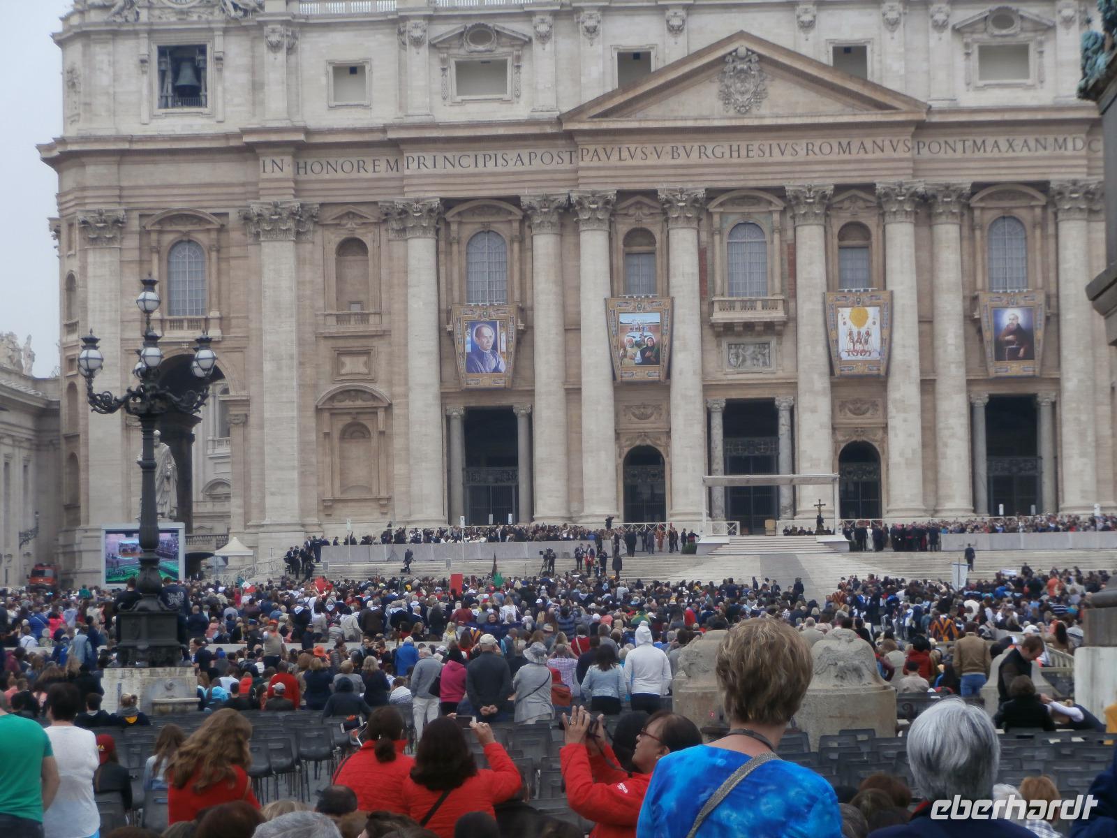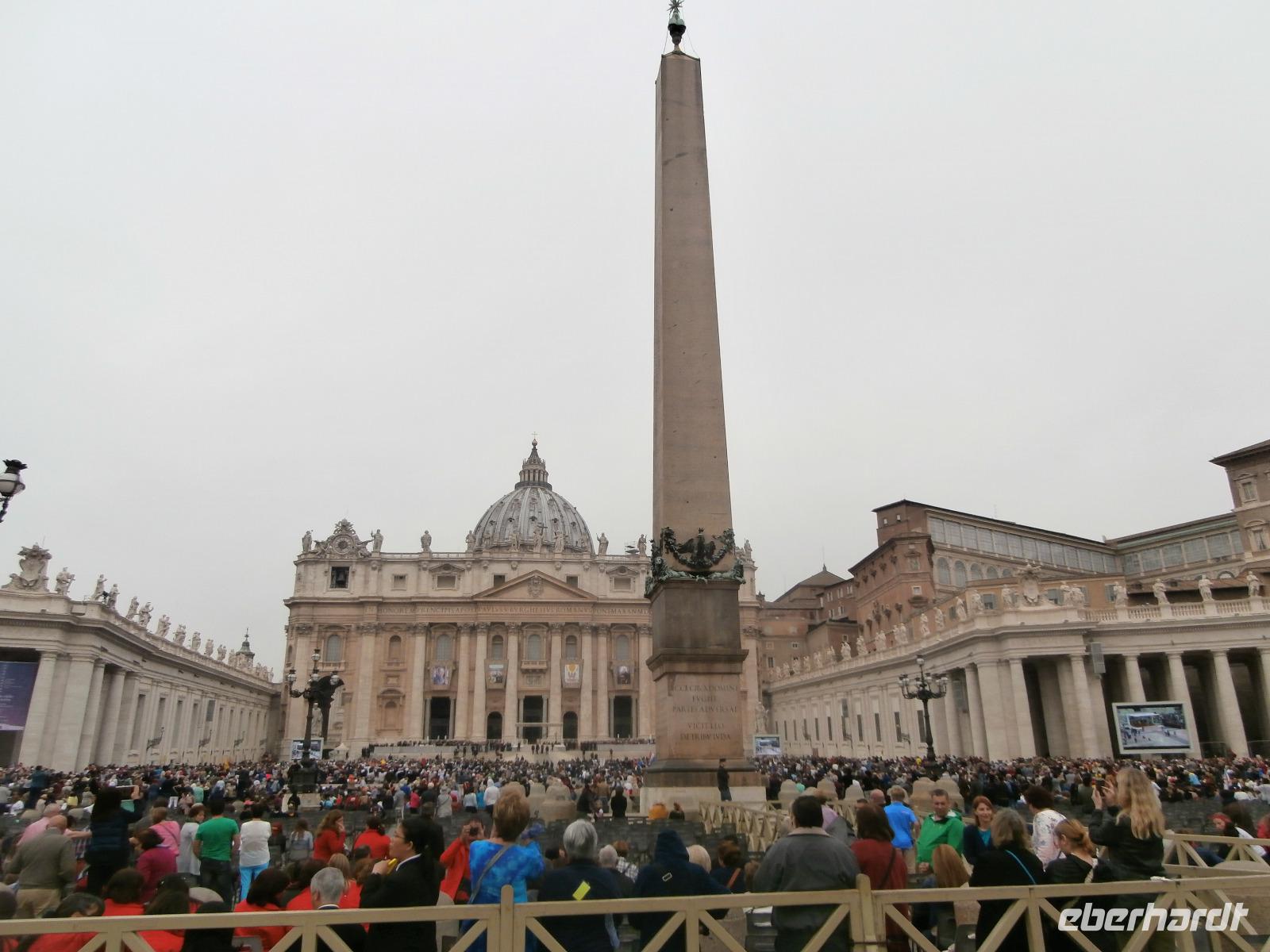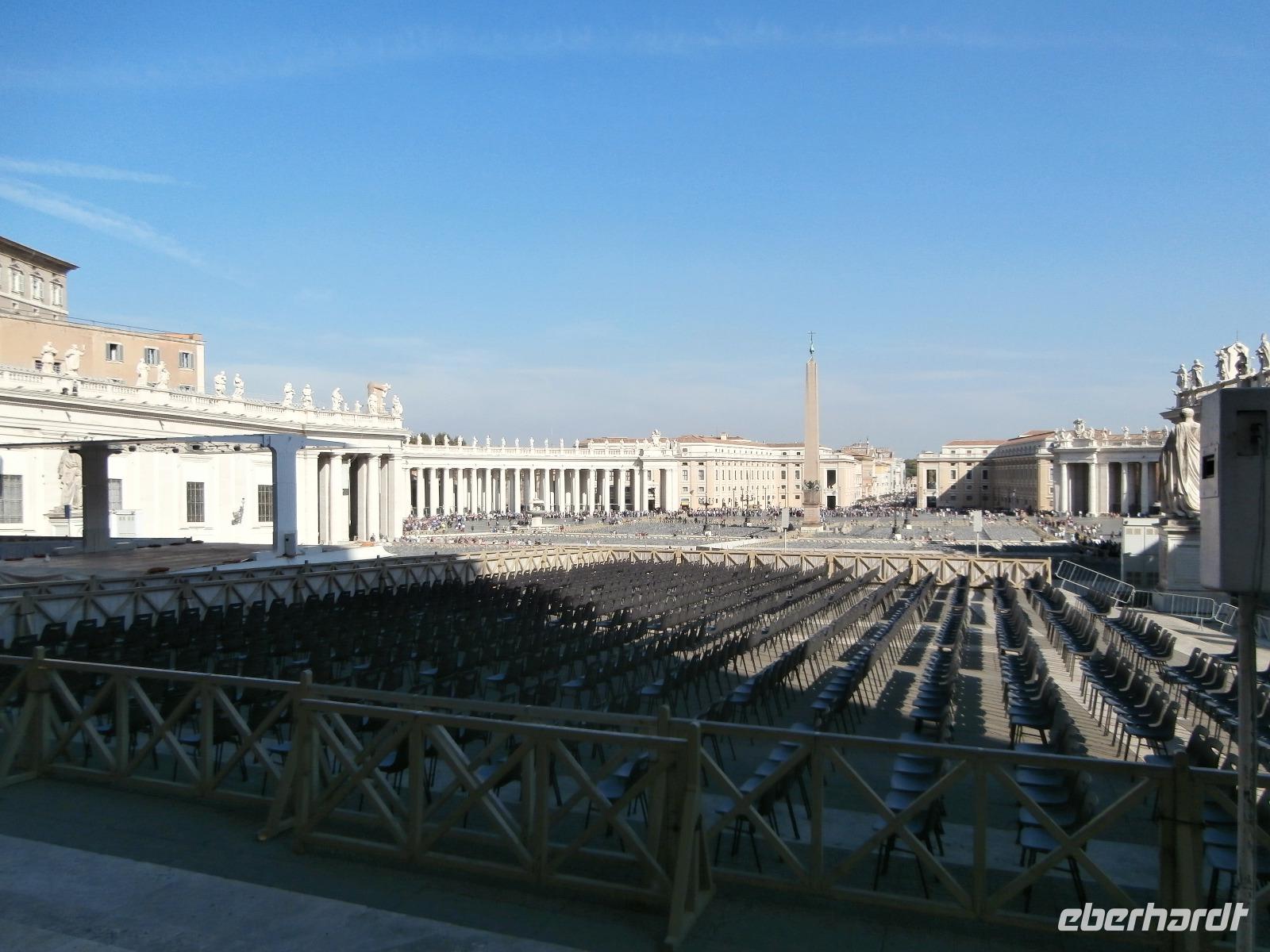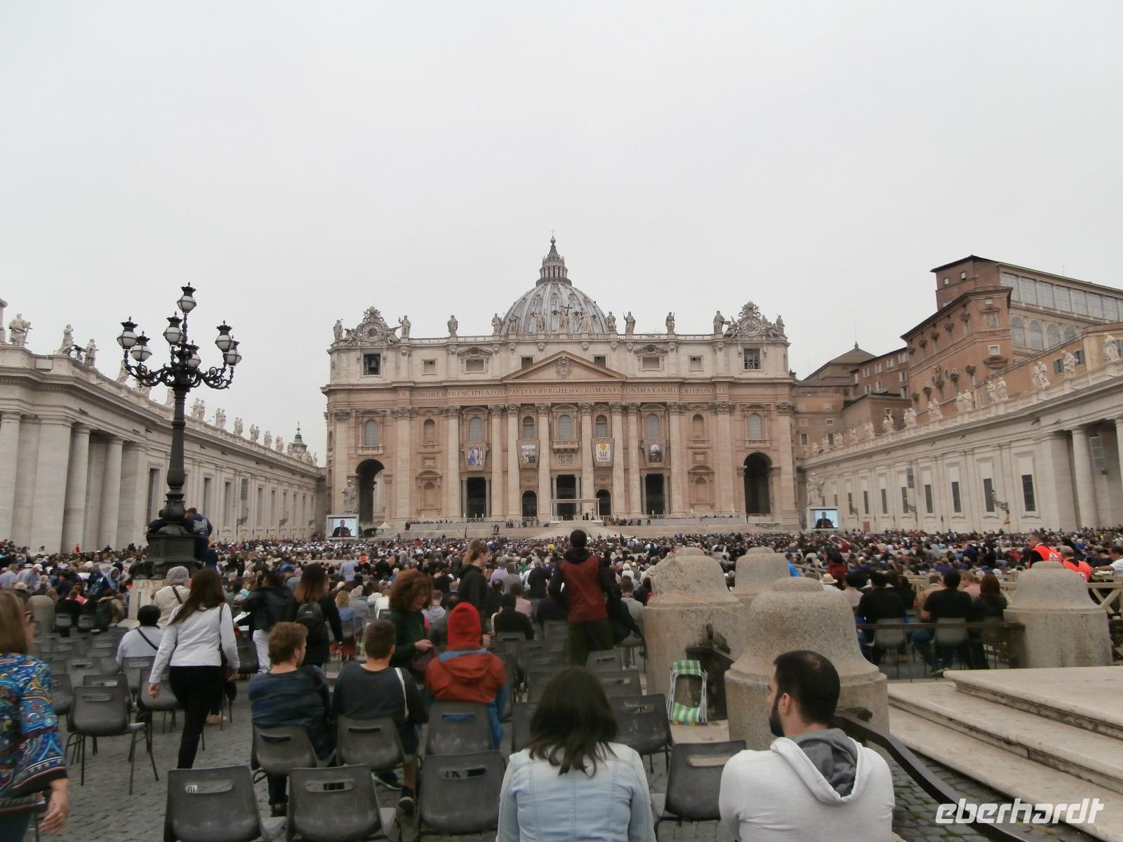 Wir treffen uns in der Lobby des Hotels und gemeinsam spazieren wir zur nahe gelegenen Busstation, wir wollen zur Papstaudienz hinunter zum Petersplatz fahren und heute ist es wie ein Wunder. Unser Bus kommt aber vollbesetzt, nun wird gedrängelt und siehe da, alle unsere Gäste passen hinein. Die Fahrt geht flott hinunter und nach einem kurzen Fußmarsch sehen wir schon die Menschenschlangen, sie stehen alle an zur Sicherheitskontrolle. Nach einigen Auseinandersetzungen mit Dränglern, eine Gruppe Chinesen alle in Gelb, bringen wir dazu, hinten anzustehen, treffen wir unsere Sylvia.
