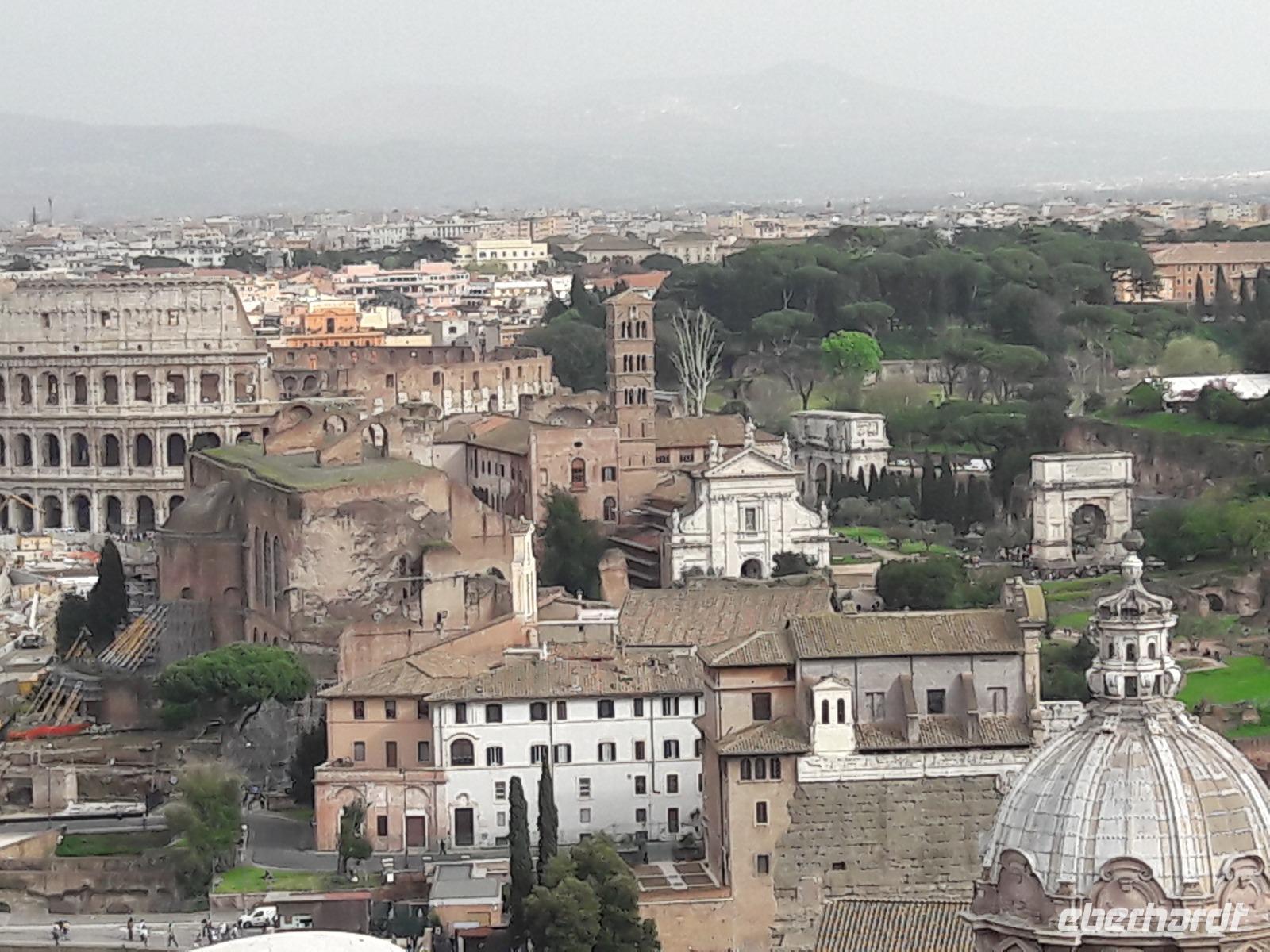 Dann sind wir wieder "frei" und dürfen Rom eigenständig erobern. Die überwiegende Zahl von Ihnen geht mit mir noch zur Piazza Venezia. Wir beabsichtigen, dem Nationaldenkmal, dem "Monumento Nazionale Vittorio Emanuele II." auf das Dach zu steigen. Zuerst aber müssen wir uns "im Erdgeschoss" durch den regen Verkehr schlängeln, denn der Platz wird nicht nur von dem neoklassizistischem Denkmal (im Volksmund auch "Schreibmaschine" oder "Hochzeitstorte" genannt) beherrscht, sondern ebenso von dem Verkehrschaos, das von allen Seiten auf ihn zuschießt. Nachdem wir diese "Aufgabe" bravourös gelöst haben, erklimmen wir zuerst die Stufen per pedes, um dann mit dem Lift nach oben zu schweben. Dort angekommen, werden wir mit einem faszinierenden Blick auf "Mamma Roma" belohnt.