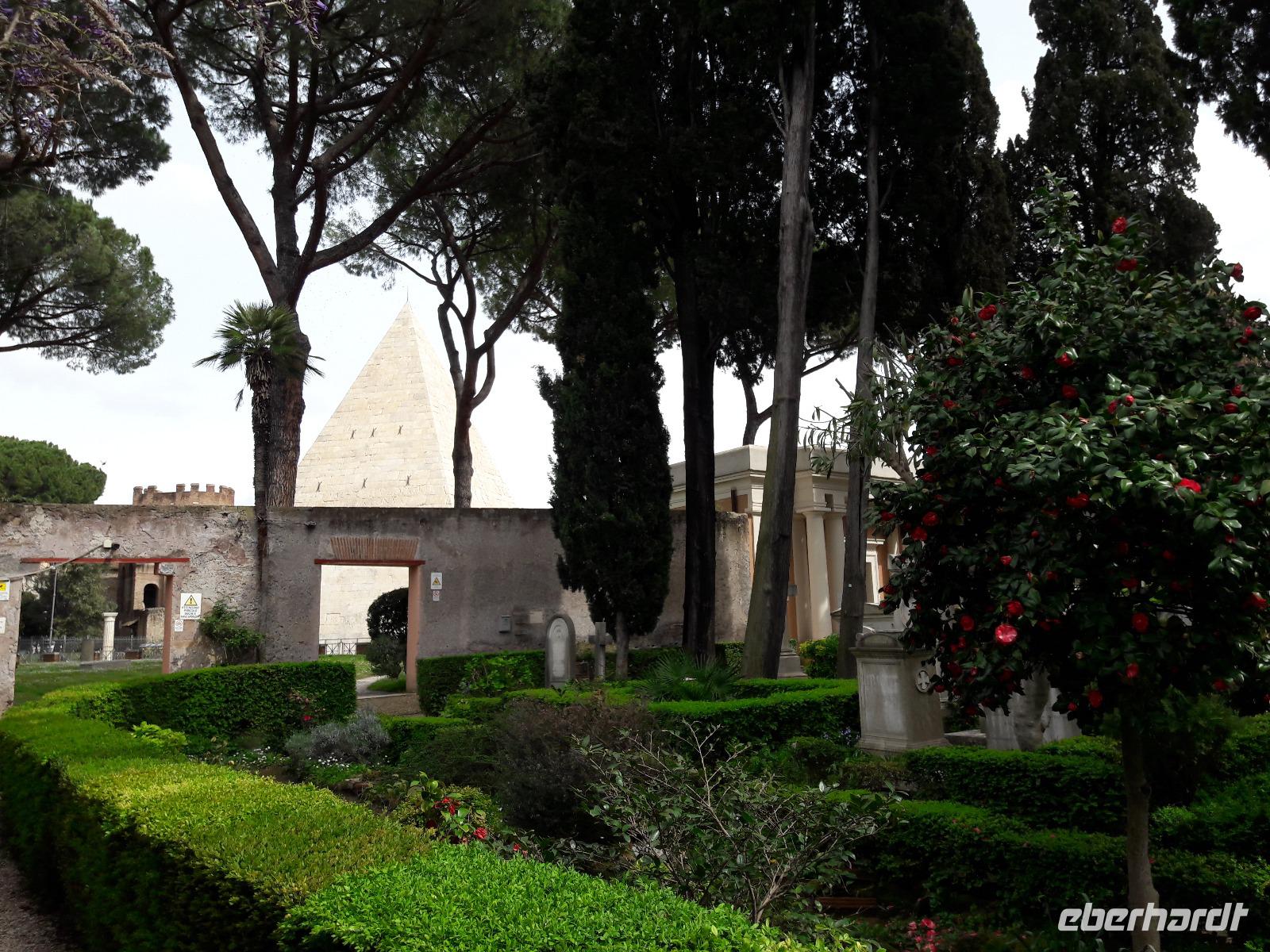 Nach diesem beeindruckenden Besuch steuern wir noch den Protestantischen Friedhof (Cimitero Acattolico) von Rom an. Vorbei an der Cestius Pyramide, die sich der römische Beamte Caius Cestius als Grabmal im Stil der Ägypten-Mode 12 v.Ch. hatte errichten lassen, erreichen wir einen der stimmungsvollsten Orte Roms, den Cimitero Acattolico. Wir entdecken neben zahlreichen unbekannten griechischen, russischen, englischen und deutschen Gräbern auch die einiger - uns bekannter - "Prominenter".