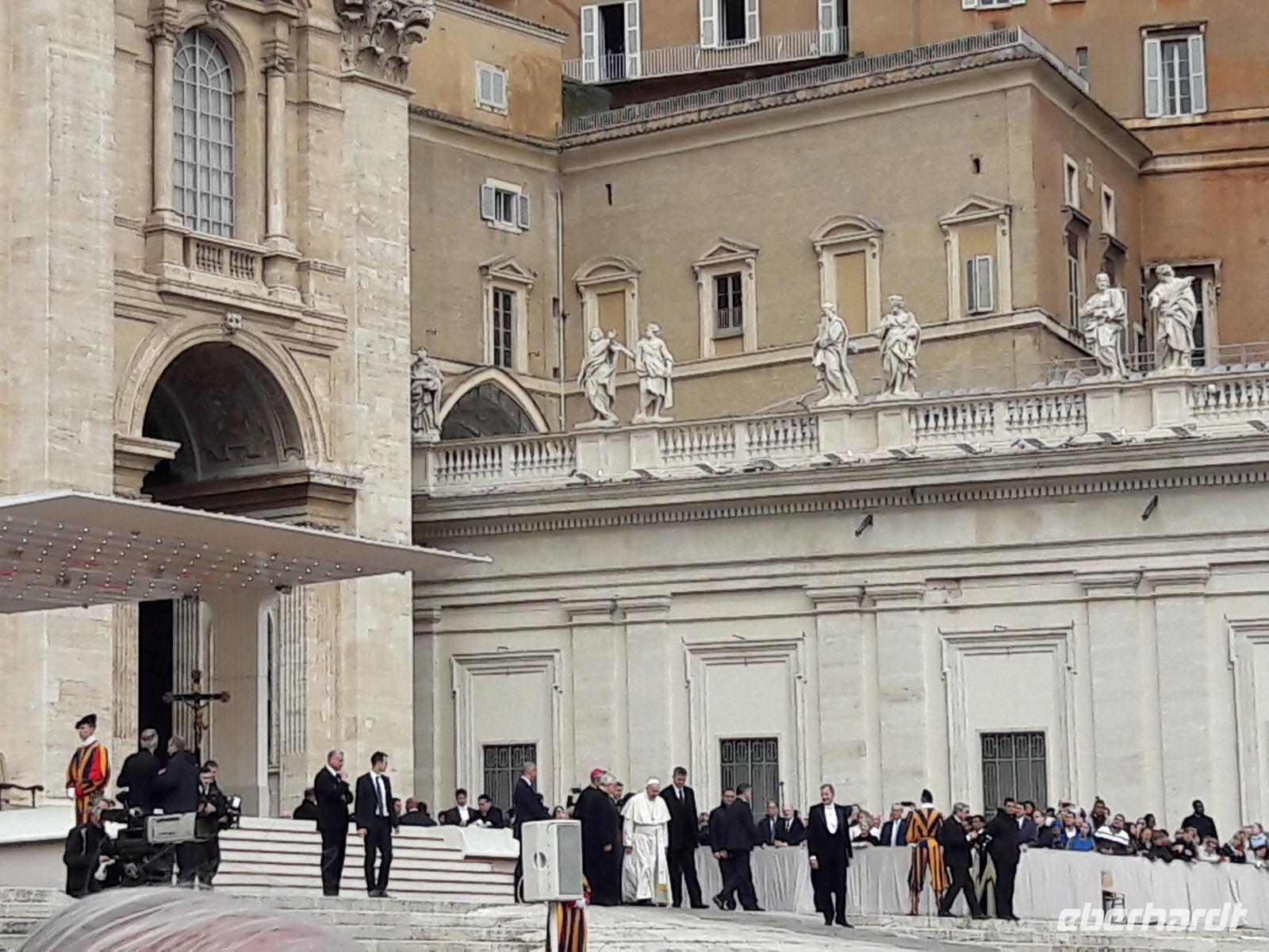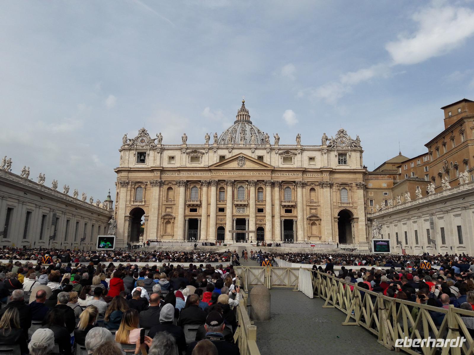 Wir treffen uns mit Cristina und spazieren gemeinsam Richtung Petersplatz. Hier herrscht schon ein mächtiges Treiben. Besucher, vorrangig Gläubige aus den verschiedensten Ländern der Welt, sind - nach Absolvierung der Sicherheitskontrollen - auf der Suche nach d e m Sitzplatz. Nahezu jeden beschäftigt nur eine Frage, sitze ich hier richtig, ist das der Platz, von dem aus ich dem "Stellvertreter Gottes hier auf Erden" am nächsten sein werde? Wo, ja wo, wird er lang fahren? Welche Route wird er nehmen?