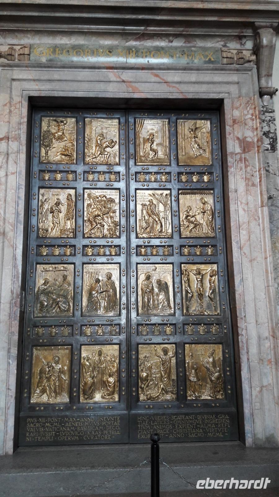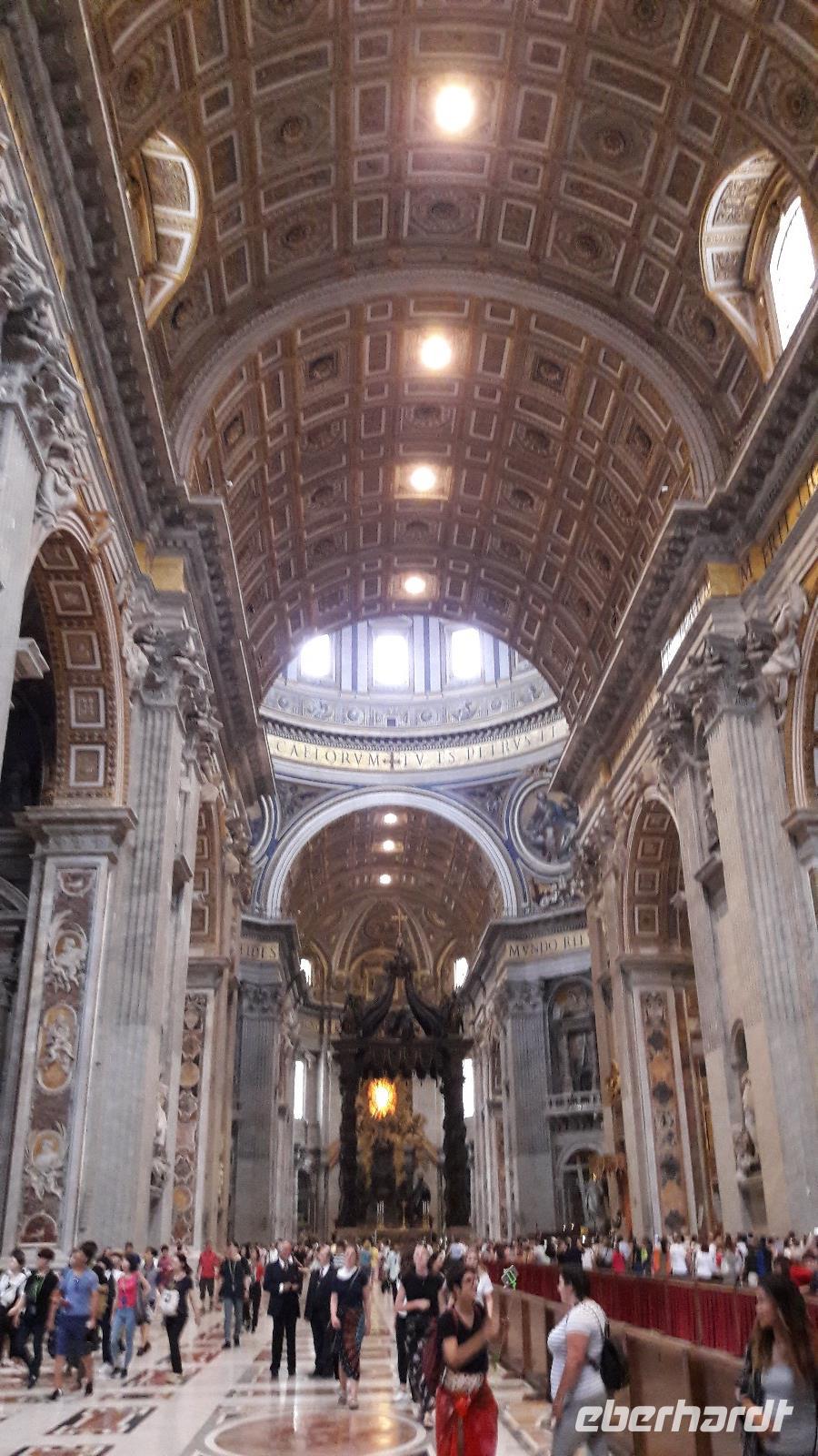 Nach diesem krönenden Abschluss der Vatikanischen Museen beabsichtigen wir noch mit Cristina in den Petersdom zu gehen. Doch, oh Schreck, wir müssen feststellen - drei Gäste (mit den Audioguides des Vatikans) sind vorerst weg! Zum Glück kehren sie gerade noch rechtzeitig zurück und wir können - vorbei an der „Porta Santa" (sie ist nur zu Beginn eines Heiligen Jahres geöffnet) in den PETERSDOM (Basilica di San Pietro) schreiten. Der Innenraum, nahezu 190m lang, ist reich an unzähligen Meisterwerken - er hat 45 Altäre und 11 Kapellen und besteht aus drei Schiffen, einem Querschiff von 137,5m Breite und einer 136,5m hohen Kuppel. Überall findet man Papststatuen und Grabmäler. Am meisten fasziniert mich immer wieder, die „Pieta" von Michelangelo, sie ist so schön, so ergreifend!