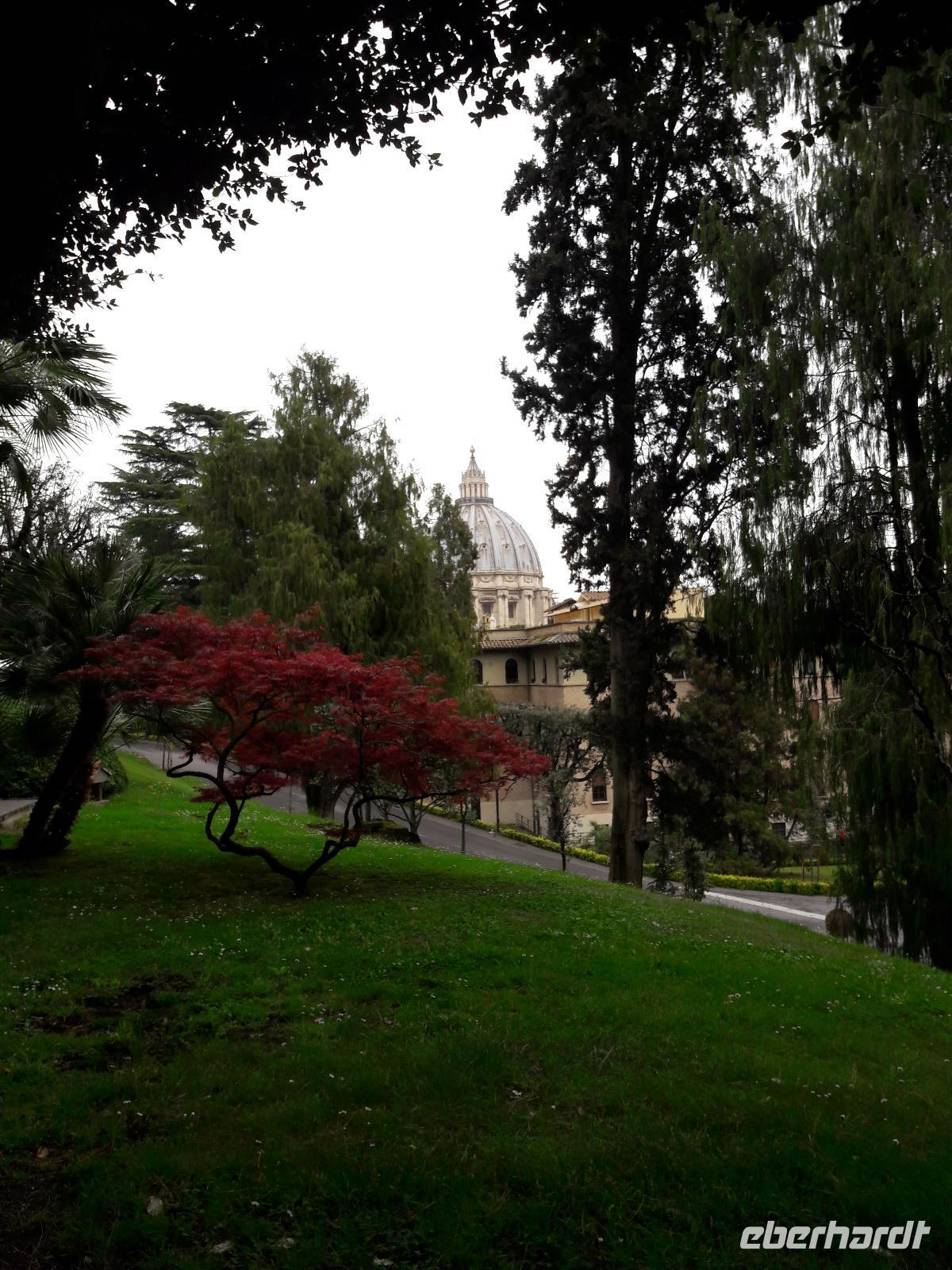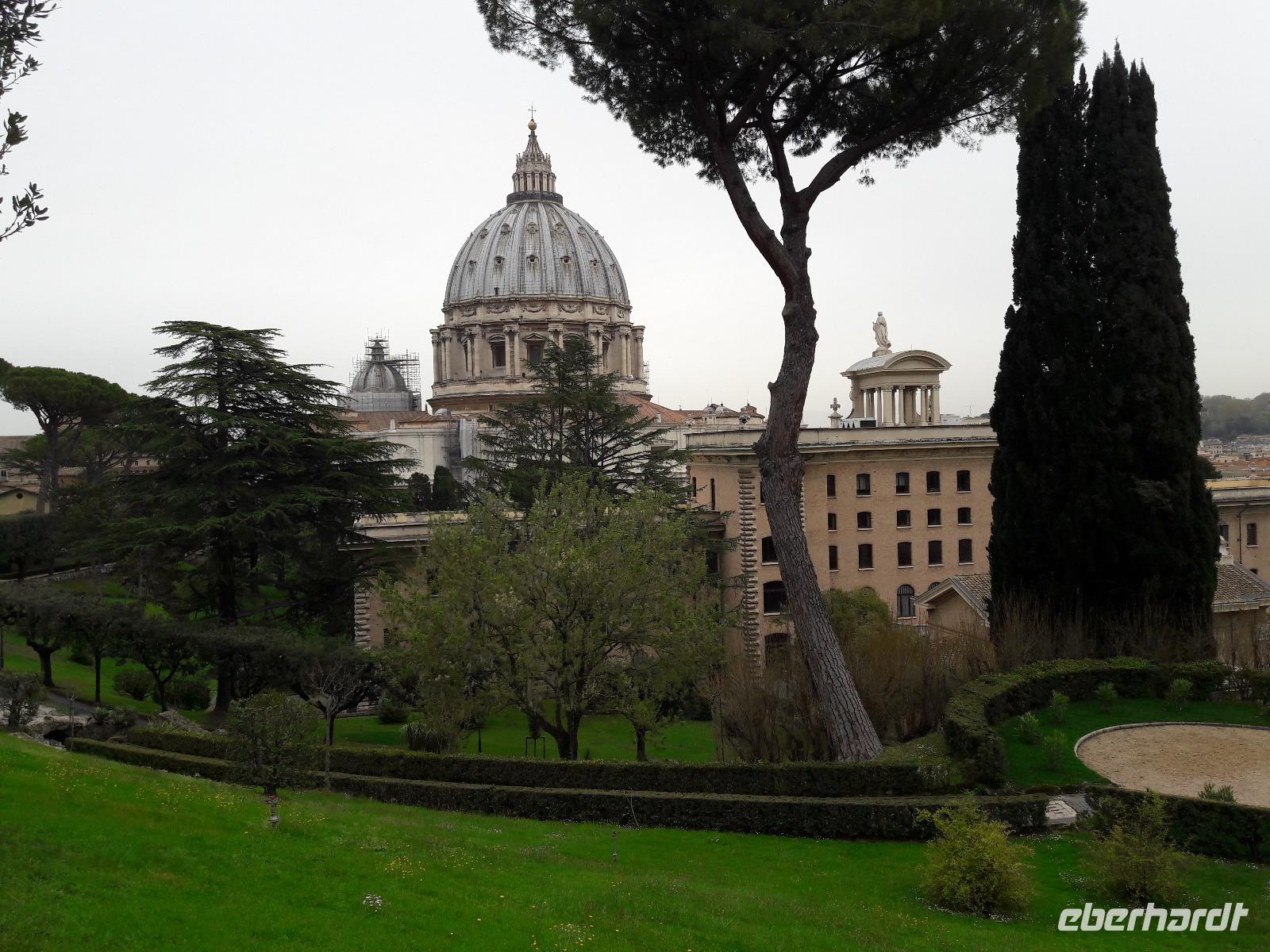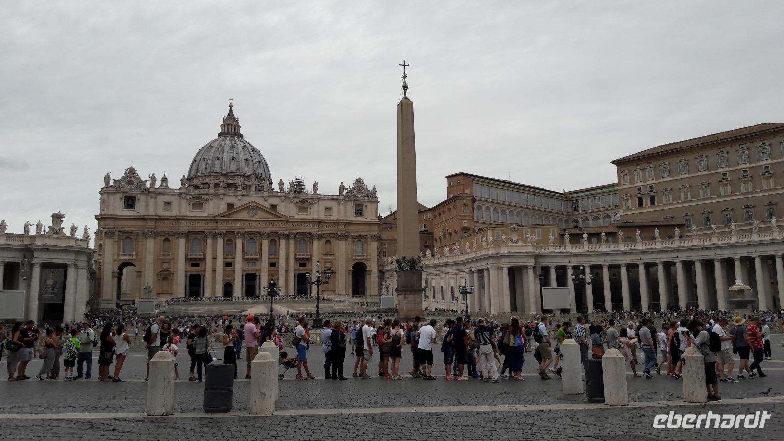 Beim Verlassen der Kirche geht unser Blick noch einmal zurück. Wir sind stark beeindruckt vom Anblick des Petersdoms, vor allem aber von der mächtigen - von Michelangelo entworfenen - Kuppel, die sich genau über dem Grab des Apostels Petrus erhebt. Danach verlassen wir den Platz aller Plätze und ohne es groß zu bemerken, verlassen wir beim Überschreiten einer weißen Linie den Vatikanstaat.