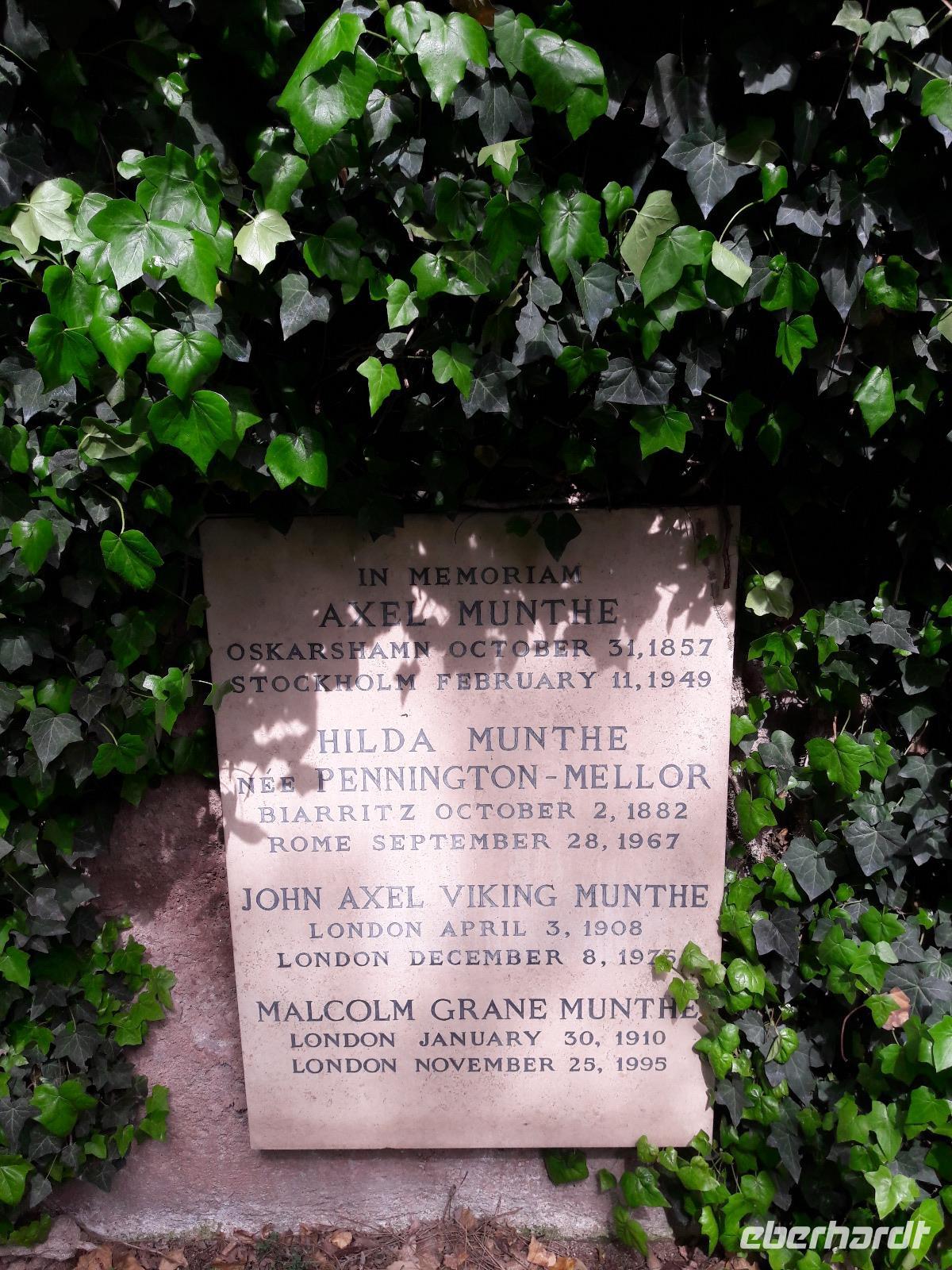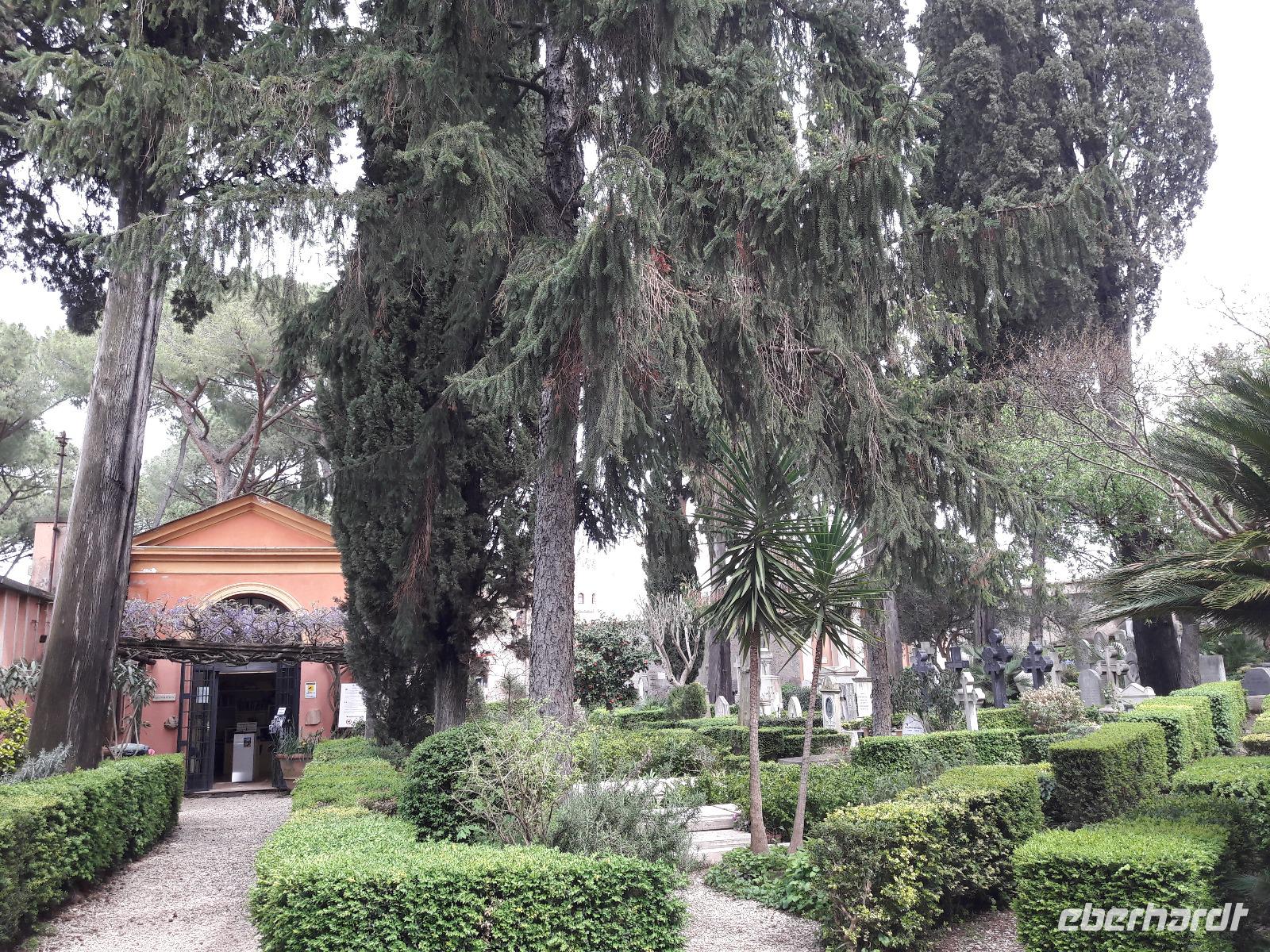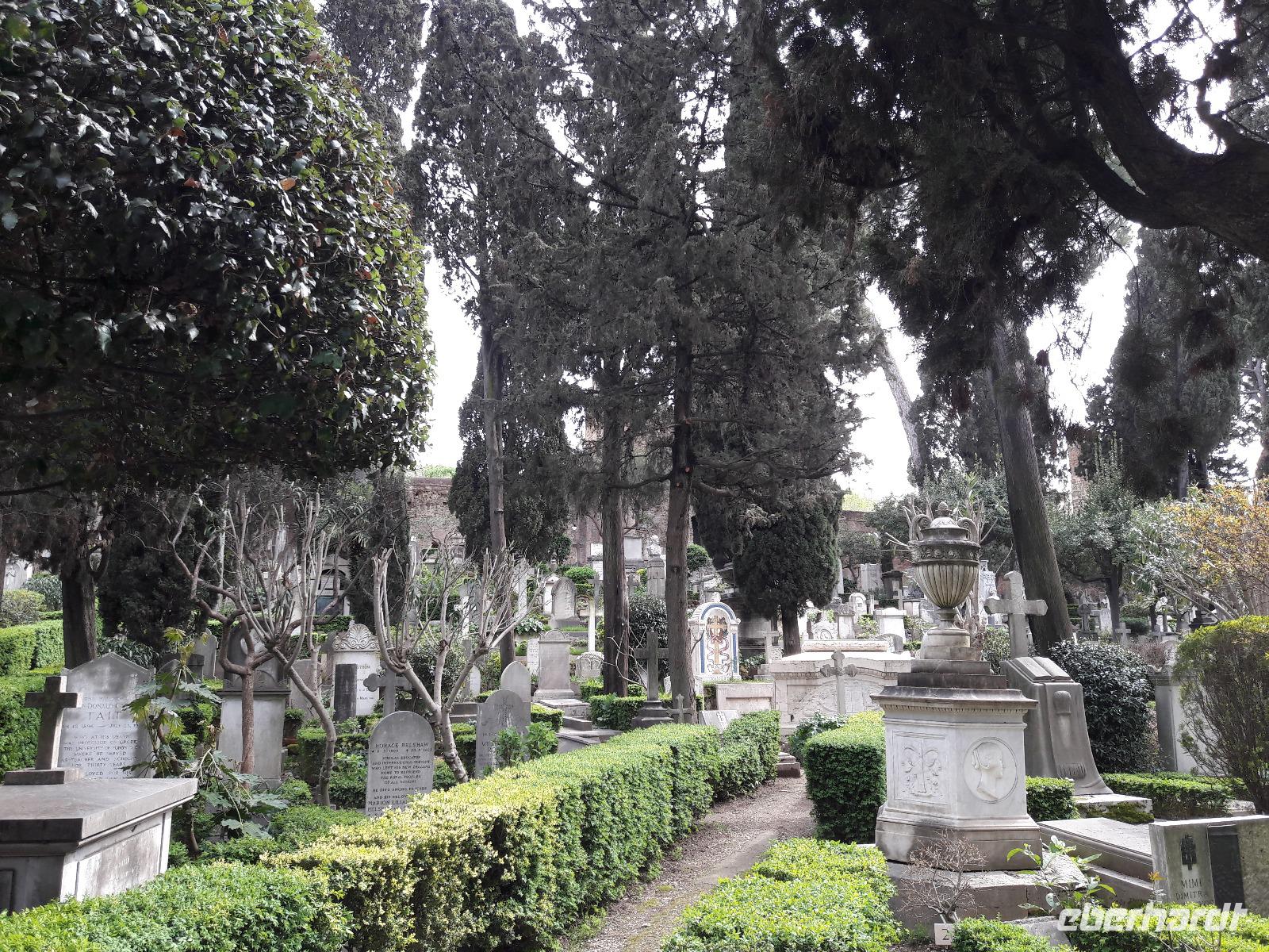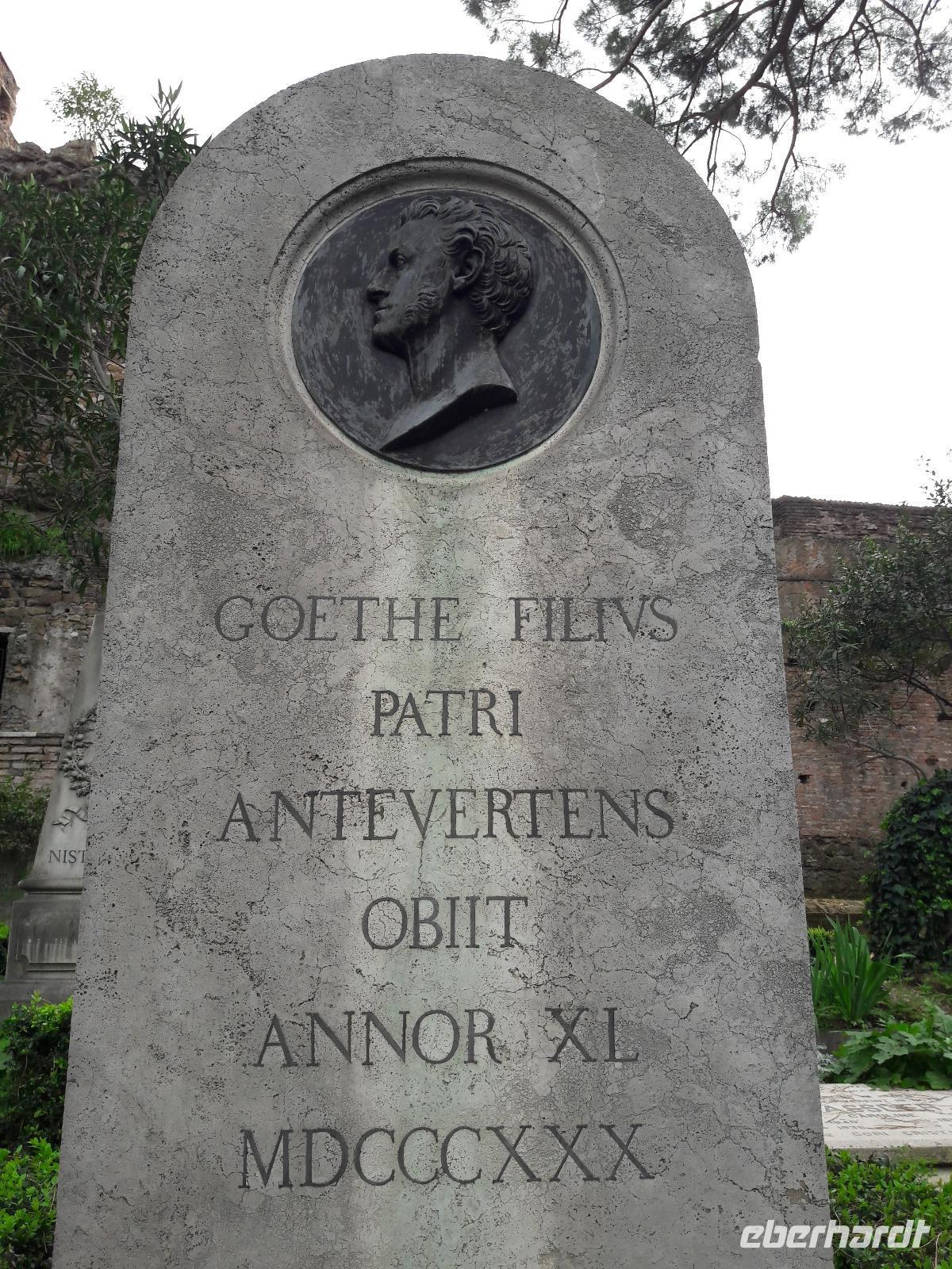 Hier ruhen u.a. die englischen Romantiker Keats und Shelley, die Gattin von Axel Munthe, einem vor allem in Neapel und Capri sehr geschätzten, schwedischen Arztes, die Schweizer Malerin Angelika Kauffmann und Gottfried Semper. Unser besonderes Interesse gilt aber dem Grab von Goethes Sohn August ("Gustl"). Für den eher schlicht wirkenden Grabstein hat J. W. v. Goethe den Grabspruch "Goethe filius patri antevertens" - "Goethes Sohn, dem Vater vorangehend", gewählt.