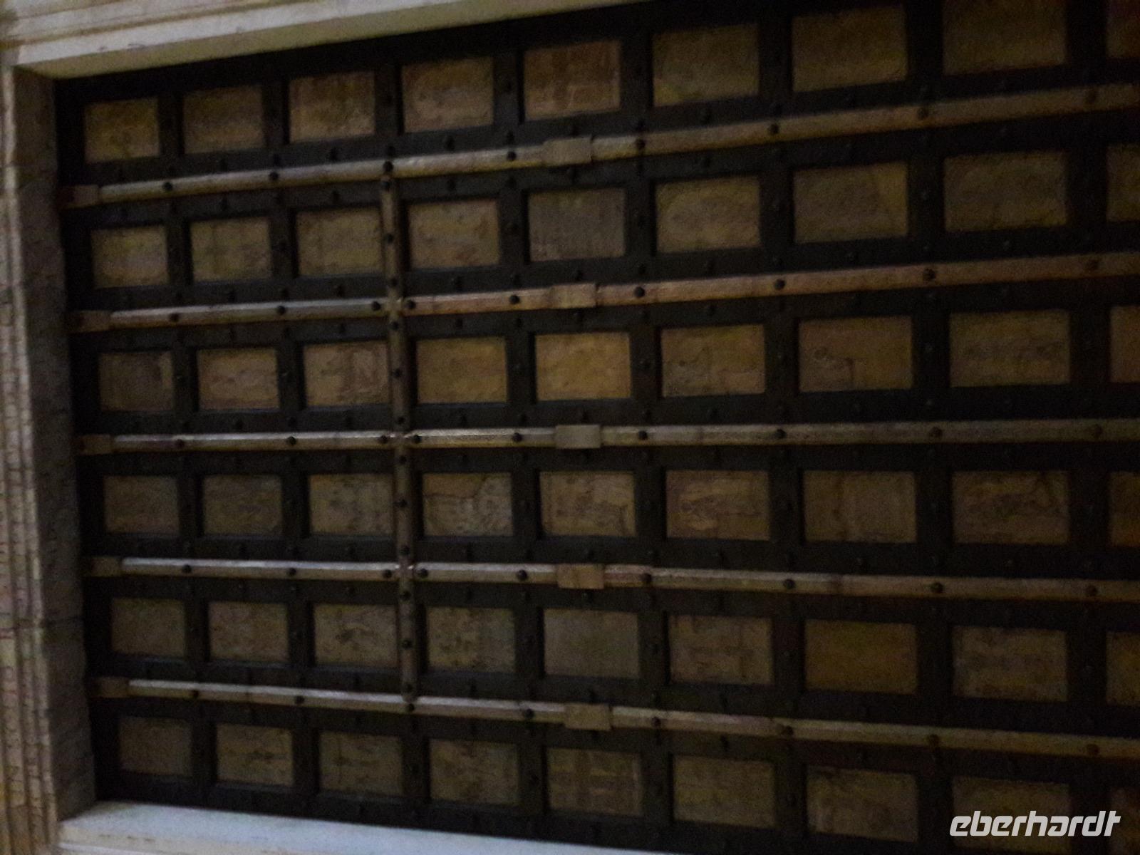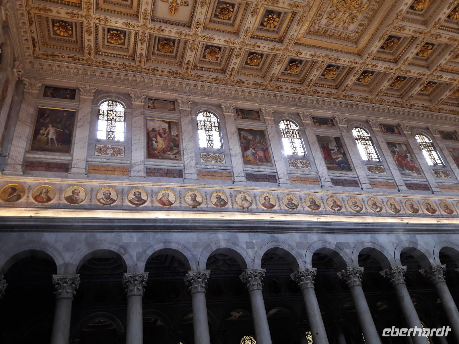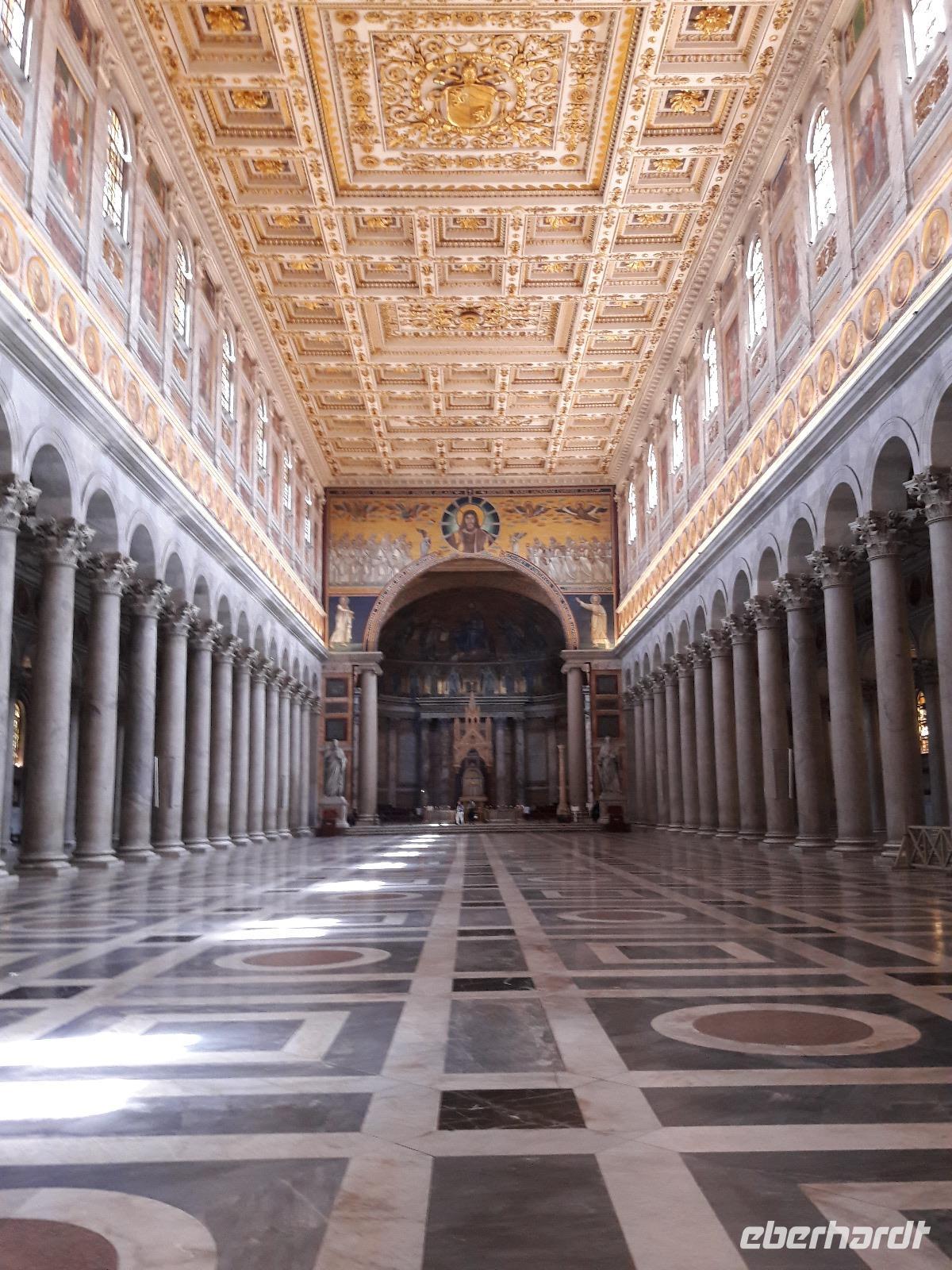 Im Anschluss an diese interessante Führung fahren wir mit der Metro (ich habe mich zwischenzeitlich wieder zu Ihnen gesellt), dem sichersten und schnellsten Verkehrsmittel Roms, bis zur Station Basilica S. Paolo. Hier besuchen wir die gleichnamige Kirche, die Kirche S. Paul vor den Mauern (San Paolo fuori le Mura). Wir sind sehr überrascht, denn uns erwartet ein recht imposanter neoklassizistischer Bau aus dem 19 Jahrhundert. Hier, an dieser Stelle soll der hl. Paulus 67 n. Ch. enthauptet worden sein. Kaiser Konstantin ließ ihm zu Ehren bereits im 4. Jh. eine Basilika errichten, die später von den Benediktinermönchen erweitert wurde. Die Basilika soll seinerzeit an Pracht sogar die Basilika von Alt-Sankt-Peter übertroffen haben. Leider hat ein Brand im Jahr 1823 die Kirche weitestgehend zerstört, gerettet wurden nur wenige Fragmente, so u.a. das Apsismosaik aus dem 13. Jh. und die aus dem 11. Jh. stammende Bronzetür (die sogenannte Heilige Pforte, die einzige von innen nicht zugemauerte Pforte - Sie erinnern sich bestimmt). Der 1854 abgeschlossene Wiederaufbau ist eine Rekonstruktion der frühchristlichen Basilika, hinzu kam 1925 noch das monumentale Säulenatrium.