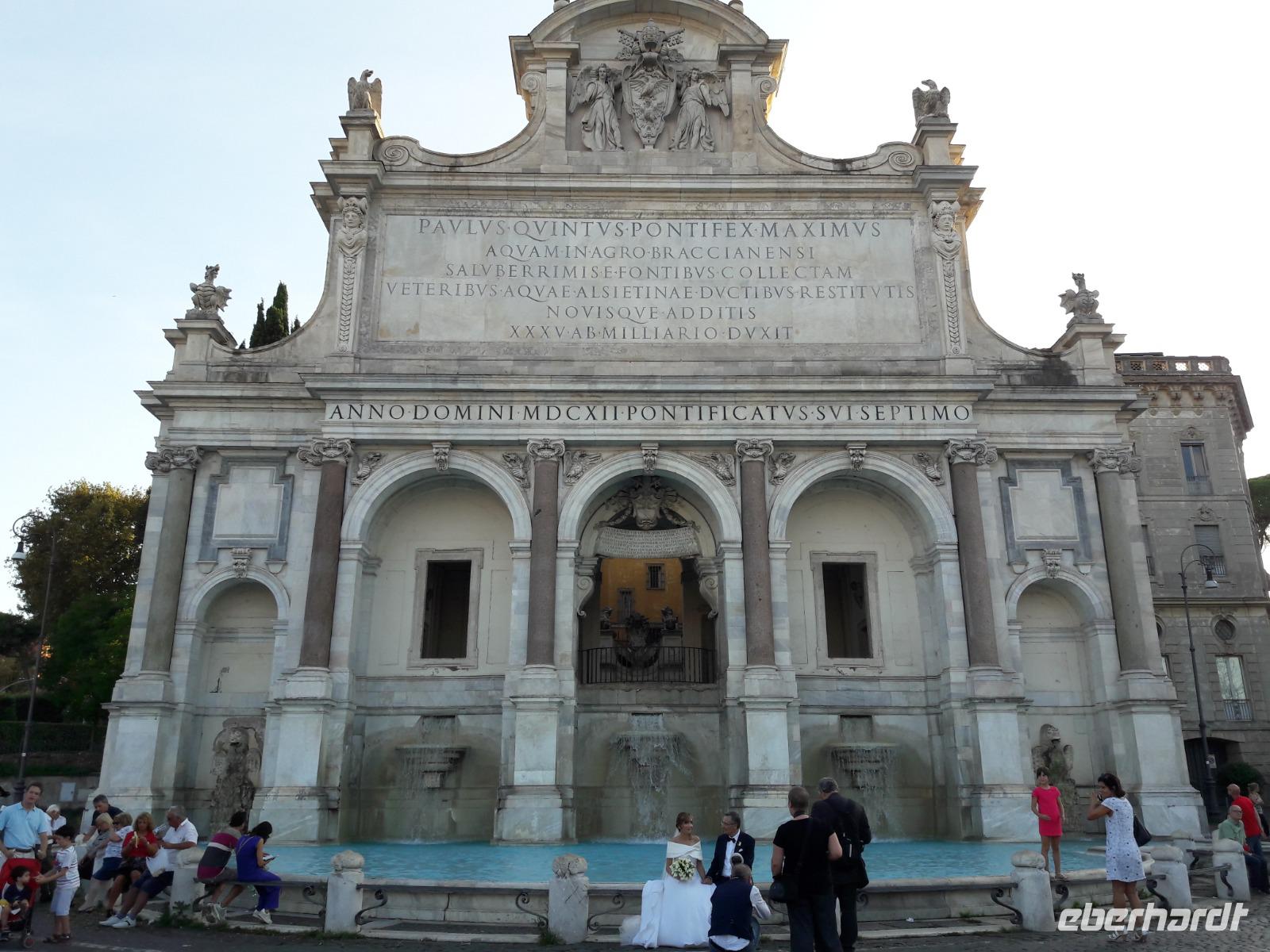Anschließend gehen wir noch zur nahegelegenen Fontana dell' Aqua Paola, wo gerade „Staraufnahmen" einer Hochzeit auf die Linse gebannt werden.