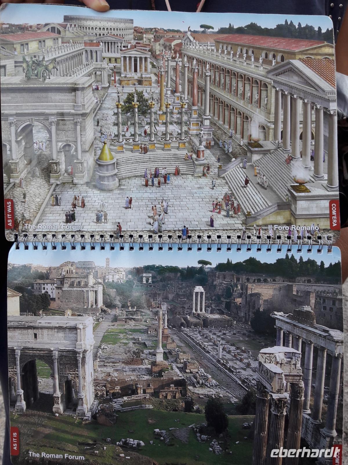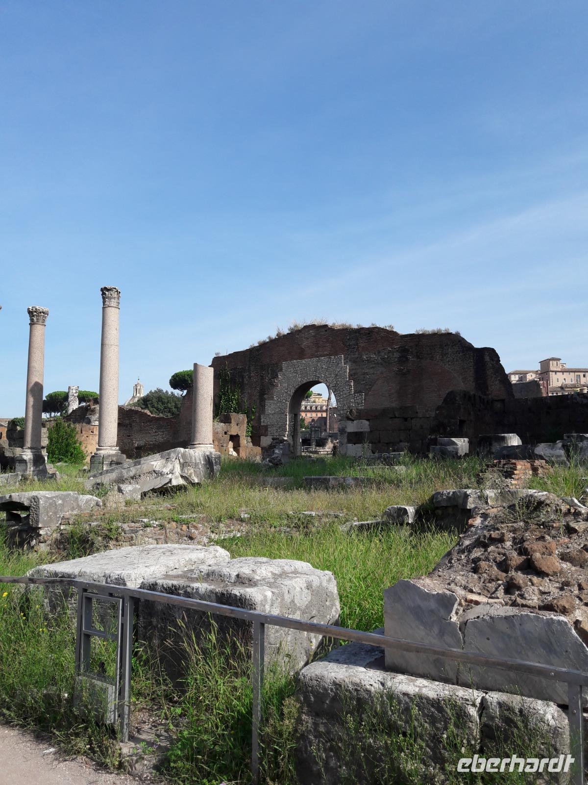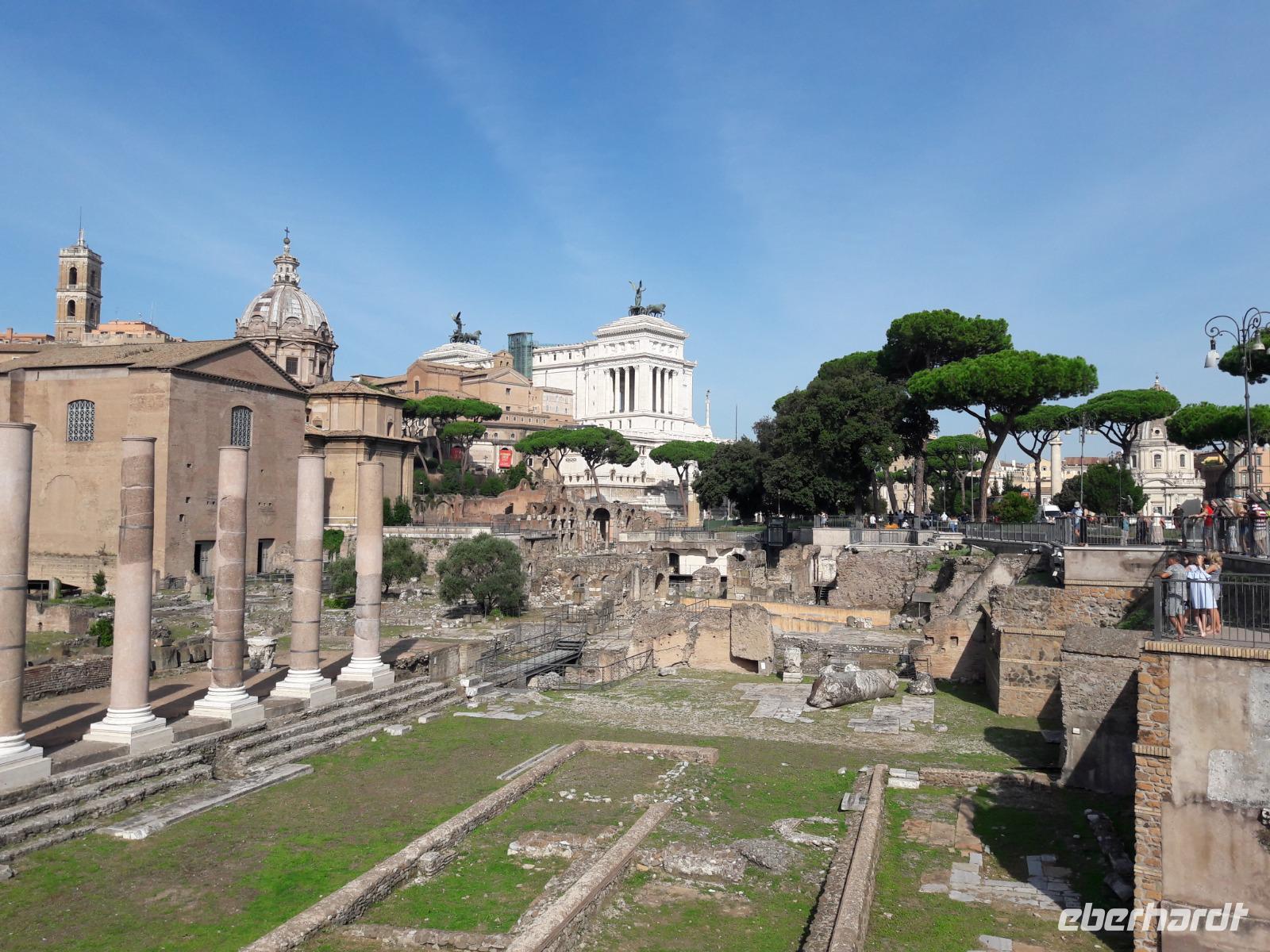Wir spazieren weiter in Richtung Via dei Fori Imperiali und werfen dabei schon einmal einen Blick in das Forum Romanum (unserem ersten Besichtigungspunkt) und auf die gegenüberliegenden Trajansmärkte, das ehemalige Einkaufscenter der Antike. Die Piazza Venezia mit dem pompösen Nationaldenkmal links liegen lassend fahren wir mit dem Bus bis zum Kolosseum, wo wir von Sylvia, unserer Stadtführerin für die nächsten beiden Tage, schon erwartet werden. Gemeinsam gehen wir auf Entdeckungstour. Unser erster Anlaufpunkt ist das FORUM ROMANUM, gelegen zwischen den Hügeln Kapitol und Palatin - einst politisches, wirtschaftliches und kulturelles Zentrum des römischen Weltreiches. Es war das Herzstück dieses Reiches, wo sich quasi das römische Alltagsleben abspielte. Heute ist es ein Park mit Ruinen aus verschiedenen Epochen des römischen Reiches.
